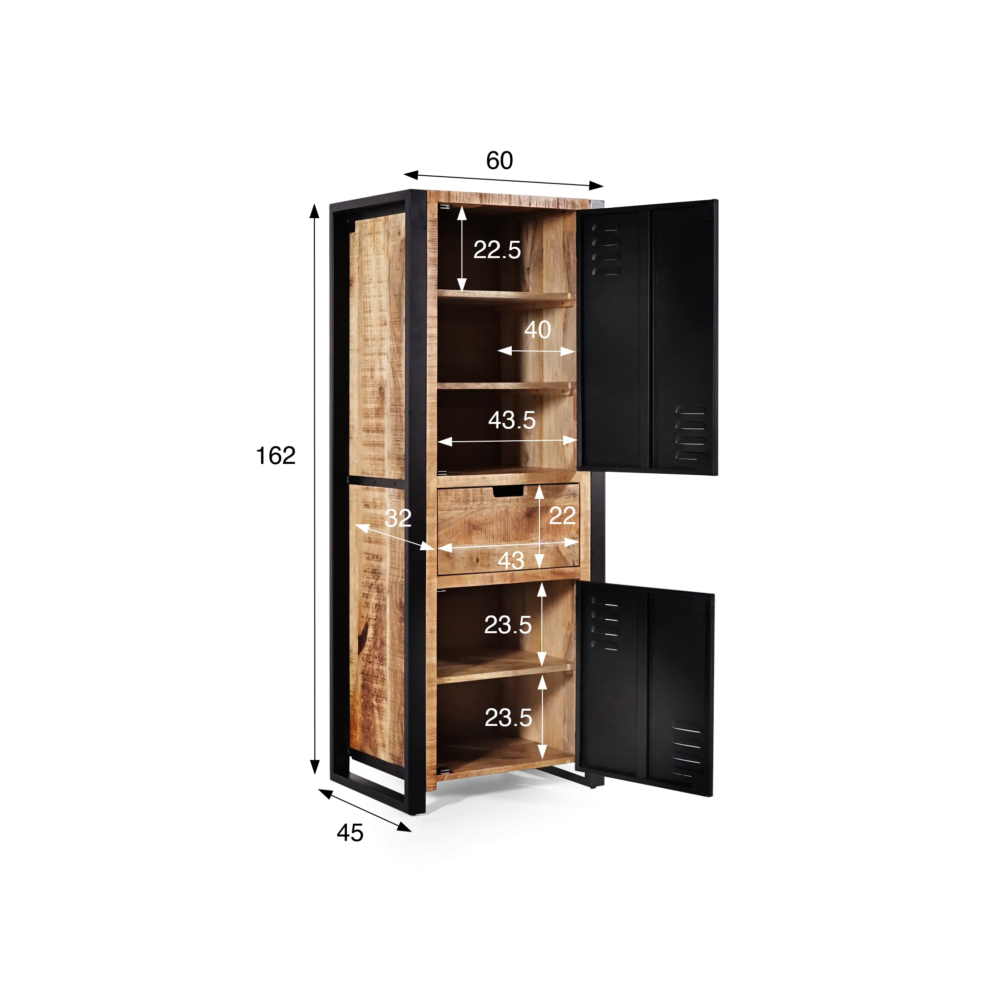 Im Inneren dieses Massivholzschranks aus Mangoholz mit Metalltür haben wir praktische und unkomplizierte Volumen gestaltet: Hinter der oberen Tür bieten zwei feste Regalböden Stauraum von jeweils 22,5 cm Höhe — ideal für Bücher, Geschirr oder gefaltete Wäsche. Das Fach misst 43,5 cm Breite und 40 cm Tiefe, ein komfortables Format für vielseitige Aufbewahrung. Im unteren Bereich ermöglichen zwei Fächer mit jeweils 23,5 cm Höhe die Organisation von Alltagsgegenständen oder dekorativen Körben.