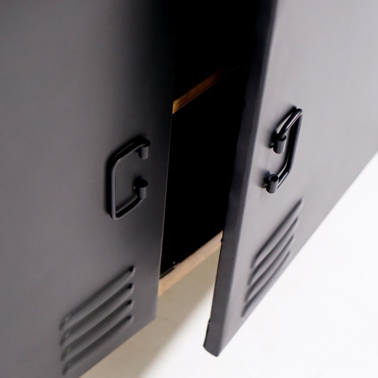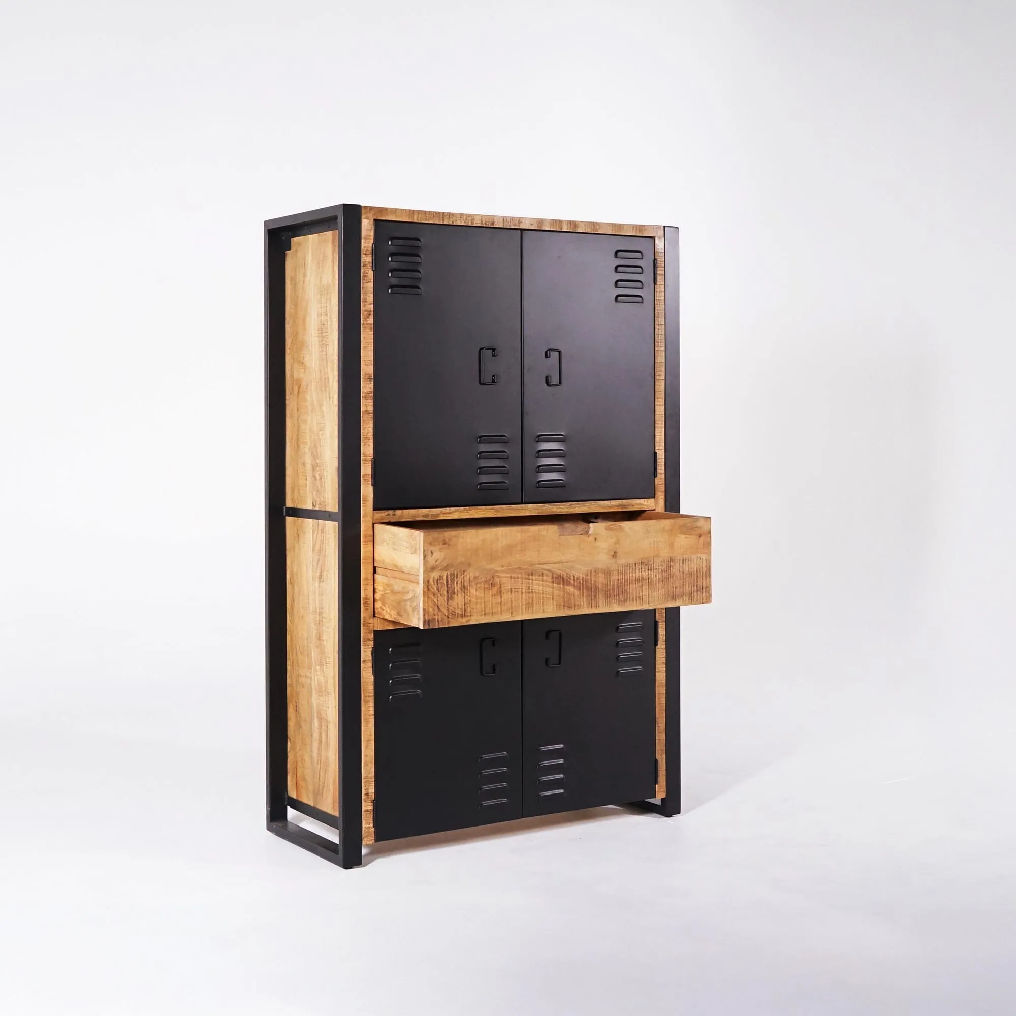Der Kansas-Schrank aus massivem Mangoholz mit Metalltüren besteht aus vier Drehtüren, inspiriert von alten Industriespinden, deren gelochte Fronten und röhrenförmige Griffe den authentischen Charakter klassischer Werkstattmöbel widerspiegeln. Zwischen den Türen befindet sich eine breite zentrale Schublade aus massivem Mangoholz, die großzügigen und leicht zugänglichen Stauraum bietet; ihre leicht strukturierte Front bringt eine ehrliche, fast rohe Note ein, die das Licht je nach Tageszeit anders einfängt.