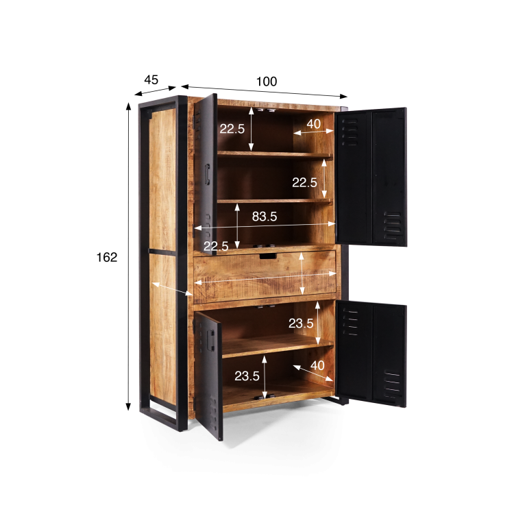 Im Inneren dieses Schranks aus massivem Mangoholz mit Metalltüren haben wir Einfachheit und Funktionalität bevorzugt. Die oberen Fächer bieten drei feste Regalböden mit jeweils 22,5 cm Höhe – ideal für Geschirr, Bücher oder Haushaltswäsche. Der untere Bereich umfasst zwei offenere Ebenen von 23,5 cm Höhe, perfekt für sperrigere Gegenstände. Die nutzbare Innenbreite von 83,5 cm ermöglicht komfortables Verstauen, ohne Einschränkungen, von allem, was stets griffbereit sein soll.