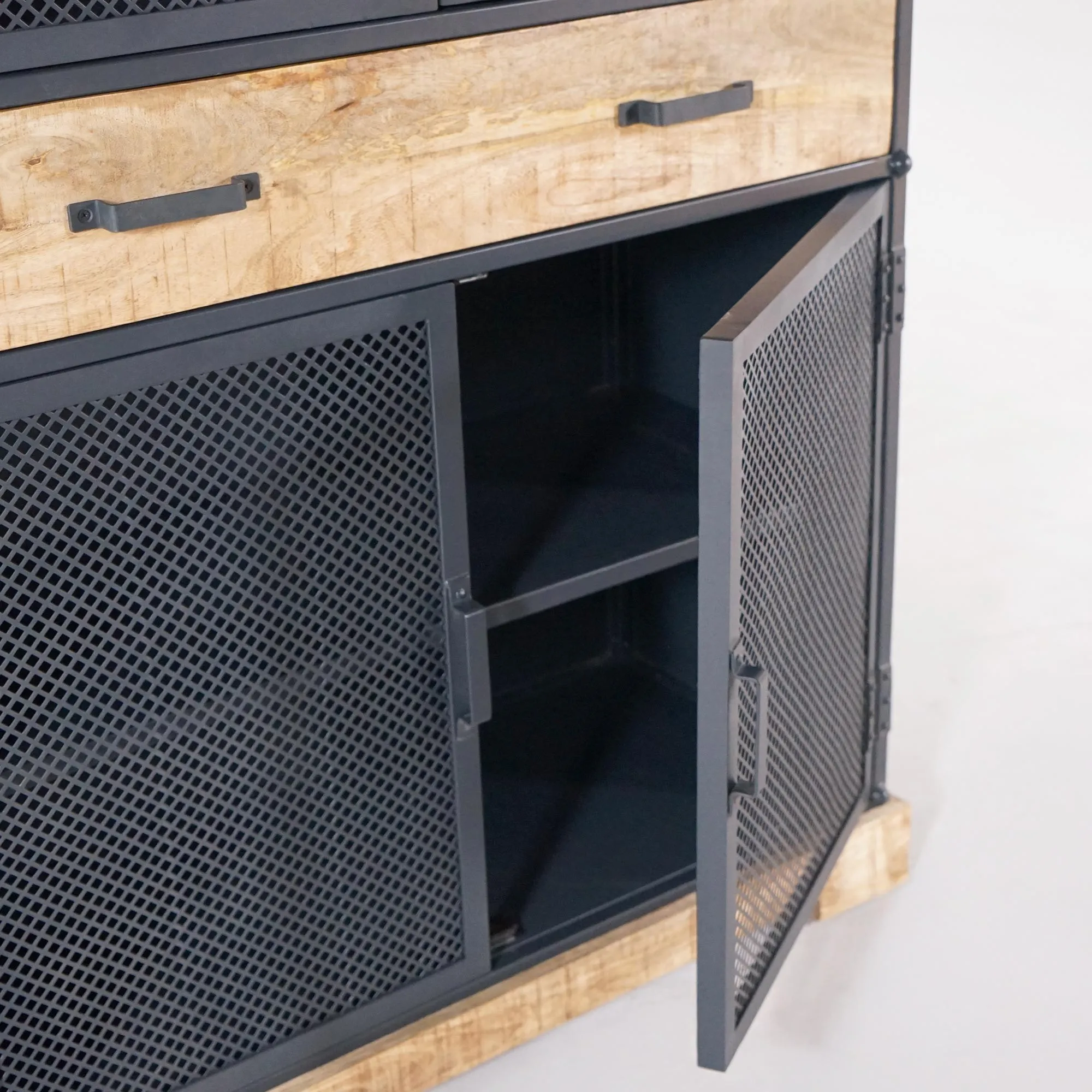 Wir wollten bei diesem Metall- und Holzschrank den rauen Geist der Werkstatt bewahren, mit Gittertüren aus Metall, die einen Blick ins Innere erlauben und zugleich optische Leichtigkeit schaffen. Der Kontrast zwischen der Wärme des Mangoholzes und der kühlen Strenge des Metalls erzeugt eine subtile Harmonie – typisch für die Cambridge-Kollektion. Die mattschwarzen Oberflächen, genieteten Metallgriffe und der massive Holzsockel verleihen dem Möbel ein ausgewogenes Erscheinungsbild und außergewöhnliche Stabilität.