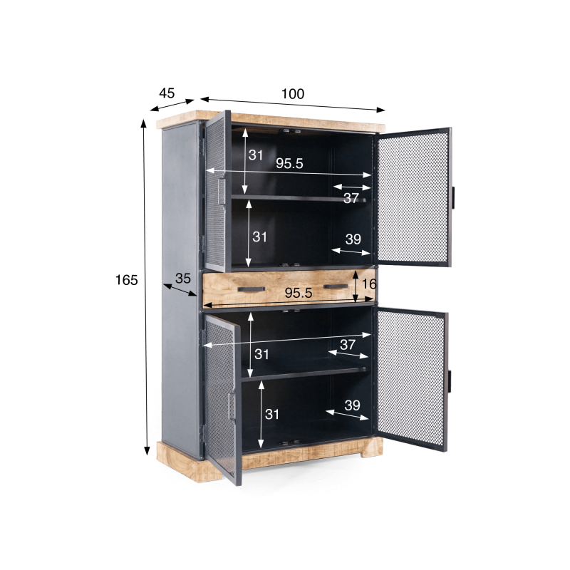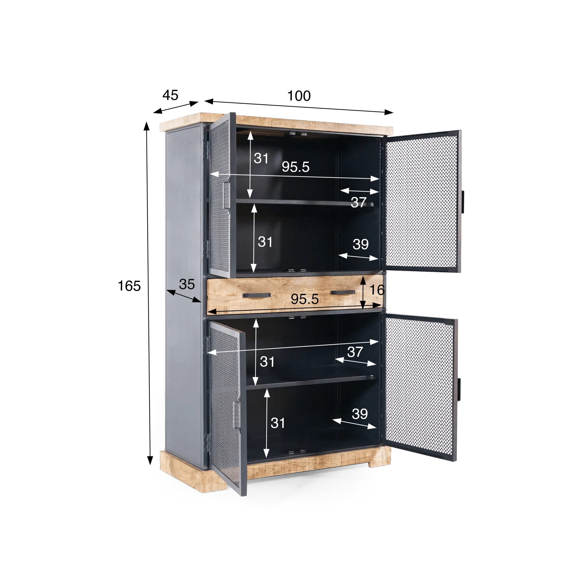 Der Metall- und Holzschrank Cambridge besticht zunächst durch seine imposante, perfekt proportionierte Struktur: 165 cm hoch, mit vier Fächern, die durch gelochte Drehtüren verschlossen werden, sowie einer großzügigen mittleren Schublade mit 95,5 cm Breite und 16 cm Höhe. Diese Aufteilung wurde entwickelt, um vielseitigen Stauraum zu bieten — ideal für Geschirr, Haushaltswäsche, Dokumente oder Dekorationsobjekte. Jedes Fach, 31 cm hoch und 37 bis 39 cm tief je nach Ebene, bietet praktischen, leicht zugänglichen Platz und nutzt jeden Zentimeter dieses klar gestalteten Möbelstücks optimal aus.