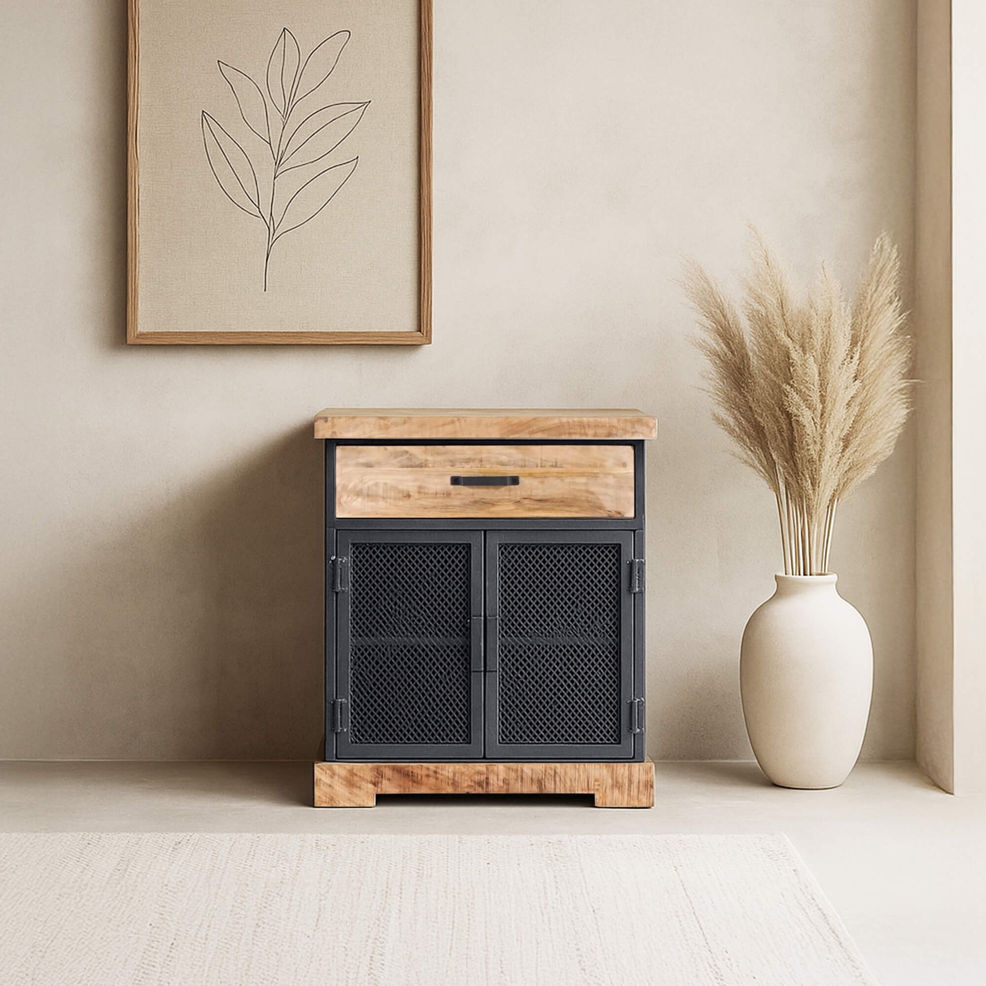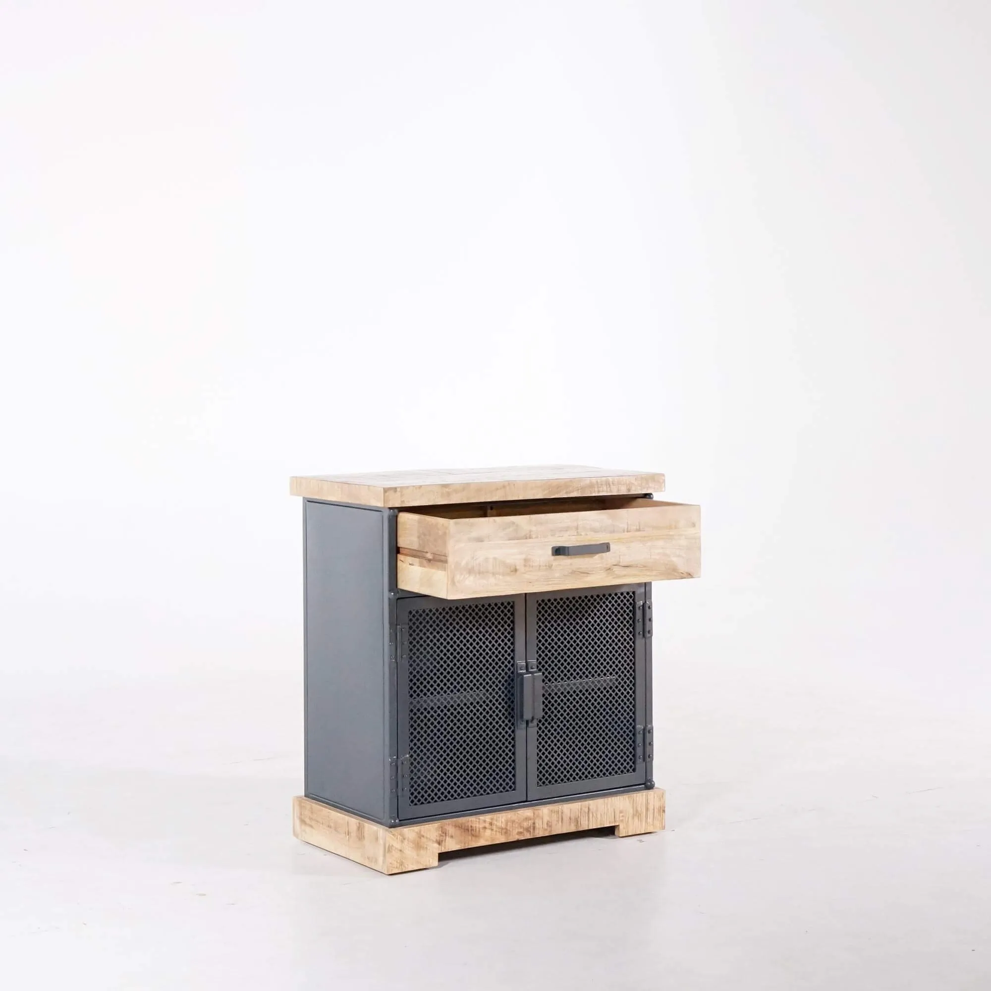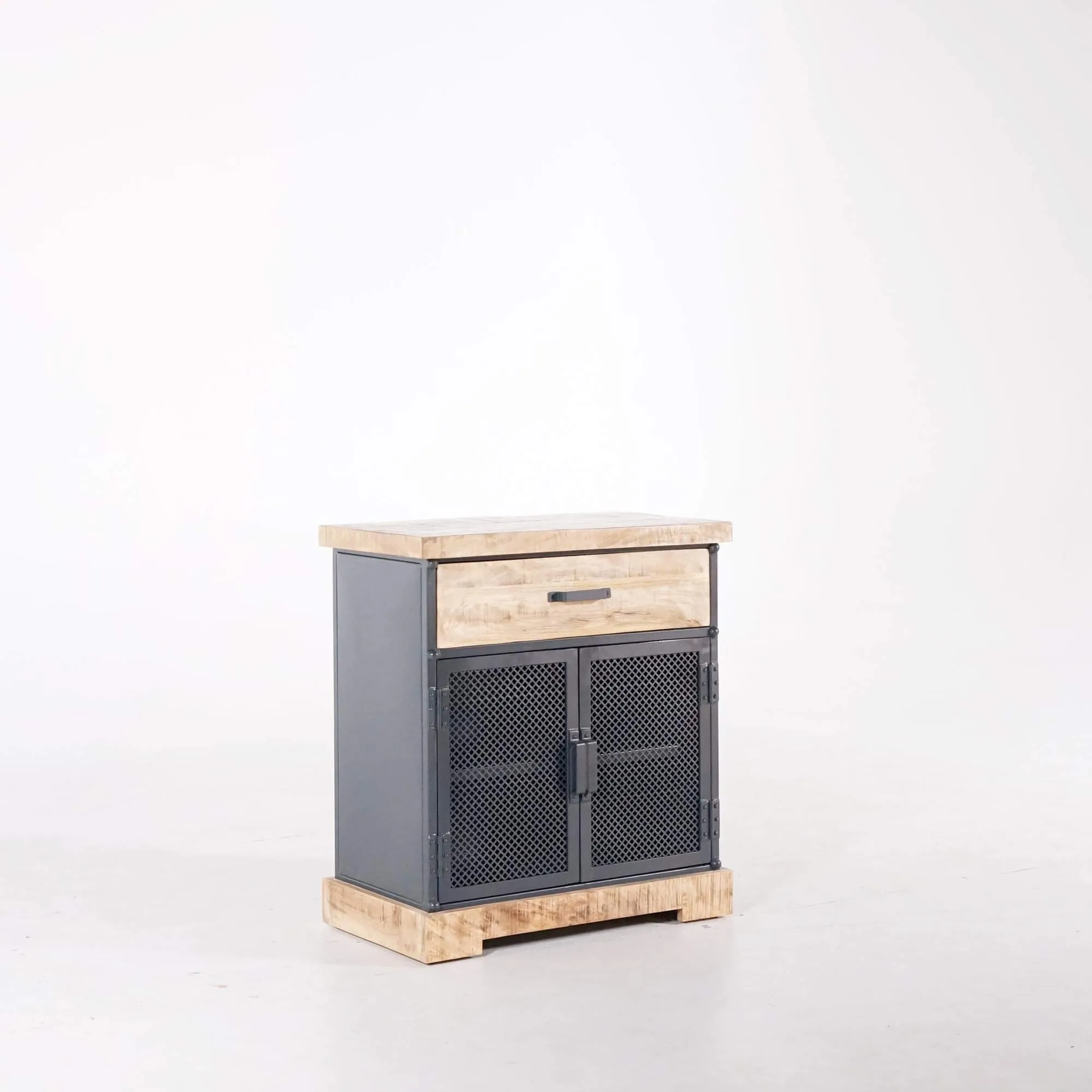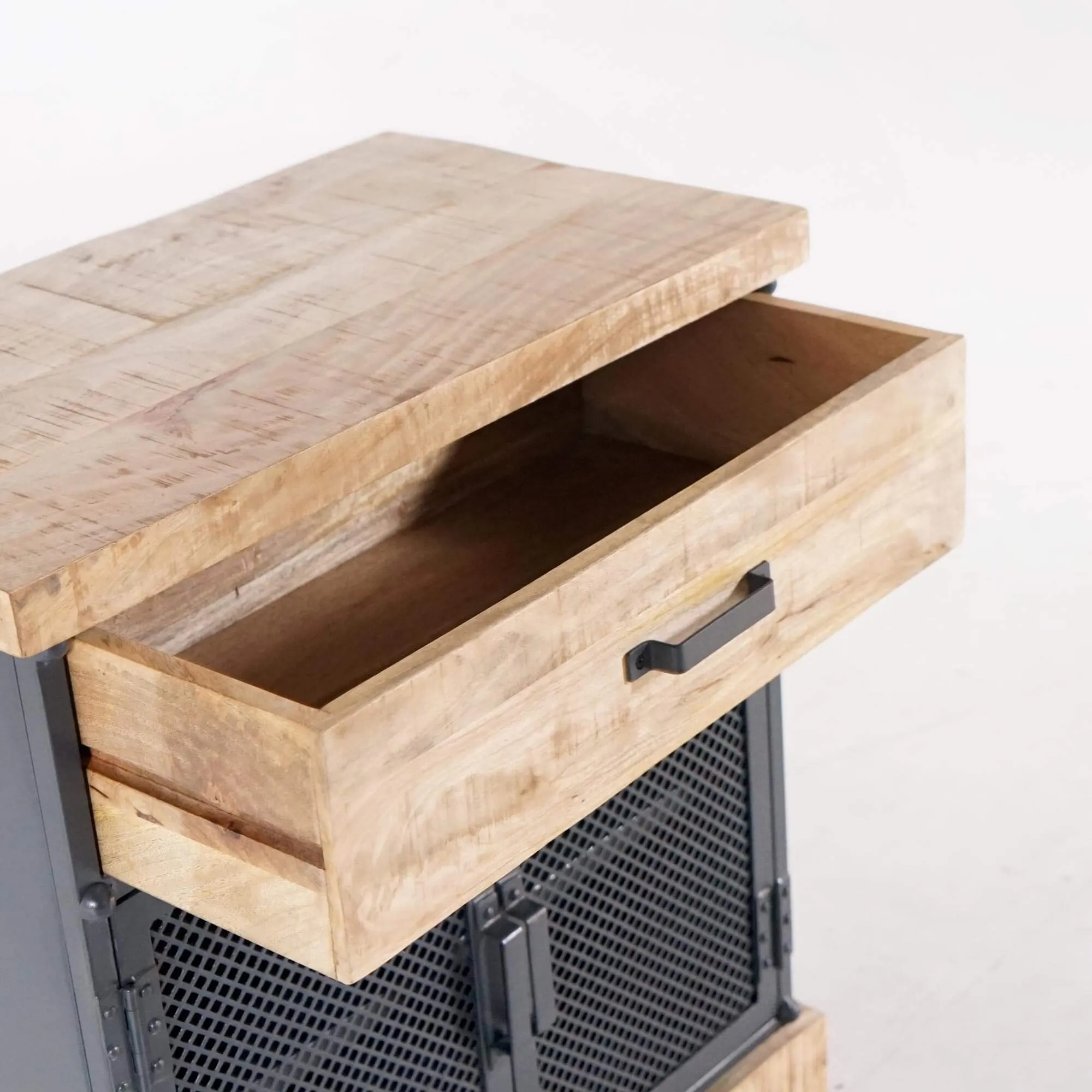 Wir wollten, dass dieses kleine industrielle Sideboard aus Metall und Holz unsere handwerkliche Qualitätsanforderung widerspiegelt: authentische Oberflächen, stabile Verbindungen, ausgewogene Proportionen und ein Design, das mit dem Rest der Kollektion harmoniert. Es wird vollständig montiert geliefert und steht für einen nachhaltigen Ansatz in der Möbelgestaltung.