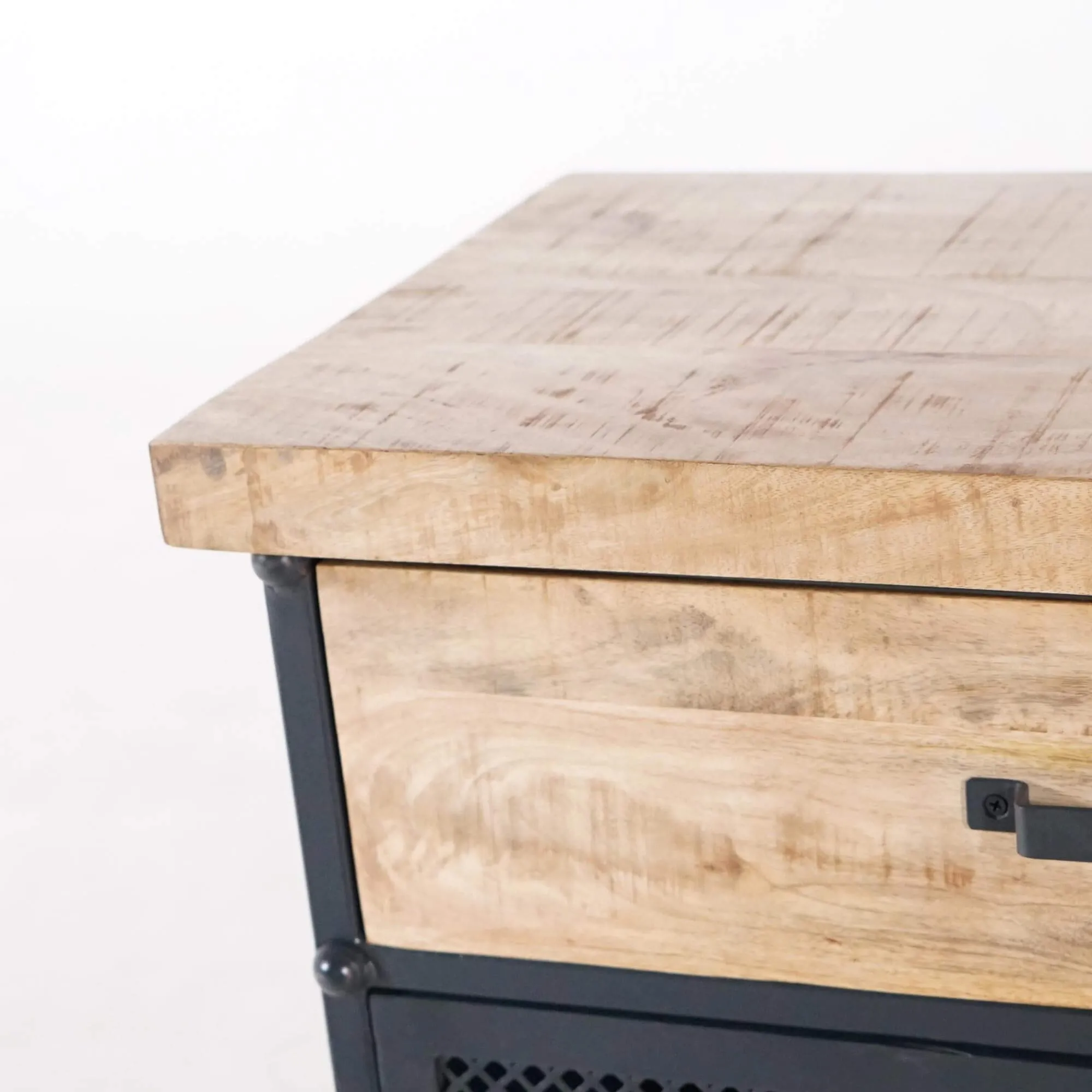 Unser Ziel bei der Gestaltung dieses kleinen industriellen Sideboards aus Metall und Holz war es, ein funktionales, robustes und charaktervolles Möbelstück zu schaffen, das sich sowohl in ein Wohnzimmer als auch in einen Flur, eine Küche oder ein Büro einfügt. Das Mangoholz, ausgewählt wegen seines hellen Tons und seiner natürlichen Maserung, verleiht Wärme und Authentizität, während das perforierte Metall an die industrielle Vergangenheit englischer Werkstätten erinnert. Diese Kombination verleiht dem Cambridge-Sideboard einen markanten Charakter mit einer leichten und ausgewogenen Optik.