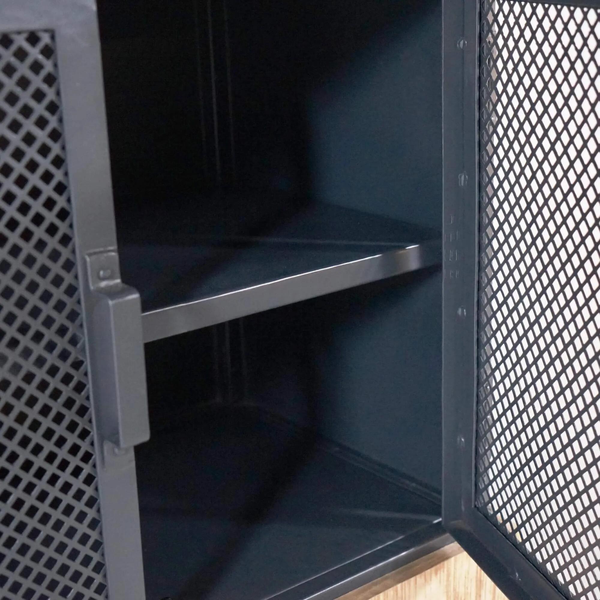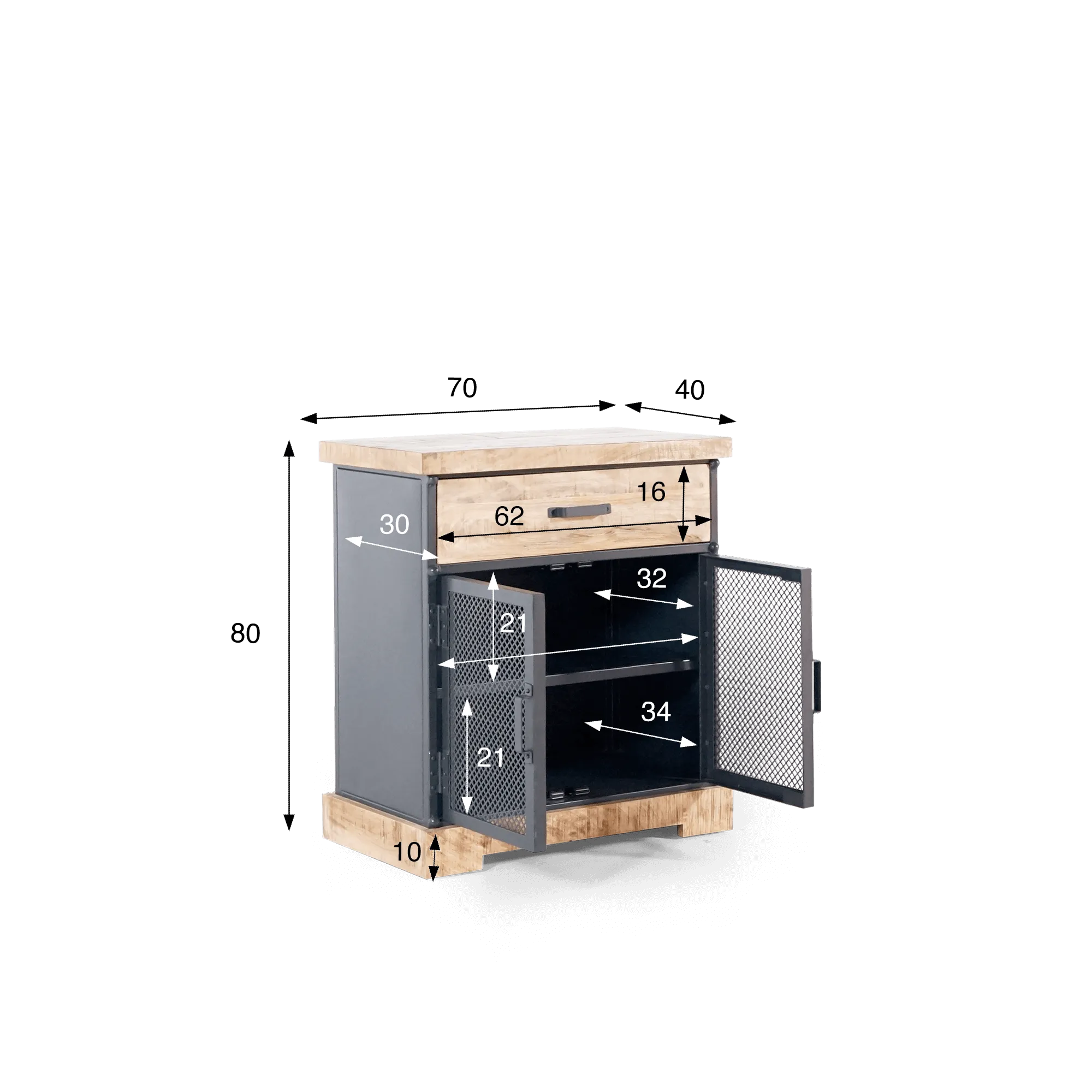 Unter der massiven Holzplatte befindet sich eine großzügige Schublade von 62 cm Breite und 16 cm Höhe, ideal zum Verstauen kleiner Alltagsgegenstände. Darunter verbergen zwei perforierte Metalltüren einen praktischen Stauraum mit einem Zwischenboden. Jedes Fach bietet eine nutzbare Höhe von etwa 21 cm und eine Tiefe von 32 bis 34 cm – perfekt für Geschirr, Tischwäsche oder Dokumente.