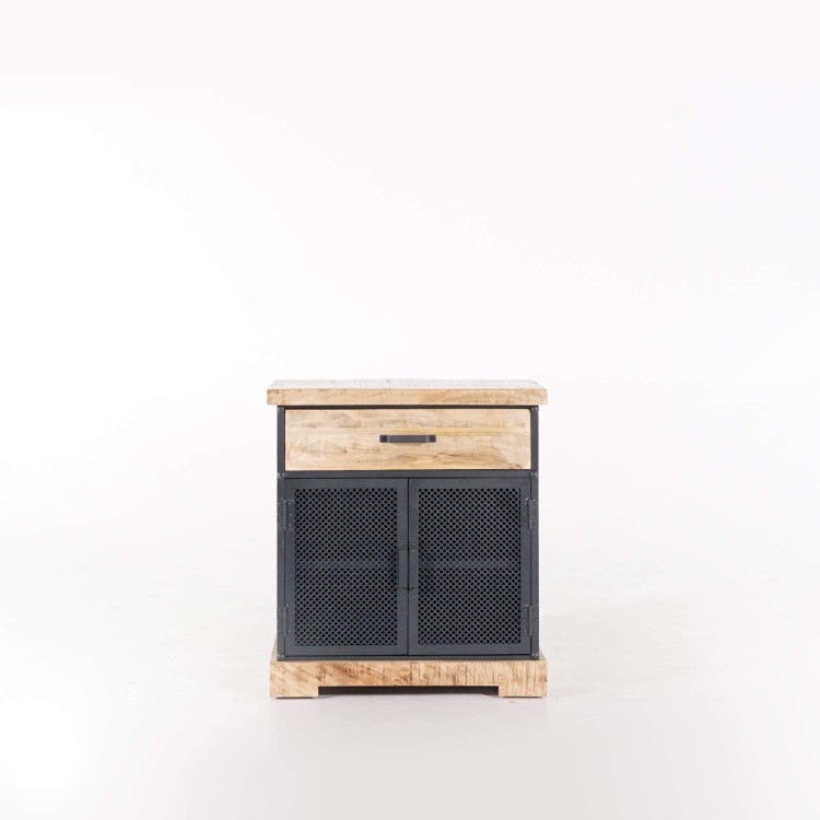 Wir haben dieses kleine industrielle Sideboard aus Metall und Holz aus der Kollektion Cambridge als ein kompaktes und zugleich ausdrucksstarkes Möbelstück entworfen, das den Geist des britischen Industriedesigns in einem Format von 80 cm Höhe, 70 cm Breite und 40 cm Tiefe vereint. Dieses Möbel, geschaffen für moderne Wohnräume, kombiniert massives Mangoholz mit einer matten schwarzen Metallstruktur zu einem harmonischen und eleganten Kontrast.