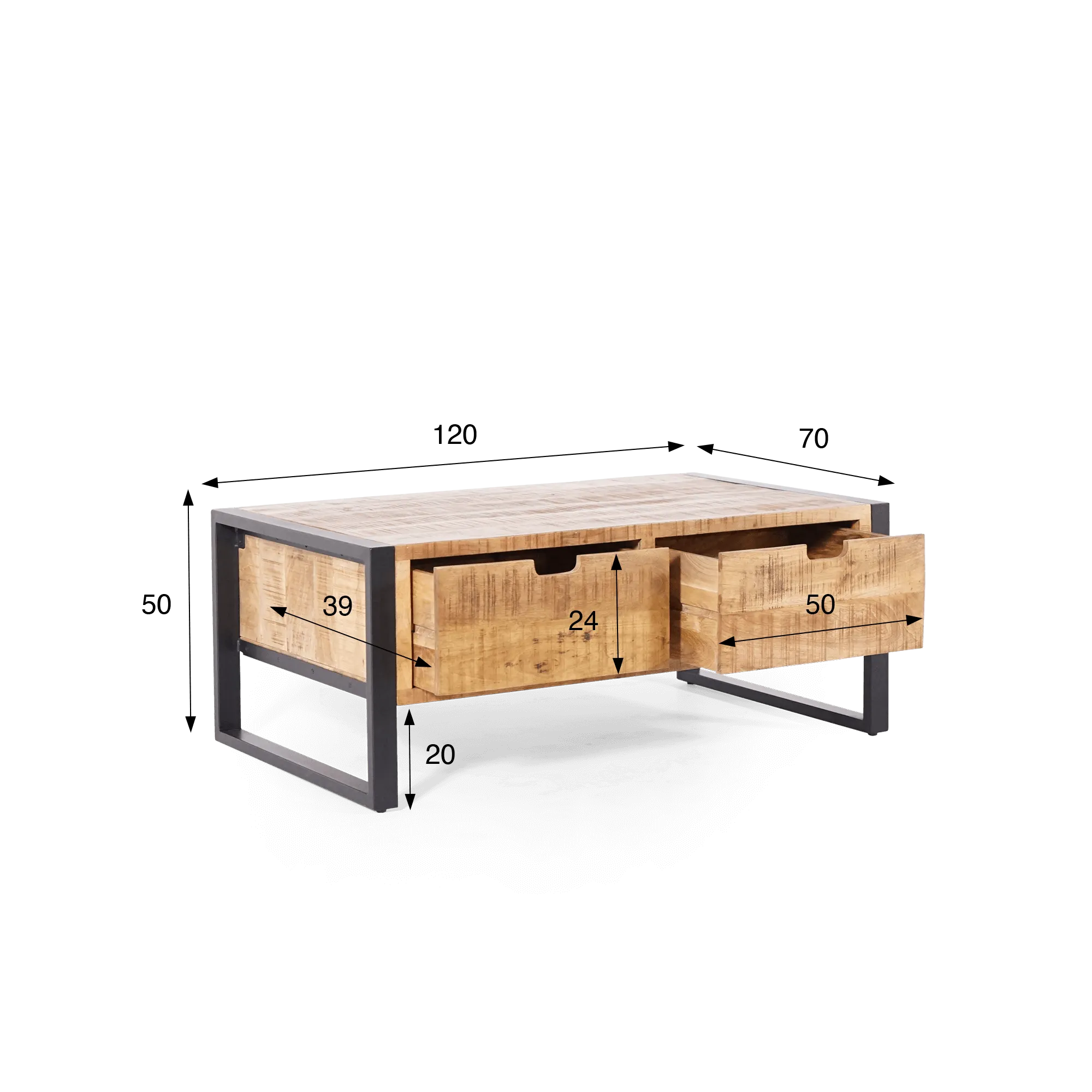 Der Wohnzimmertisch aus massivem Mangoholz Kansas bietet eine großzügige Fläche von 120 × 70 cm – ideal für gemeinsame Momente wie auch voor alltägliche Gegenstände. Unter der Tischplatte haben wir zwei geräumige Schubladen integriert, damit alles griffbereit bleibt: Jede Schublade ist 39 cm tief und 24 cm hoch und bietet Platz für Magazine, leichte Plaids, Accessoires oder Fernbedienungen. Die Griffmulde ohne sichtbare Henkel unterstreicht die schlichte Linienführung und sorgt gleichzeitig für eine intuitive Handhabung.