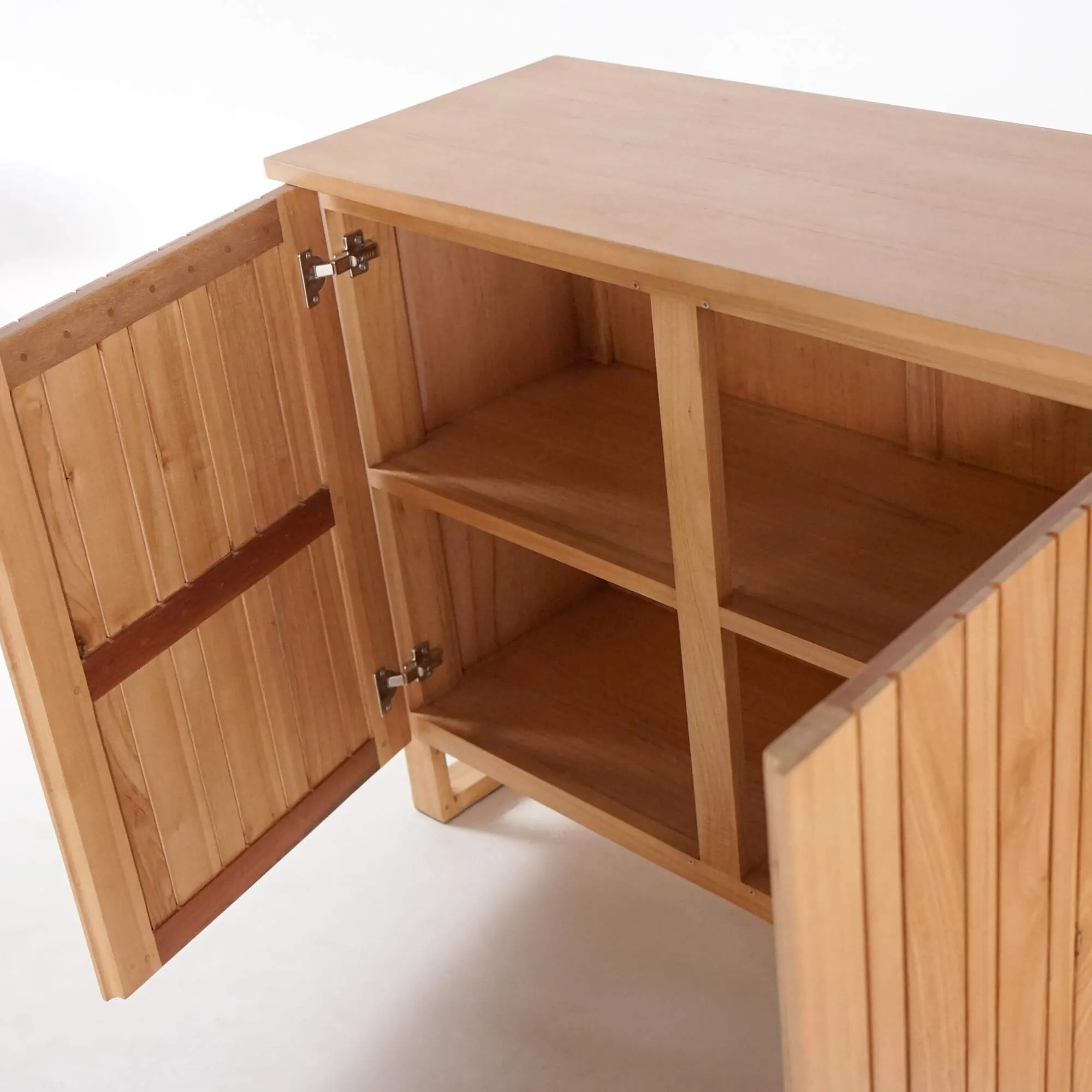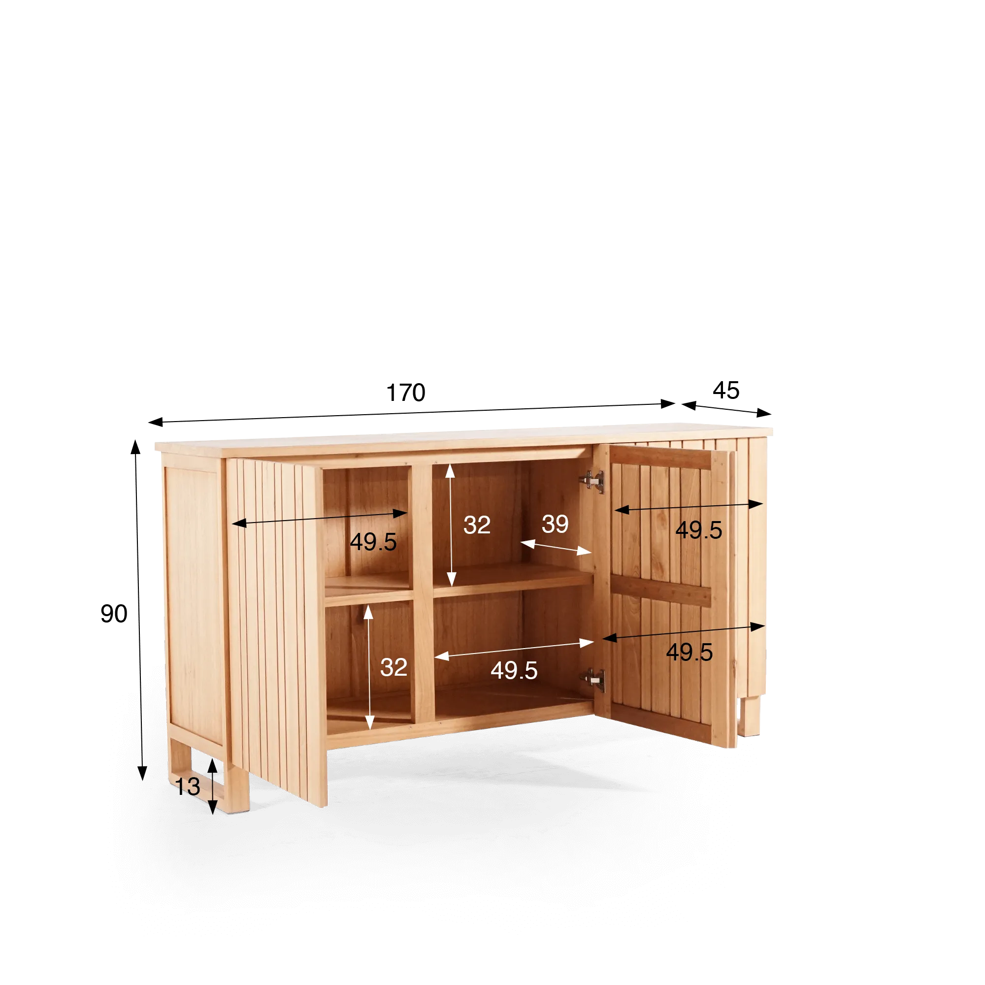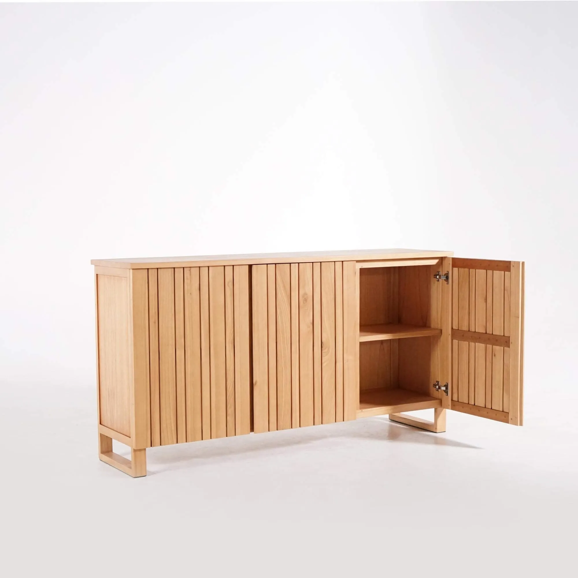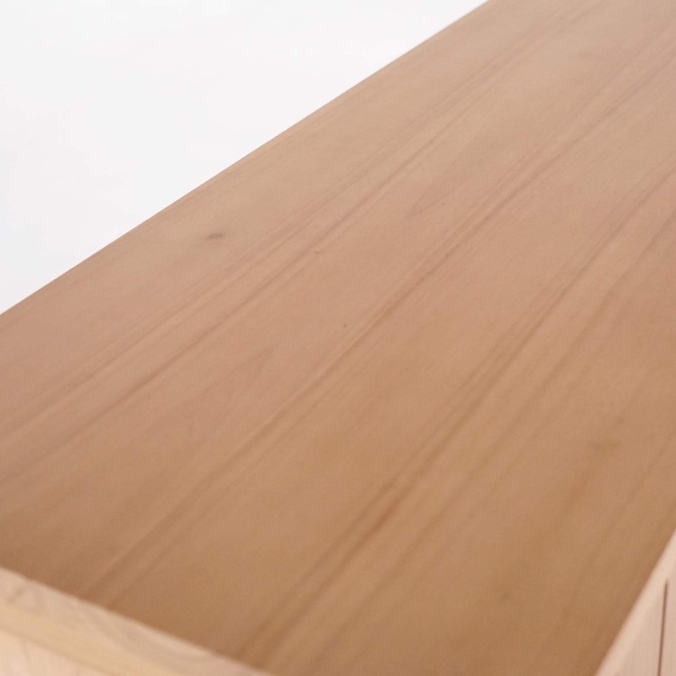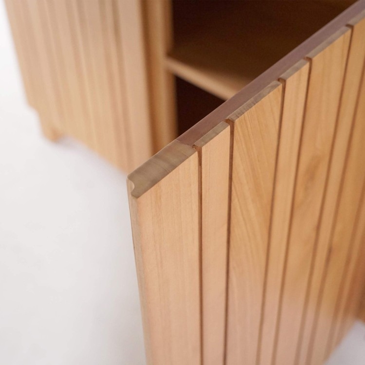 Die drei Drehtüren dieses Massivholz-Sideboards verbergen großzügigen Stauraum, der den Alltag erleichtern soll. Hinter jeder Tür befinden sich Fächer mit 49,5 cm Breite und 32 cm Innenhöhe, ideal zum Verstauen von Geschirr, Heimtextilien oder Dekorationsobjekten. Die auf 39 cm Tiefe angepassten Regalböden bieten viel Volumen und bewahren dennoch eine leichte Silhouette. Wir haben auf sorgfältige Handwerkskunst geachtet: sanft abgerundete Kanten, die seidenmatte Holztextur und stabile Verbindungen zeugen von kontinuierlicher Liebe zum Detail.