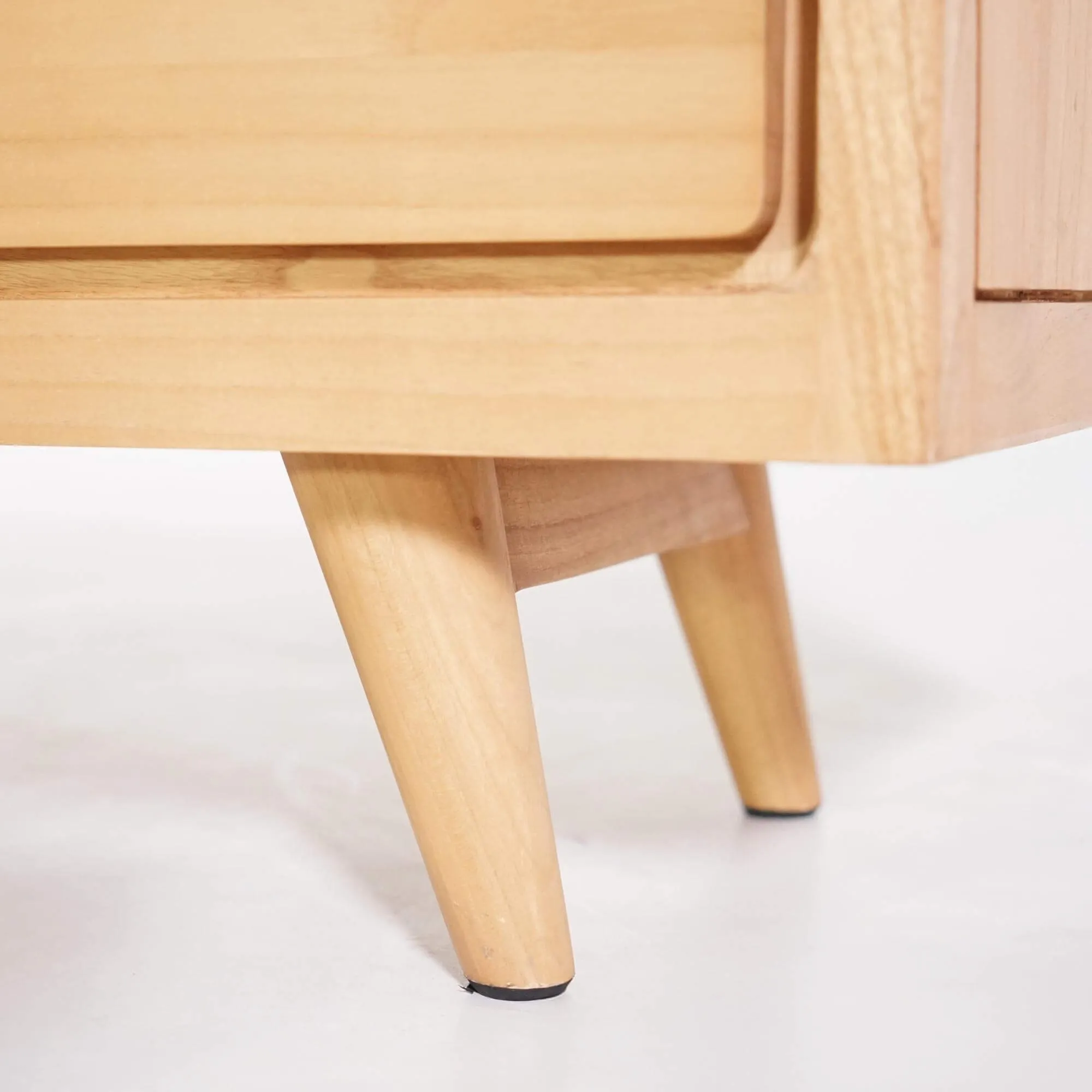 Wir haben bewusst leicht geneigte, konische Füße gewählt, die typisch für die nordische Ästhetik sind, um dem Ganzen Leichtigkeit und Stabilität zu verleihen. Mit einer Höhe von 15,5 cm hebt sich das Möbel optisch vom Boden ab, verstärkt das luftige Gefühl und erleichtert die tägliche Reinigung. Die Wahl von Mindi-Holz war selbstverständlich: Seine Robustheit und die sanfte Patina verkörpern perfekt den skandinavischen Geist, den wir mit dieser Kollektion vermitteln wollten.