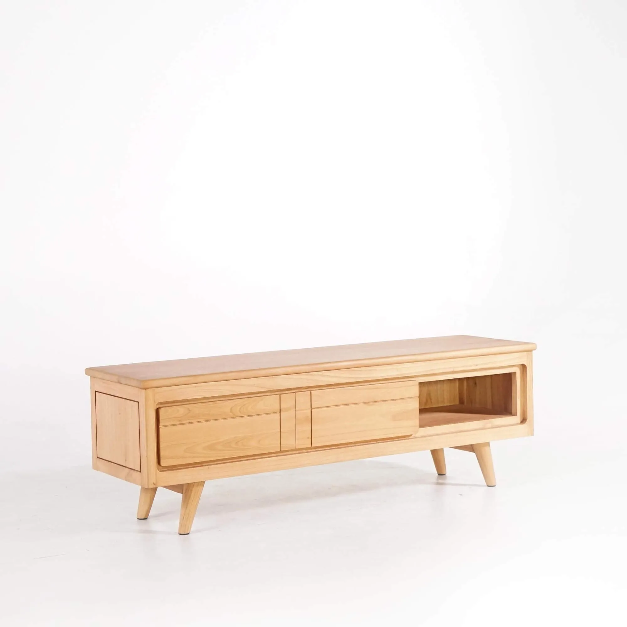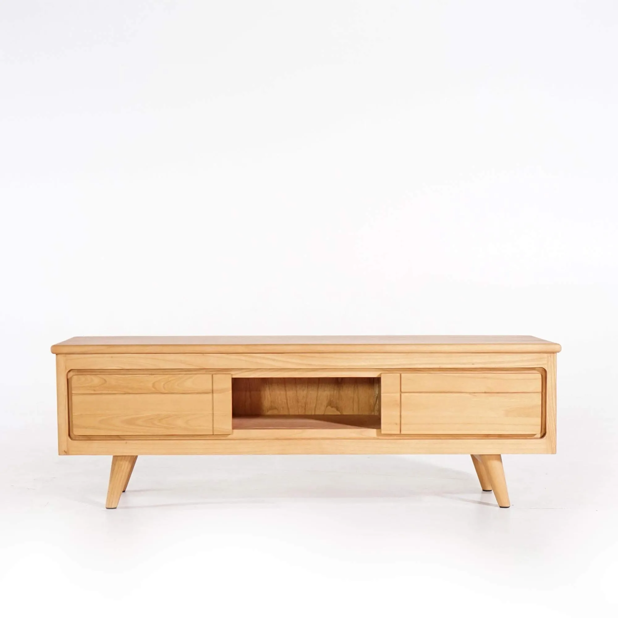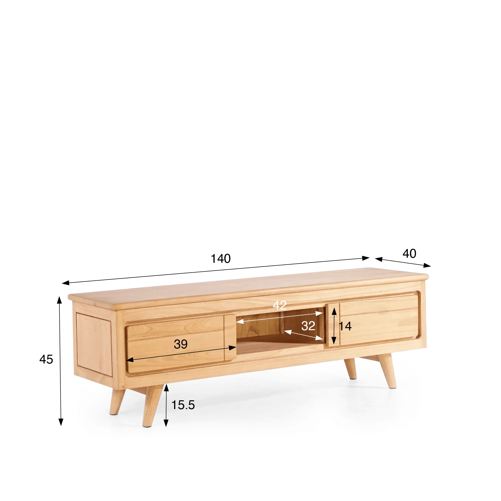 Die Front dieses TV-Möbels aus Massivholz wird durch zwei Schiebetüren belebt, die den Stauraum dezent verbergen. Ihre intuitive Öffnung ermöglicht einen einfachen Zugriff auf Multimediageräte oder Alltagsgegenstände und bewahrt gleichzeitig ein geordnetes, harmonisches Erscheinungsbild. Der offene Mittelteil eignet sich ideal für einen Player oder eine Konsole, während die gut durchdachten Maße (42 cm Breite, 32 cm Tiefe und 14 cm Höhe) die Integration Ihrer Geräte erleichtern. Mit seiner Länge von 140 cm, Tiefe von 40 cm und Höhe von 45 cm fügt sich das Möbelstück mühelos in das Wohnzimmer ein und balanciert zwischen Diskretion und Funktionalität.