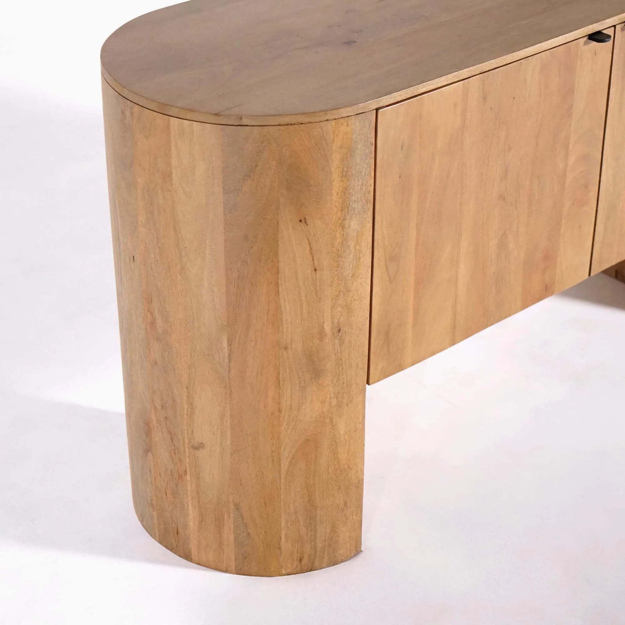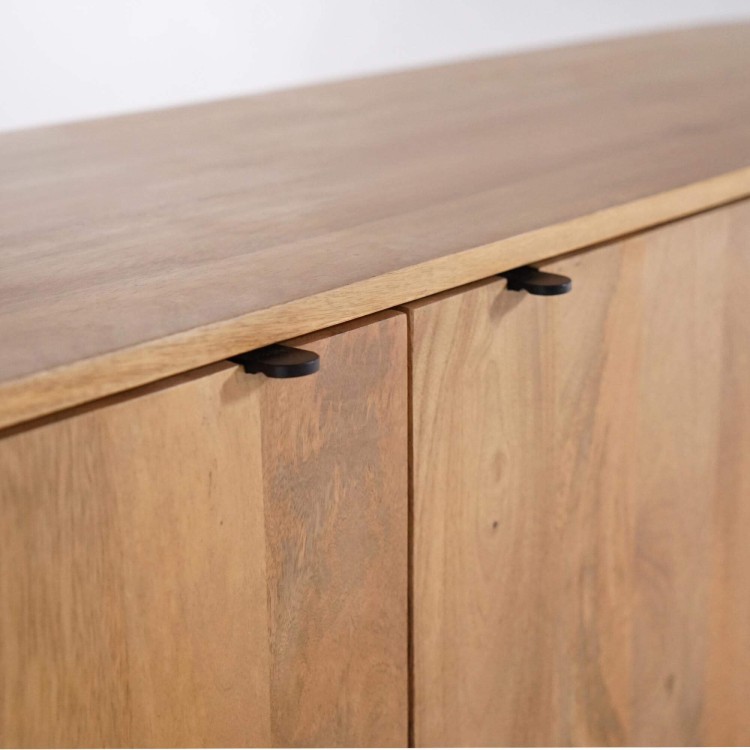 Gefertigt aus massivem Mangoholz, offenbart das massive Holz-Sideboard mit 2 Türen Timea ein warmes, lebendiges Holz, dessen natürliche Nuancen je nach Lichteinfall subtil variieren. Die Maserung bleibt bewusst sichtbar und verleiht dem Möbel eine visuelle Tiefe, die sich im Laufe des Tages verändert. Die Oberfläche fühlt sich weich an und ist sorgfältig bearbeitet, ohne übermäßigen Glanz, um die Authentizität des Materials zu bewahren. Diese direkte, unverfälschte Beziehung zum Holz prägt die Identität der Kollektion.