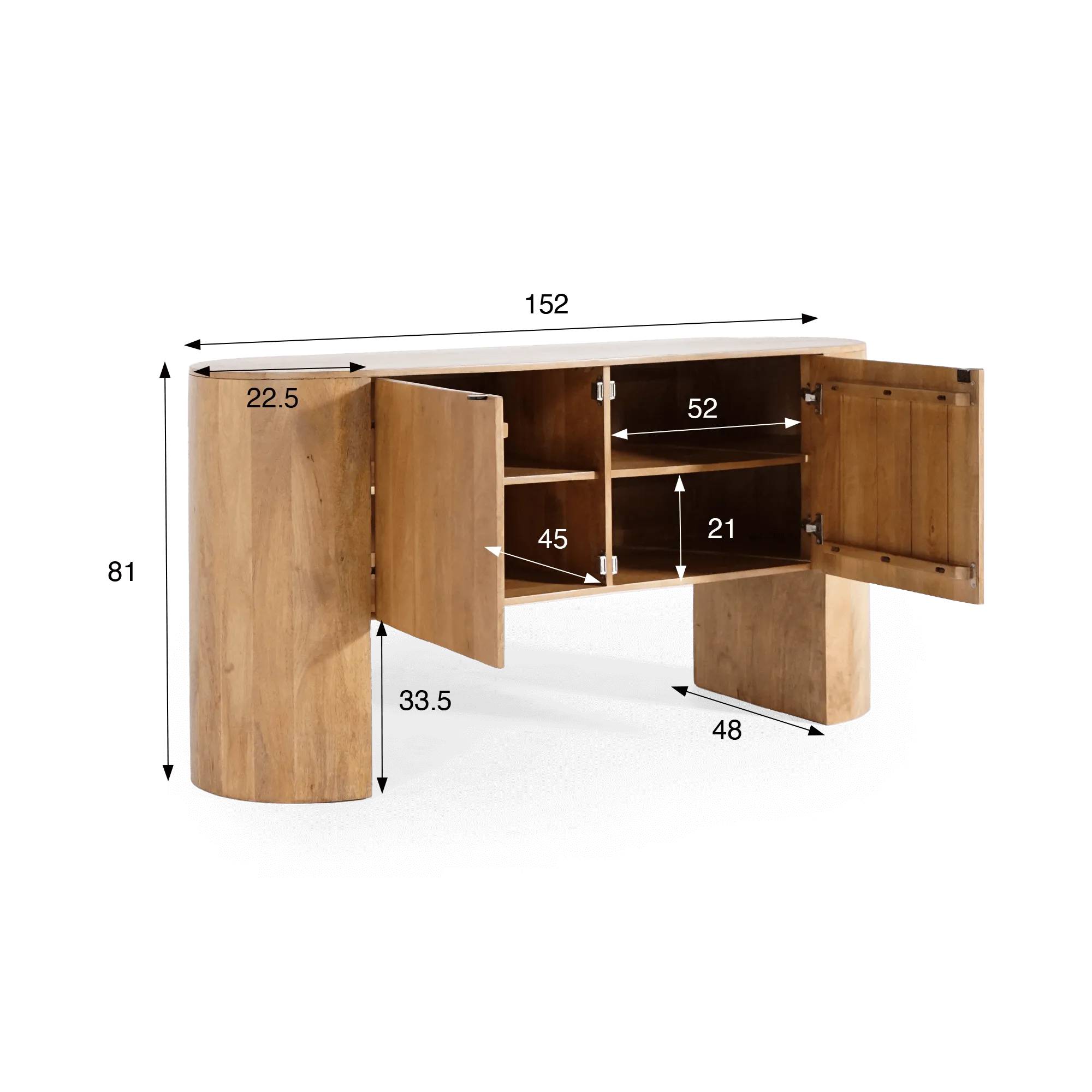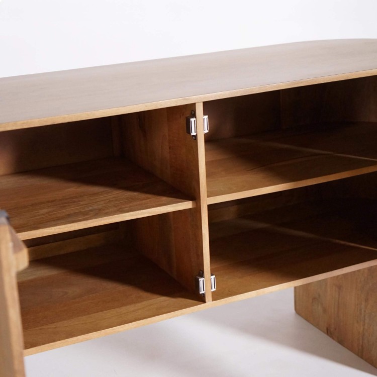 Hinter seinen zwei Drehtüren bietet das massive Holz-Sideboard mit 2 Türen Timea einen strukturierten und angenehm nutzbaren Stauraum. Jedes Fach ist mit festen Einlegeböden ausgestattet und eignet sich ideal für Geschirr, Tischwäsche oder Alltagsgegenstände. Die großzügigen, gut proportionierten Innenvolumen ermöglichen eine flüssige Nutzung im Alltag, während die Gesamthöhe dieses massiven Holz-Sideboards mit 2 Türen – 81 cm – es zu einer idealen Ablagefläche für dekorative Objekte oder Leuchten macht. Die Türen öffnen sich sanft und geben den Blick auf ein harmonisch abgestimmtes Holzinterieur frei, das konsequent auf visuelle Kontinuität ausgelegt ist.