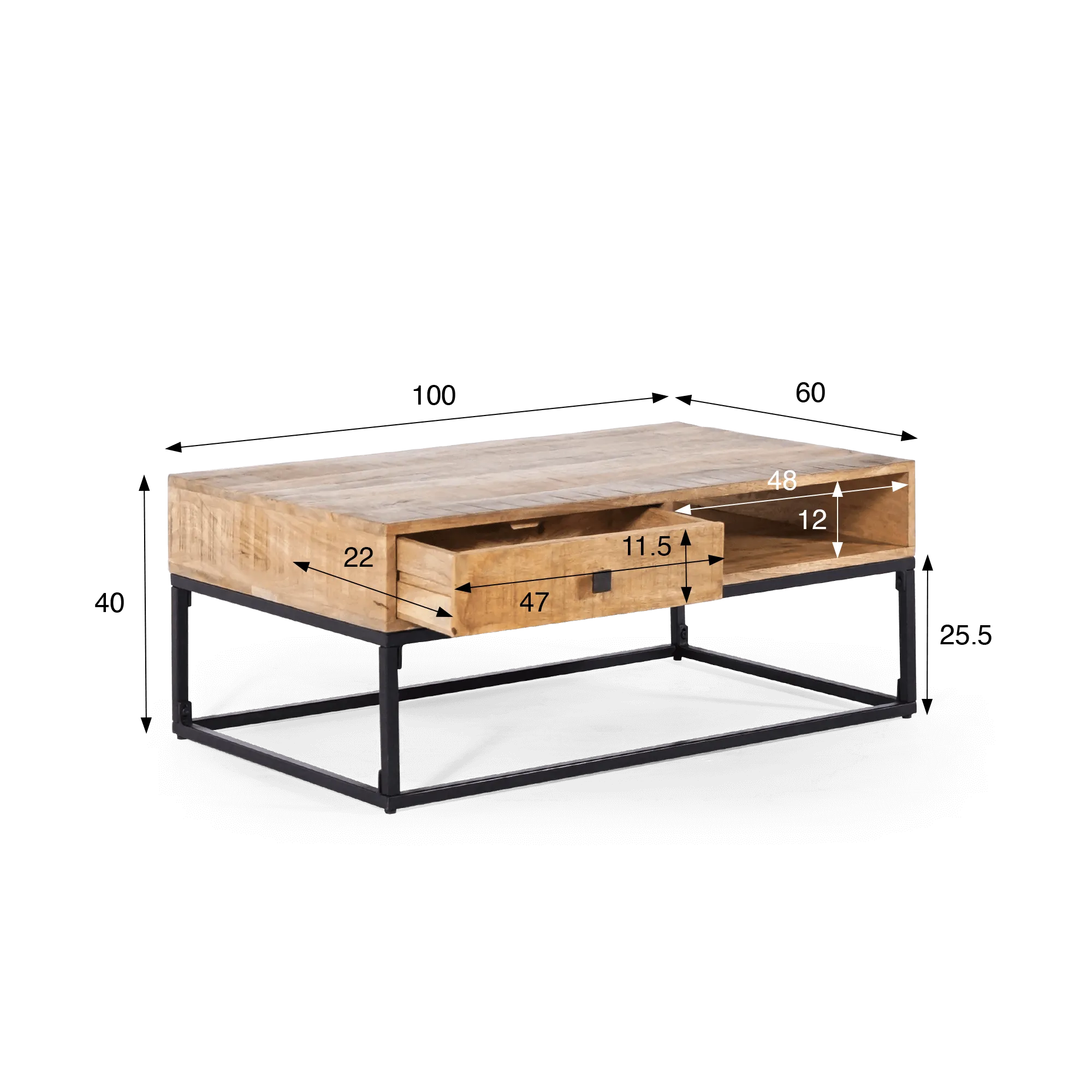 Der Stauraum dieses Couchtischs aus massivem Mangoholz mit Metallgestell wurde so gestaltet, dass er den Alltag erleichtert, ohne die Silhouette optisch zu beschweren. Die zwei Schubladen, jeweils seitlich angeordnet, bieten einen diskreten Platz für Fernbedienungen oder Accessoires. Jede Schublade verfügt über eine nutzbare Breite von etwa 47 cm und eine Tiefe von 22 cm – ideal für Alltagsgegenstände und gleichzeitig leicht zugänglich. Daneben bietet ein offenes Fach von 48 × 12 cm Platz für Zeitschriften oder Bücher und sorgt für eine natürliche Organisation des Wohnzimmers.