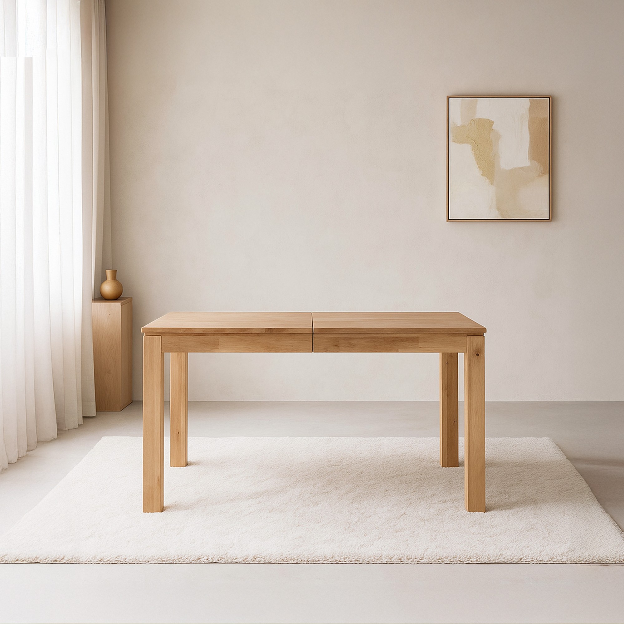 Hinter der scheinbaren Schlichtheit dieses Esstisches aus massiver Eiche mit Verlängerungsplatten verbirgt sich eine ausgeklügelte Konstruktion: Die Tischplatte enthält zwei mittige Verlängerungen von jeweils 40 cm, wodurch sich die Länge mühelos von 140 cm auf 220 cm erweitern lässt. Eine fließende Verwandlung, die es ermöglicht, vier bis acht Gäste zu empfangen, ohne die Harmonie der Platte zu unterbrechen. Das synchronisierte Öffnungssystem basiert auf stabilen, geräuscharmen Metallschienen, die eine einfache und langlebige Handhabung gewährleisten.