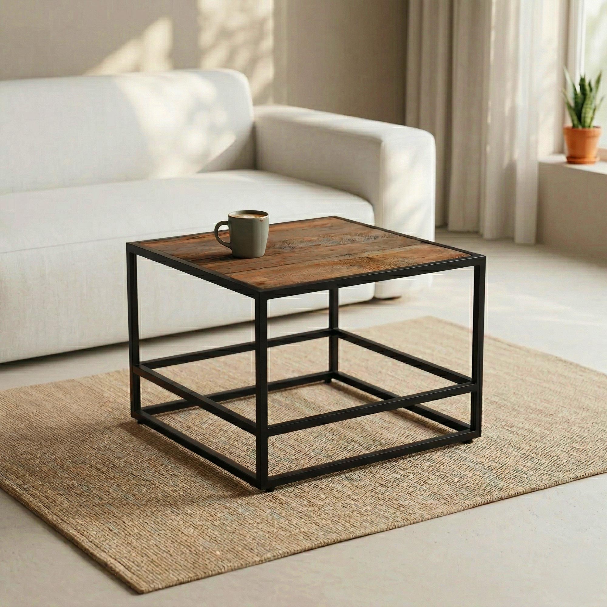 Wir haben den Wohnzimmertisch aus recyceltem Holz Recycled als ein emblematisches Stück unserer Philosophie entworfen: die Authentizität von recyceltem Holz mit der klaren Strenge von schwarzem Metall zu vereinen. Diese Kreation verkörpert das Wesen unserer Kollektion, in der der Charme des wiederverwendeten Materials auf die Präzision des industriellen Designs trifft.