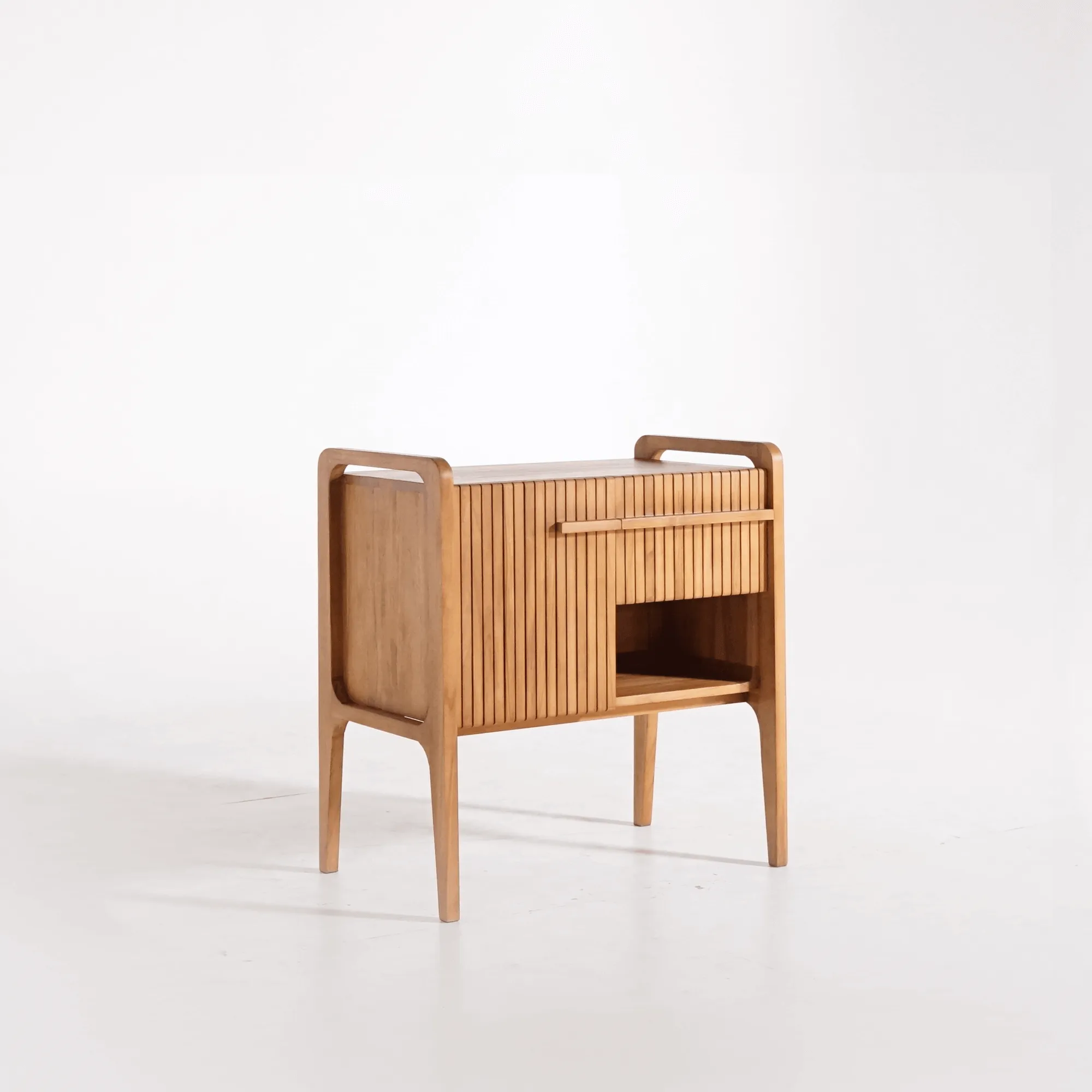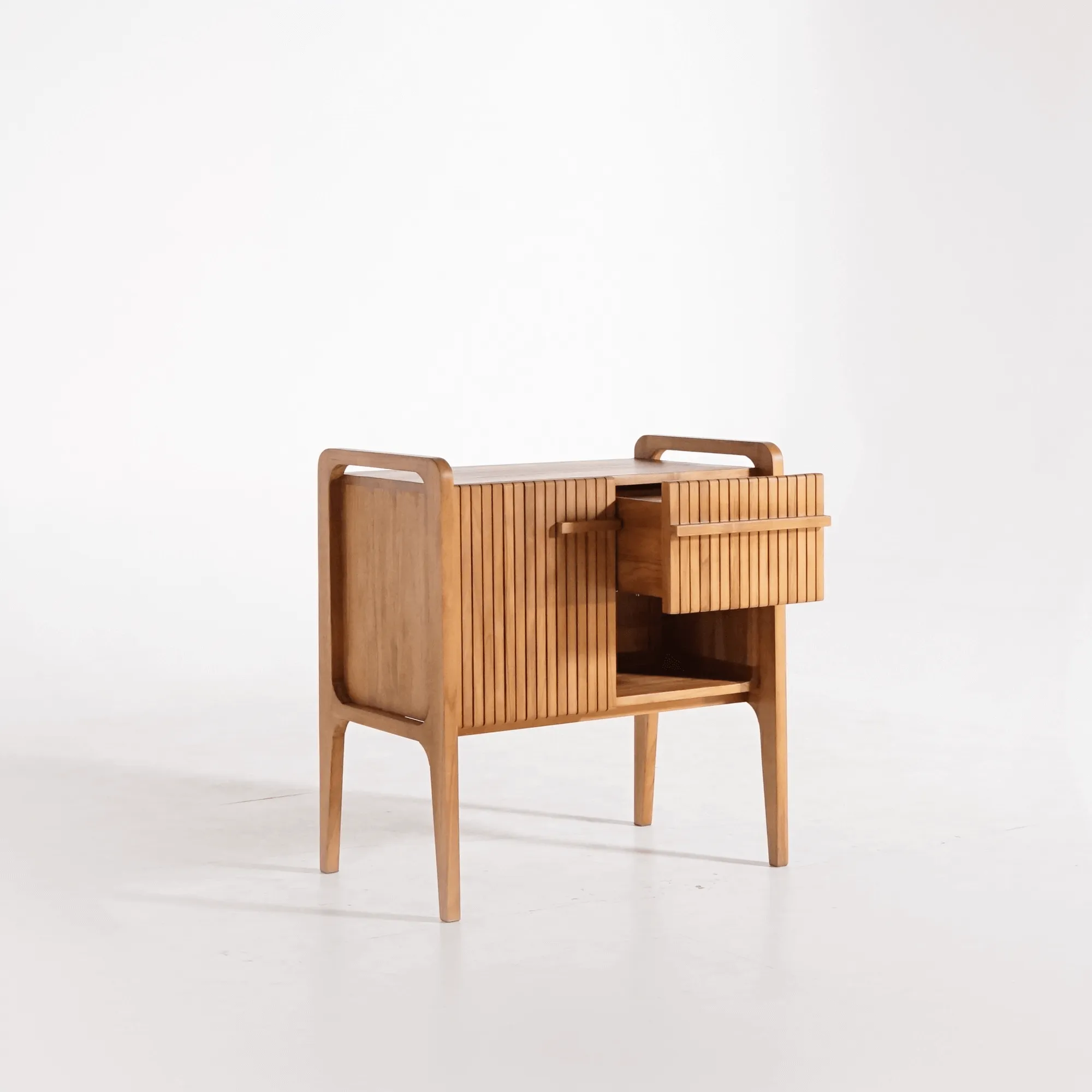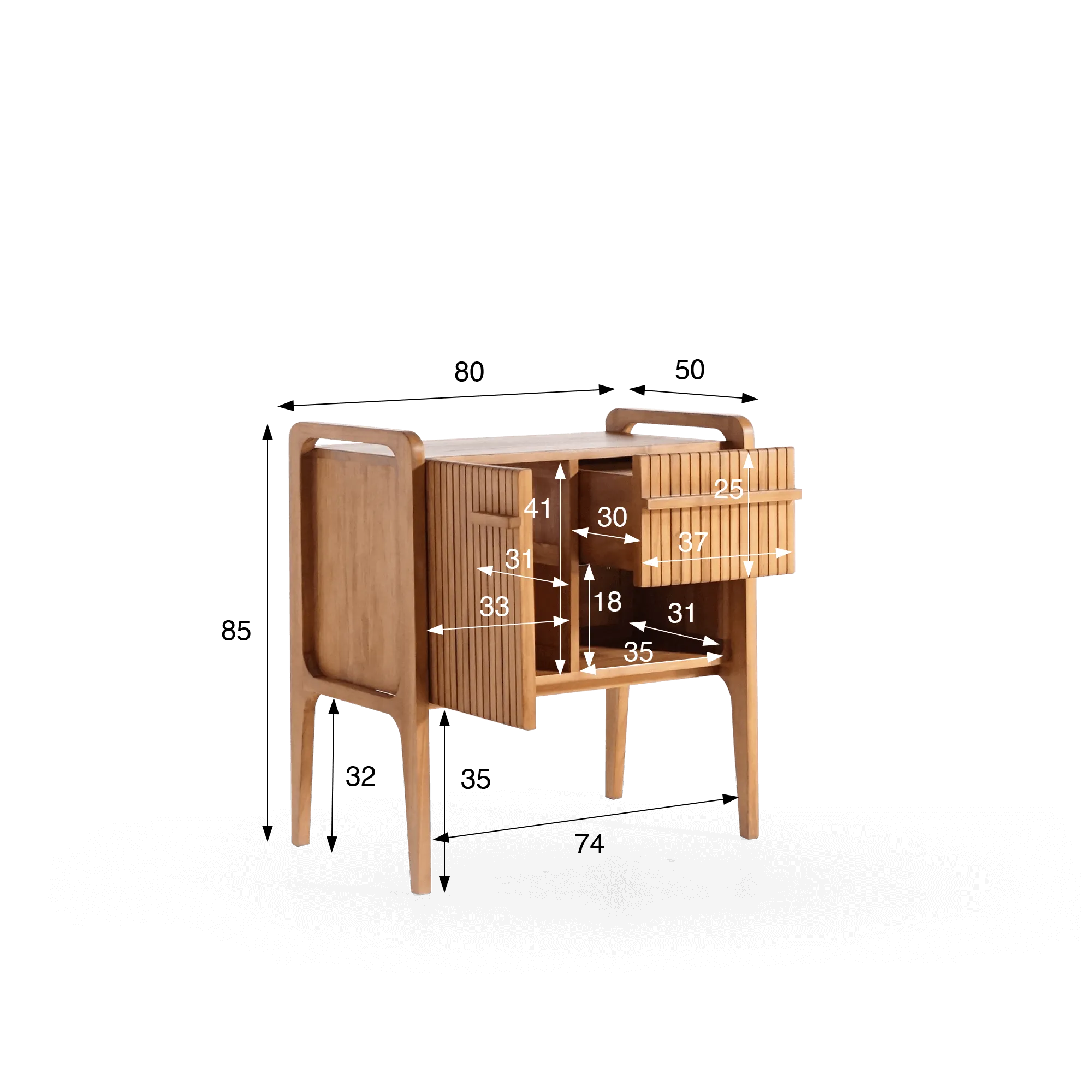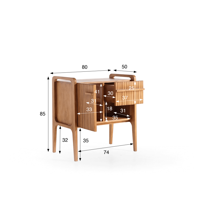 Jedes Detail dieses massiven Teakholz-Waschbeckenmöbels mit einfacher Beckenauflage wurde mit höchster Präzision ausgearbeitet: die Kanten sind sanft abgerundet, die Linien fließend, und die vertikalen Lamellen an der Front erinnern an Licht, das durch eine Holzjalousie fällt. Hinter dieser strukturierten Front verbirgt sich eine Tür mit Soft-Close-System und eine Schublade mit leichtgängigen Führungen – ein praktischer Stauraum für Alltagsutensilien. Im Inneren bietet ein Fach mit 41 cm Höhe und 31 cm Tiefe ausreichend Platz für Handtücher oder Pflegeprodukte, während die 37 cm breite und 25 cm hohe Schublade perfekt für kleinere Gegenstände geeignet ist.