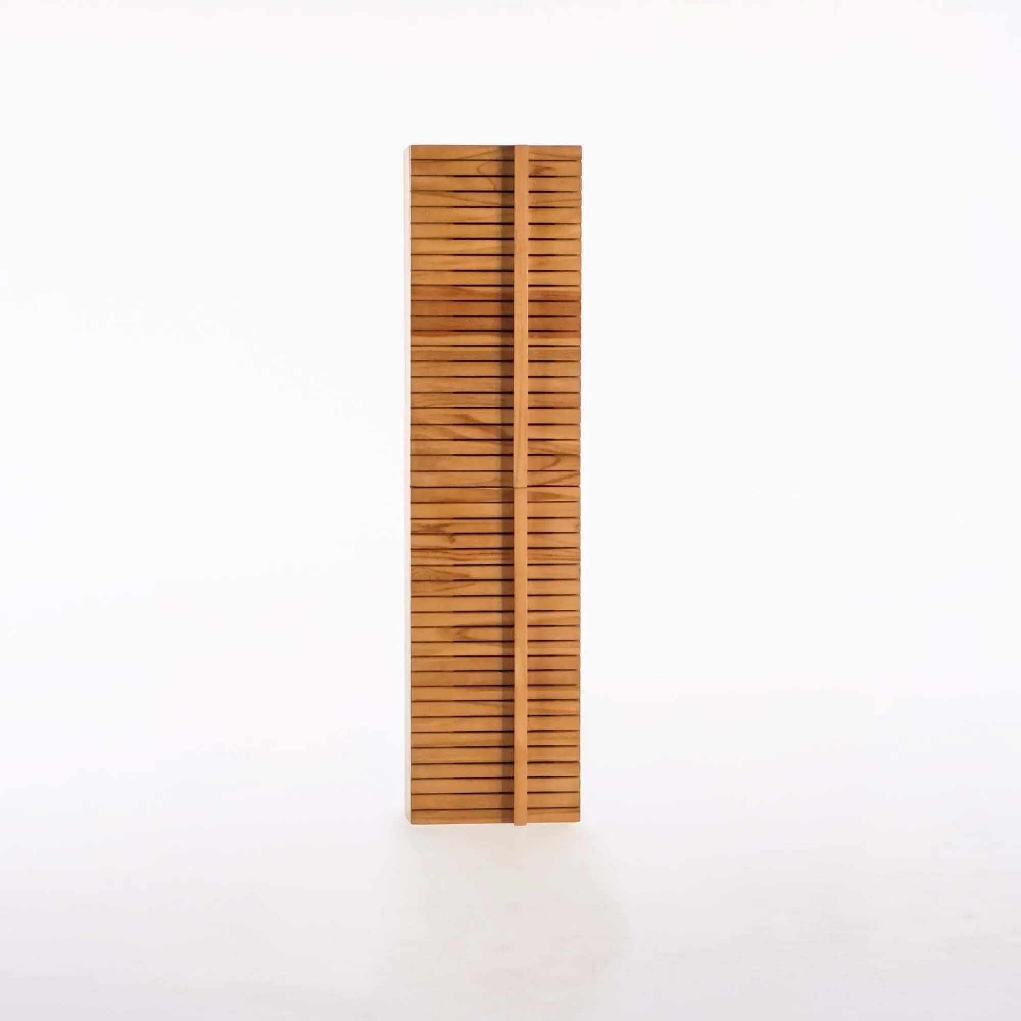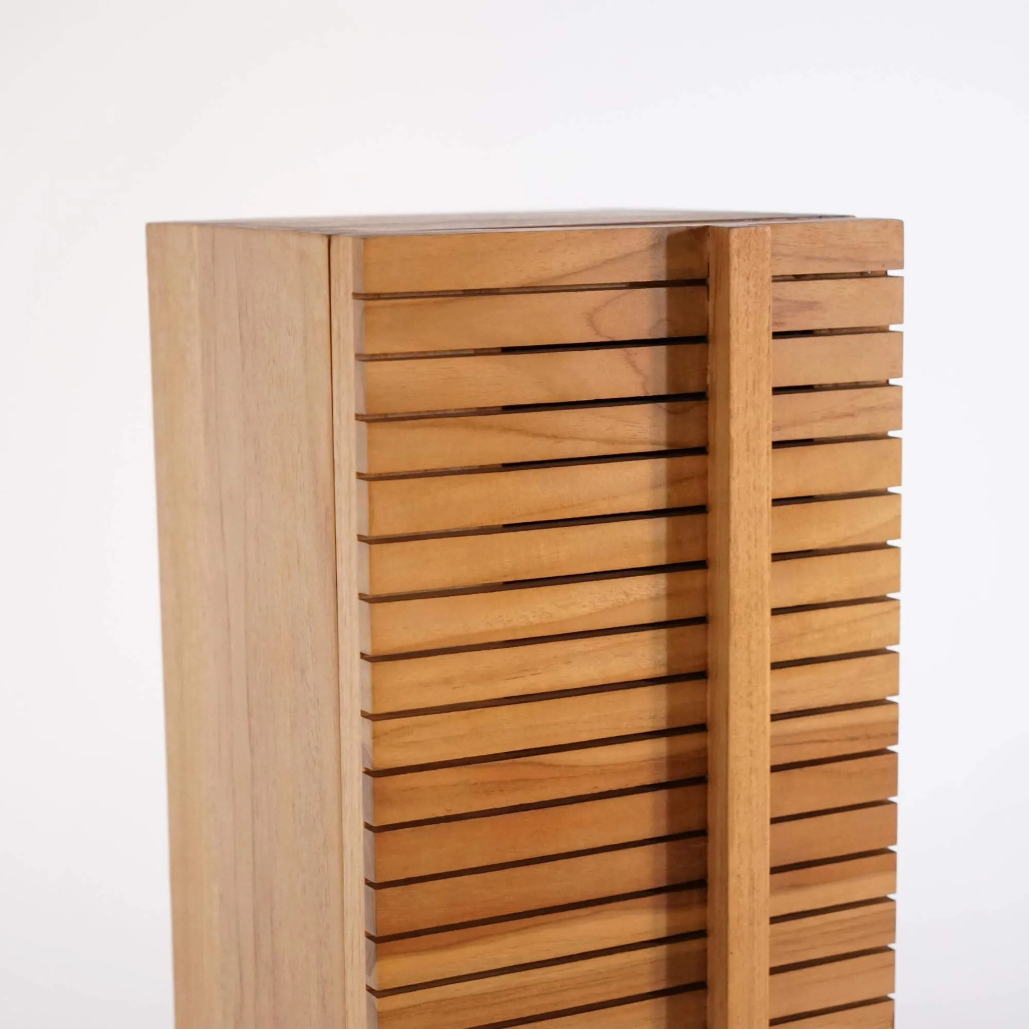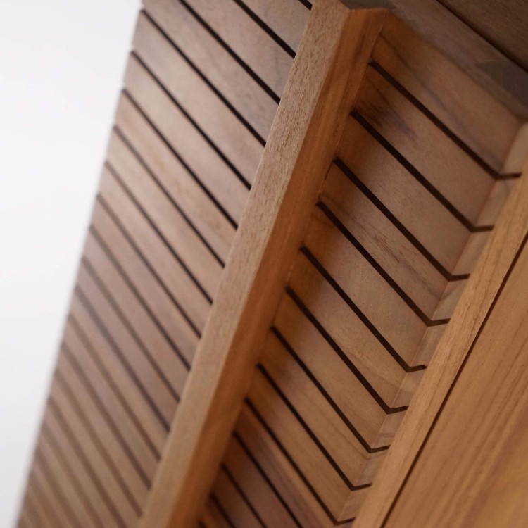 Die klare, vertikale Silhouette dieser Badezimmer-Säule aus massivem Teakholz findet ihr Gleichgewicht in den feinen Lamellen, die ihre beiden Drehtüren strukturieren. Jede Rille offenbart den Reichtum und die goldenen Nuancen des Holzes, während die sanften Kanten und integrierten Griffe den Japandi-Stil verkörpern – eine Ästhetik, die Einfachheit und Handwerkskunst in den Vordergrund stellt.
