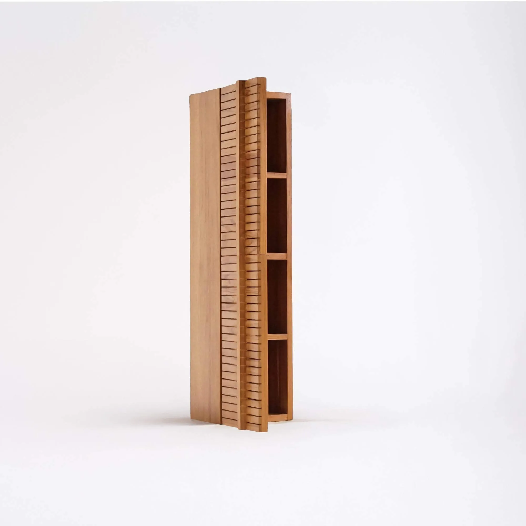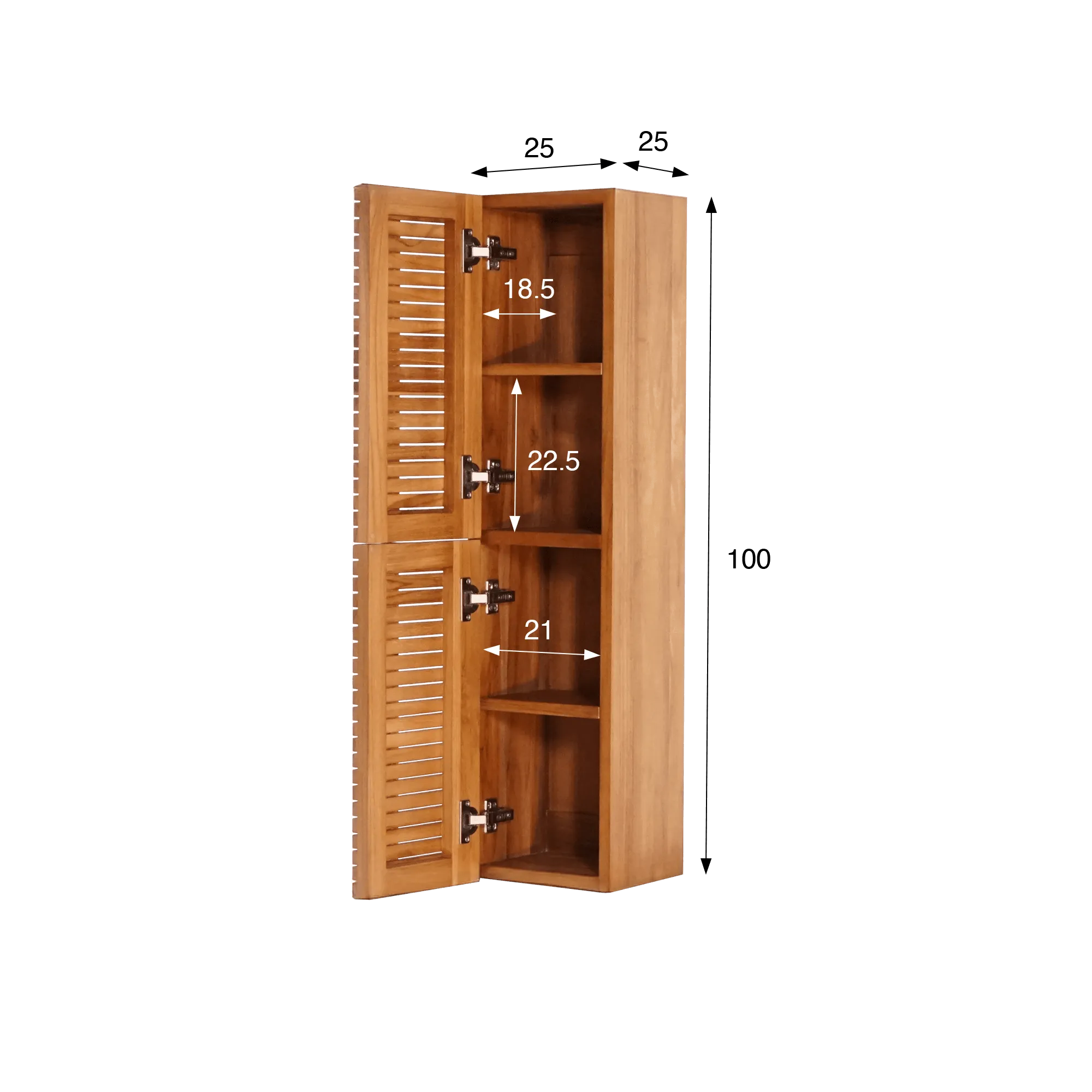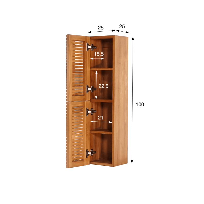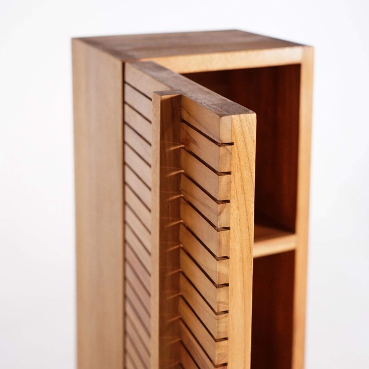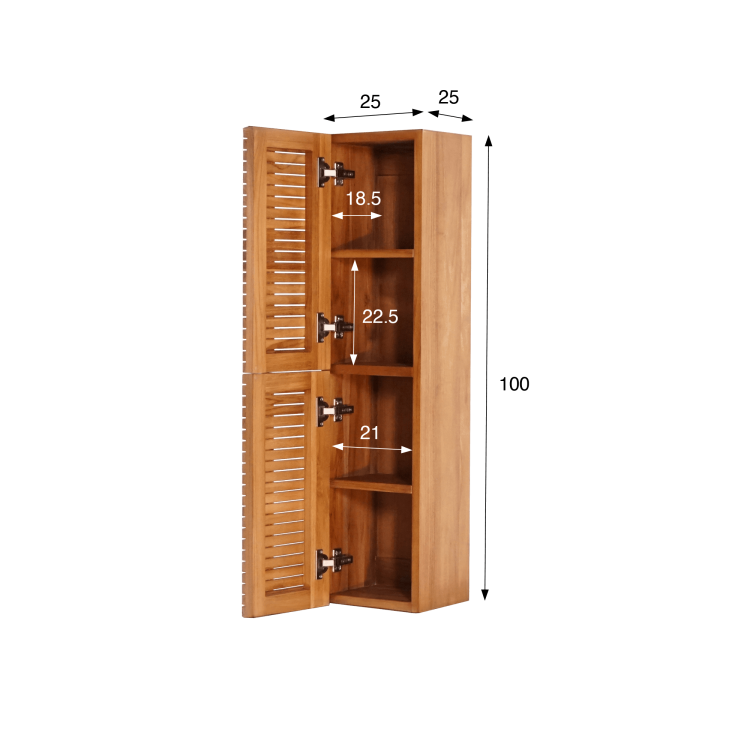 Hinter den Soft-Close-Türen unserer Badezimmer-Säule aus massivem Teakholz Devika verbergen sich vier Innenfächer (22,5 cm hoch, 21 cm breit und 18,5 cm tief), ideal zur Aufbewahrung der täglichen Essentials: gerollte Handtücher, Pflegeprodukte oder Accessoires. Auch das Innere aus Teakholz zeugt von derselben handwerklichen Sorgfalt wie das Äußere – ohne Kompromisse zwischen Schönheit und Funktionalität.