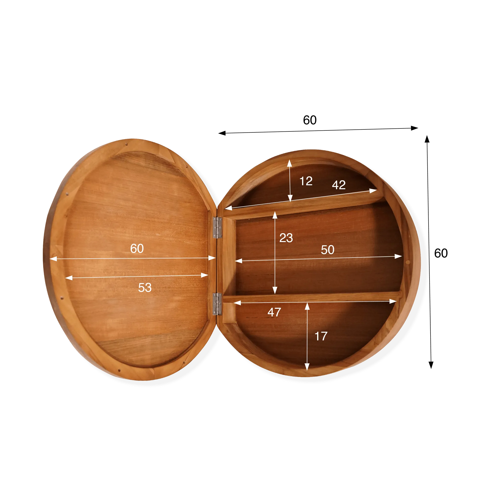 Der Durchmesser von 60 cm dieses runden Badezimmerspiegels mit Stauraumfach fügt sich in eine perfekte Geometrie ein, die sowohl für kleine als auch für große Badezimmer geeignet ist. Auf den ersten Blick besticht er durch die Feinheit seines Rahmens und die natürliche Wärme des Teakholzes. Beim Öffnen offenbart er zwei Innenablagen – mit einer Höhe von 23 cm im mittleren Bereich – ideal, um Alltagsgegenstände wie Flakons, Parfums oder Pflegeprodukte zu organisieren. Die dezenten Scharniere und die präzise Verarbeitung des Rahmens sorgen für ein sanftes Öffnen und einen stabilen Halt.