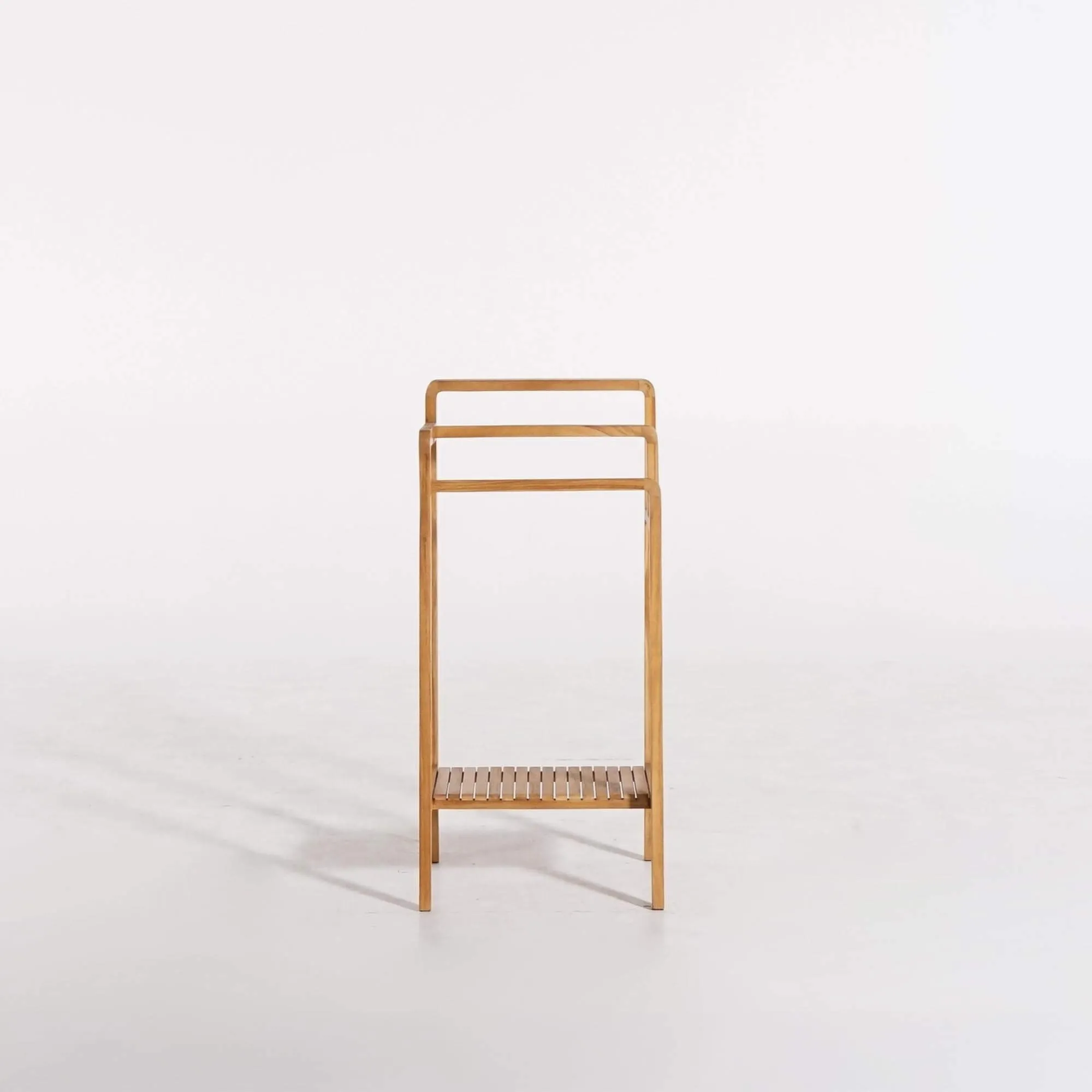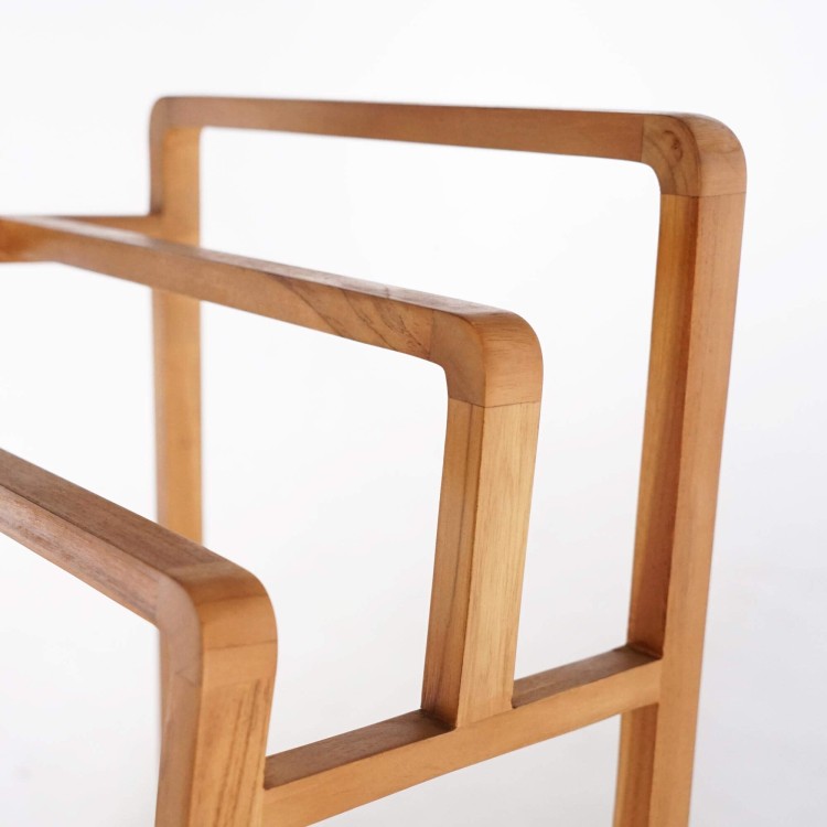 Gedacht für elegante Innenräume, fügt sich der Handtuchhalter für das Badezimmer aus massivem Teakholz Devika harmonisch in ein puristisches Badezimmer oder einen häuslichen Spa-Bereich ein. Seine leichte Silhouette lässt sich mühelos bewegen, bleibt aber dennoch äußerst stabil. Wir wollten ein Objekt schaffen, das zugleich praktisch und dekorativ ist – ein Stück, das Ordnung und Eleganz in Ihren Raum bringt.