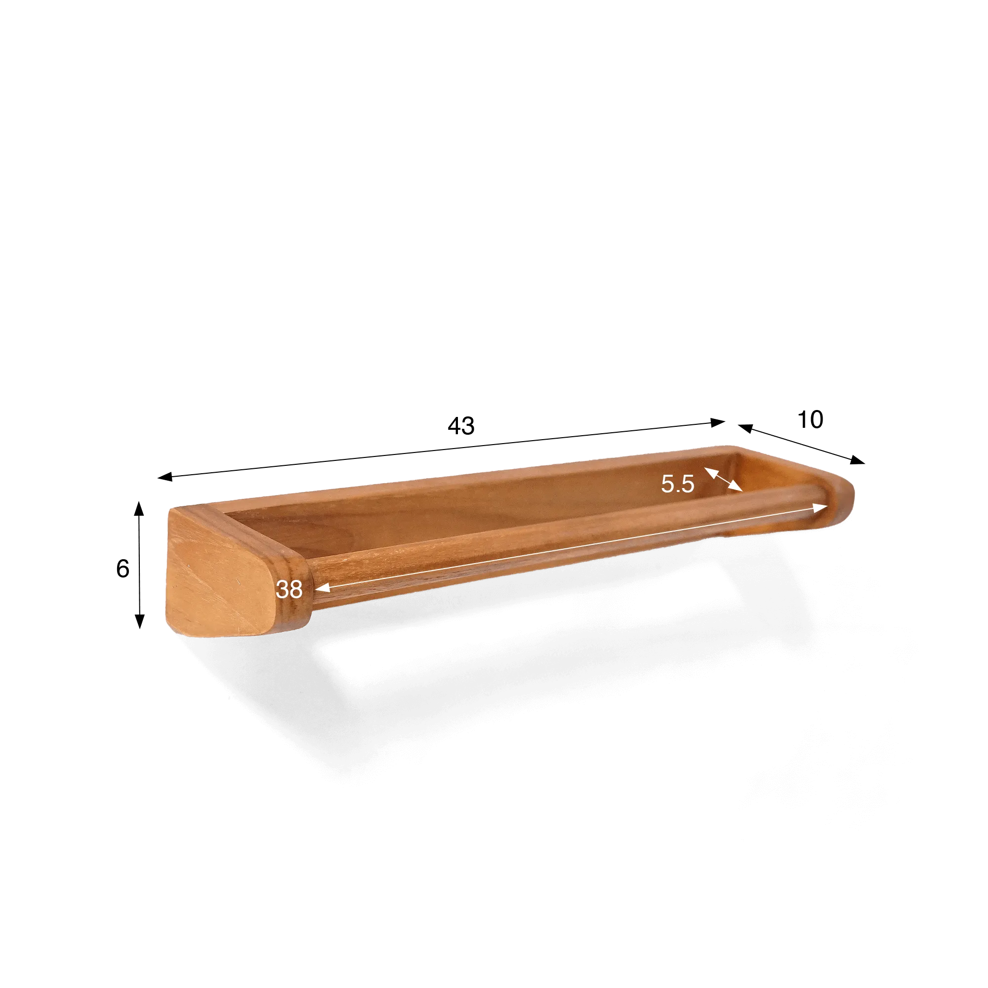 Mit einer Länge von 43 cm, einer Tiefe von 10 cm und einer Höhe von 6 cm bietet dieser Handtuchhalter aus Teakholz ideale Proportionen, um ein Badetuch oder ein gefaltetes Handtuch aufzunehmen. Sein kompaktes und leichtes Design ermöglicht eine einfache Wandmontage, ohne an visueller Leichtigkeit oder Harmonie einzubüßen.