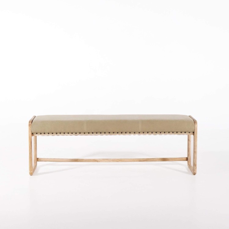 Gefertigt aus massivem Mangoholz vereint diese 138 cm lange Bank aus Massivholz und khakifarbenem Stoff Robustheit mit optischer Leichtigkeit. Das in einer einzigen fließenden Bewegung geformte Gestell zeigt das ganze handwerkliche Können, das in ihre Herstellung eingeflossen ist. Die leicht abgerundeten Linien und die natürliche Holzoberfläche lassen feine Farbnuancen und Unregelmäßigkeiten erkennen – Zeichen sorgfältiger Handarbeit.