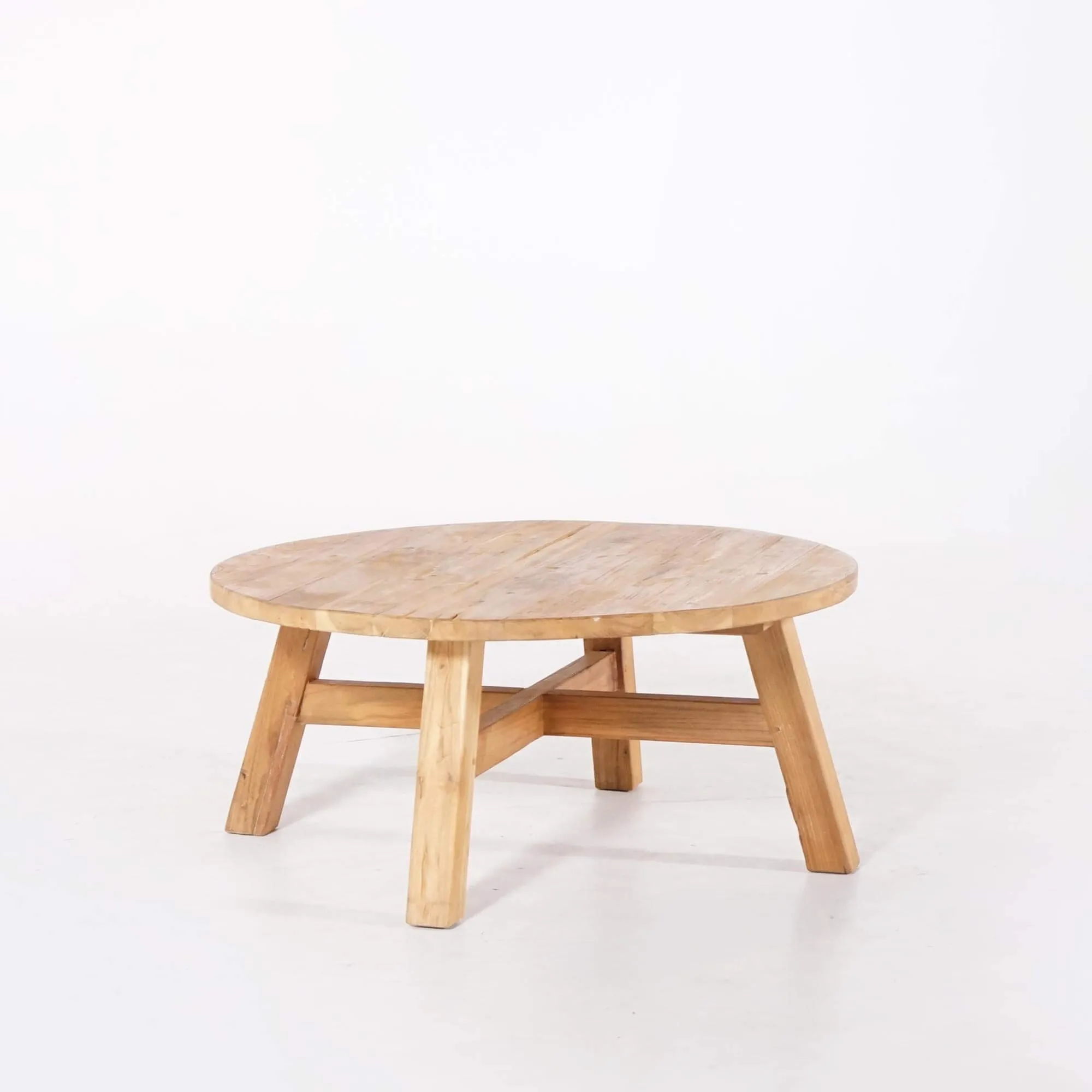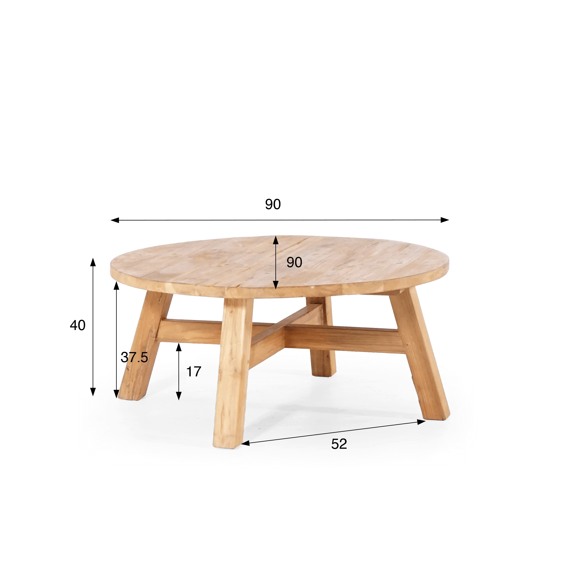Der vollständig aus recyceltem Massivholz gefertigte Couchtisch zeigt die rohe Schönheit des Materials. Jede Maserung, jeder Farbton und jede Unregelmäßigkeit erzählt eine Geschichte – ein Zeugnis der Vergangenheit des Holzes, dem hier ein zweites Leben geschenkt wird. Die runde Tischplatte mit einem Durchmesser von 90 cm und einer Höhe von 40 cm bietet ein perfektes Gleichgewicht zwischen Geselligkeit und Funktionalität – ideal für ein einladendes Wohnzimmer.