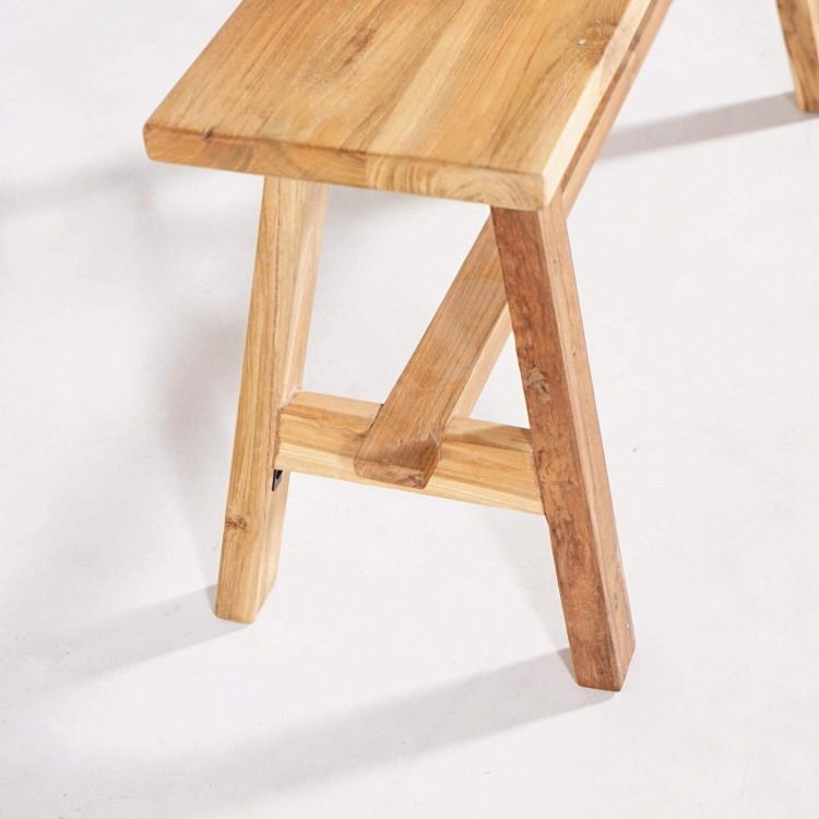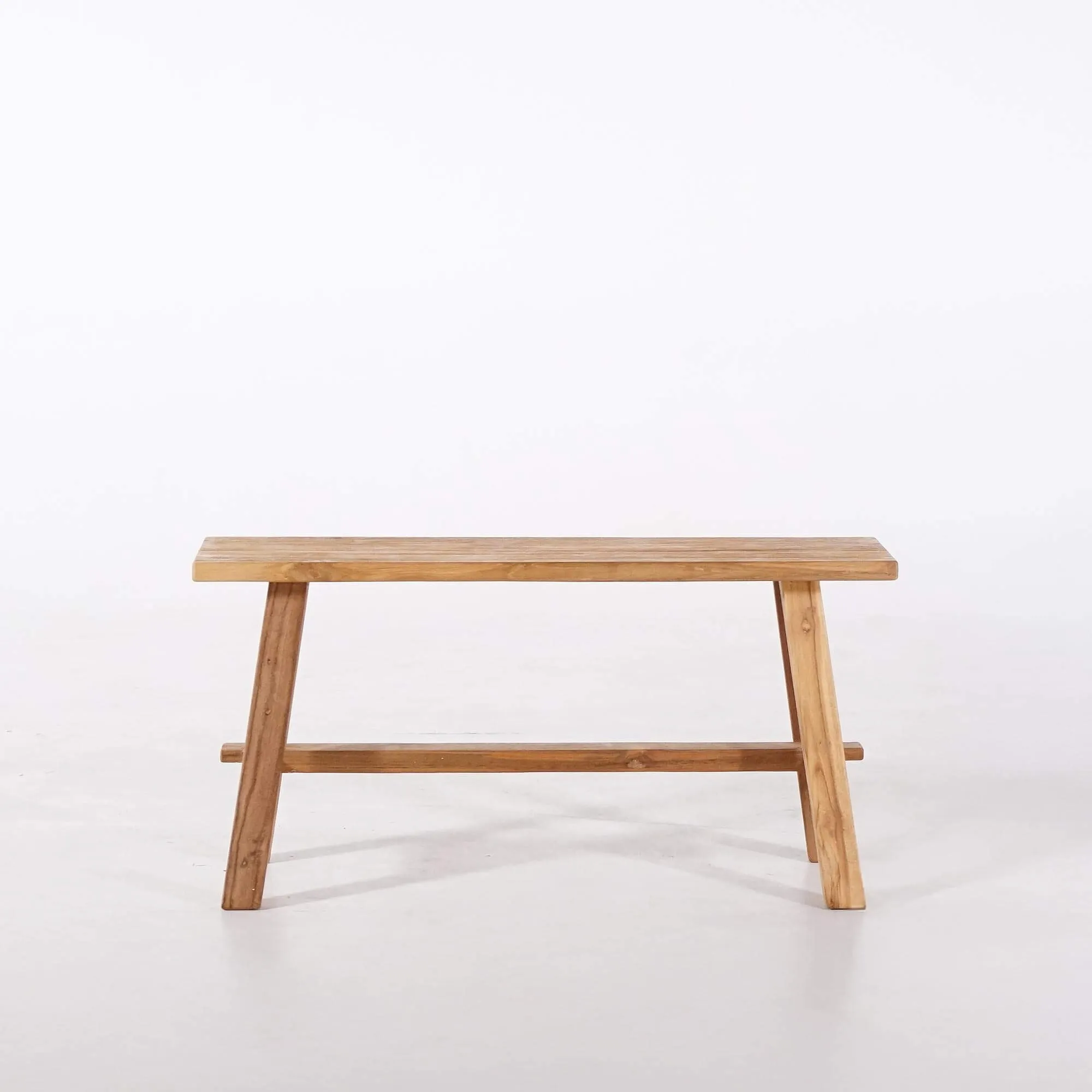 Mit bereits gealtertem Holz zu arbeiten, erfordert echtes handwerkliches Können. Für die Herstellung dieser Bank aus massivem Naturholz schleifen wir das Holz von Hand, justieren die Verbindungen neu und runden jede Kante sanft ab – für eine seidige Haptik, die die charakteristische Patina des Materials bewahrt. Das Ergebnis ist eine robuste, sofort einsatzbereite Bank, die mit der Zeit an Charakter gewinnt. Ihr natürlicher, leicht bohèmehafter Stil harmoniert wunderbar mit mineralischen Texturen, Pflanzenfasern und Heimtextilien und schafft eine sanfte, helle Atmosphäre.