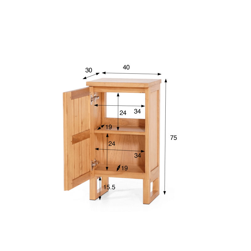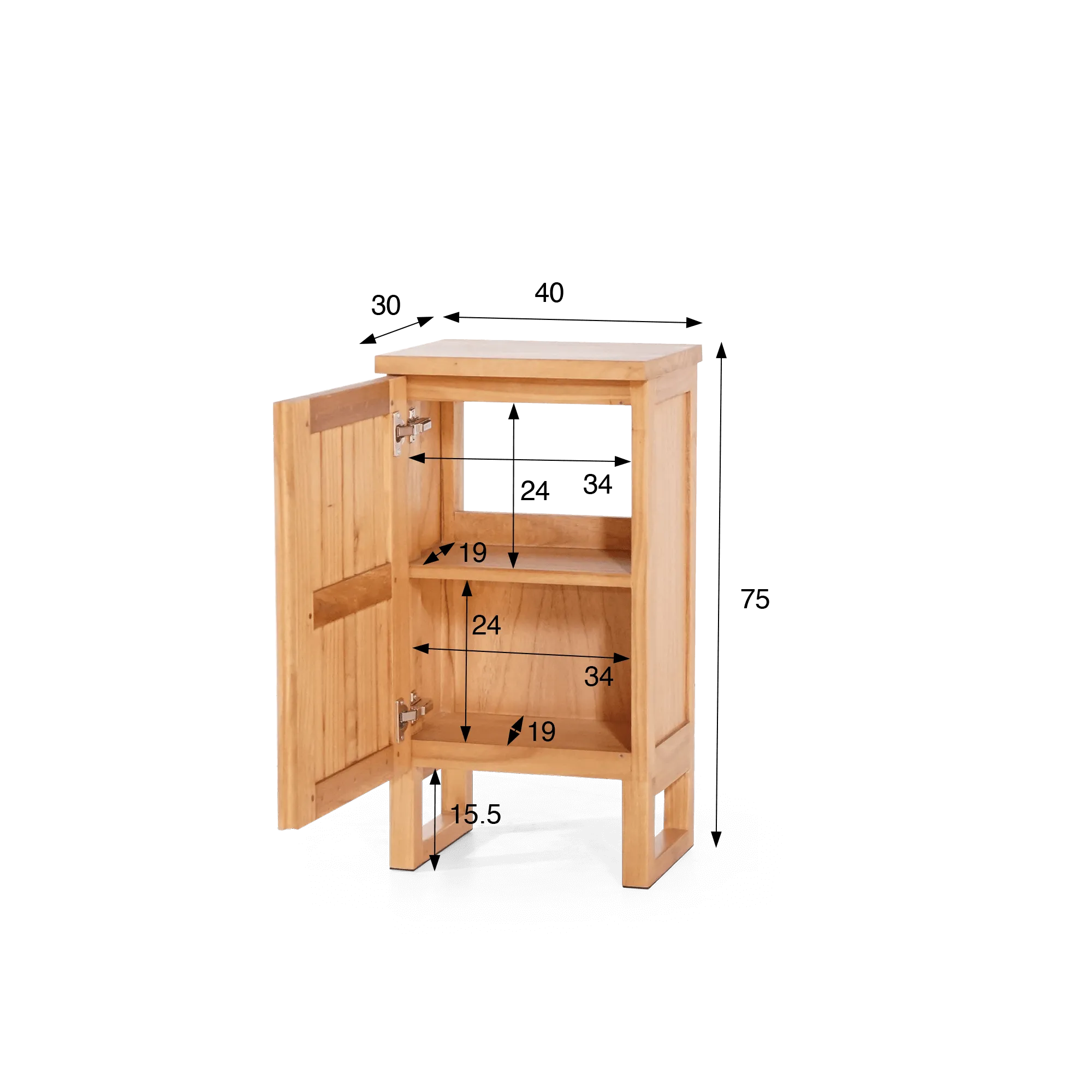 Kompakt und dennoch großzügig: Dieser Waschbeckenunterschrank aus Massivholz mit 40 cm Breite und 30 cm Tiefe findet selbst in kleinen Räumen seinen Platz. Hinter der Drehtür befinden sich zwei Innenfächer von jeweils 24 cm Höhe, mit einer nutzbaren Tiefe von etwa 19 cm und einer Breite von 34 cm – ideal für die intuitive Aufbewahrung alltäglicher Badutensilien. Ob Handtücher, Pflegeflaschen oder Zubehör: Die Innenaufteilung wurde so gestaltet, dass sie diskret bleibt und dennoch komfortabel zu benutzen ist.