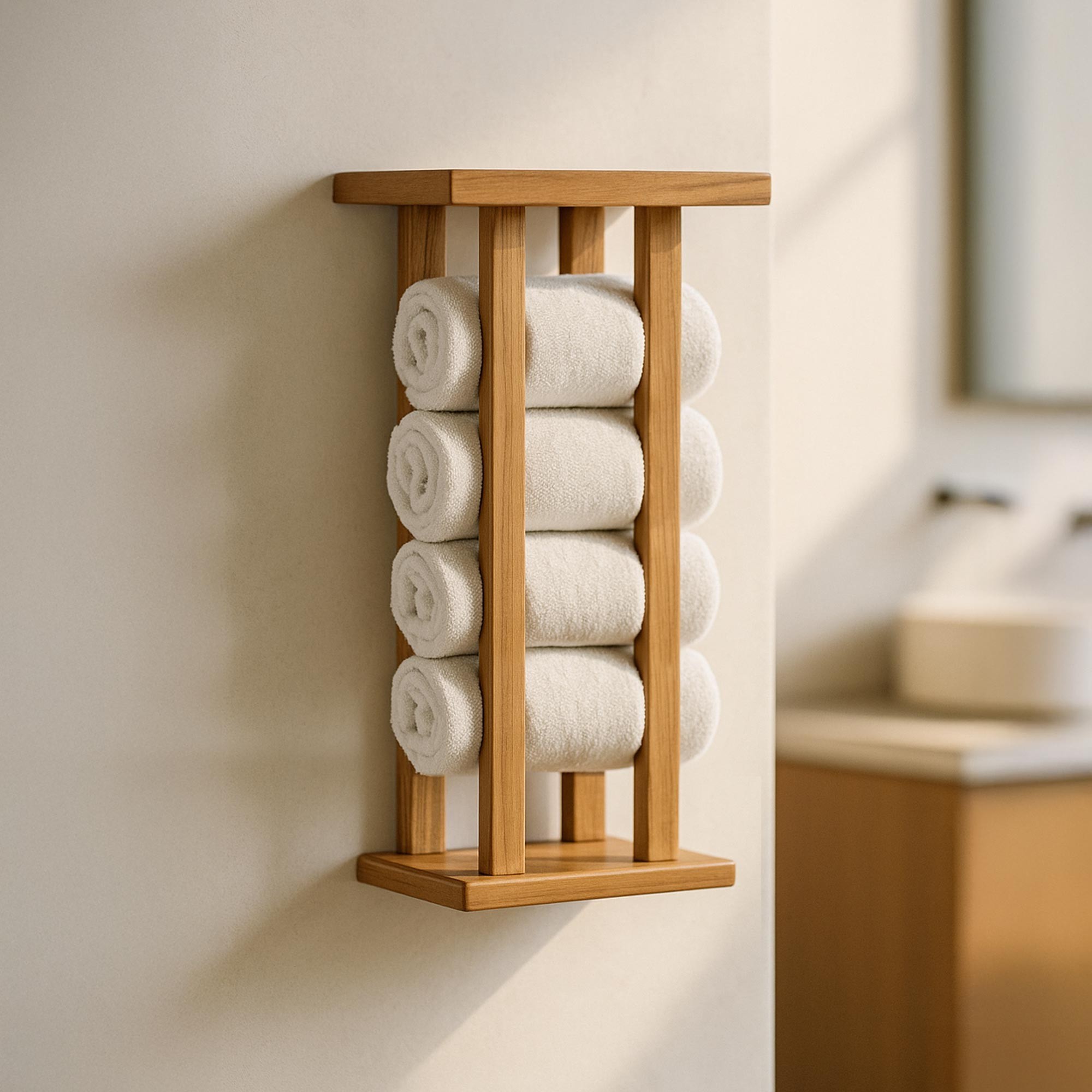 Wir haben eine offene Struktur mit Streben entworfen, die etwa 10,5 cm voneinander entfernt sind, sodass mehrere gerollte Handtücher übereinander gestapelt werden können und dennoch leicht zu greifen sind. Die vertikale Ausrichtung dieses Handtuchhalters aus massivem Teakholz bietet eine kompakte und zugleich luftige Aufbewahrungslösung, ideal zur optimalen Nutzung jedes Winkels. Dank seiner bereits montierten Konstruktion lässt er sich in wenigen Sekunden platzieren: einfach aufhängen oder abstellen, je nach gewünschter Einrichtung.