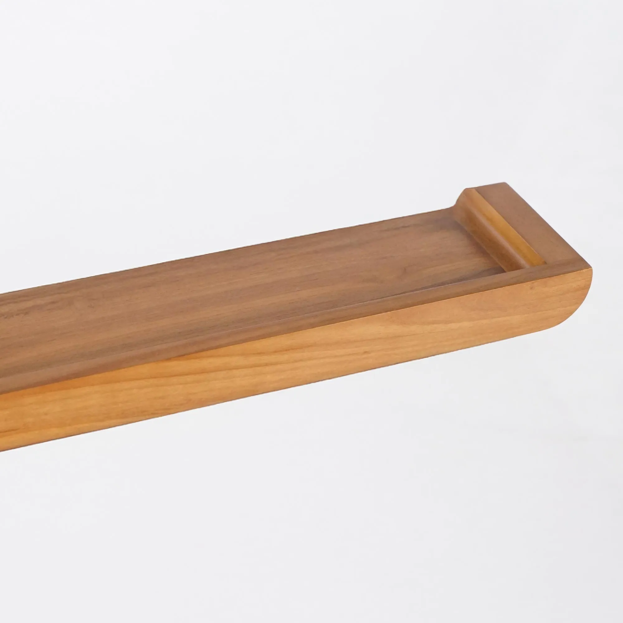 Mit ihren ausgewogenen Maßen – 90 cm Länge, 15 cm Tiefe und 5 cm Höhe – bietet diese Wandablage aus massivem Teakholz den idealen Platz für Parfümflakons, Kerzen oder Dekoobjekte. Eine feine, über die gesamte Länge eingefräste Nut hält die Gegenstände sicher an ihrem Platz, ohne die fließende Linienführung zu unterbrechen.