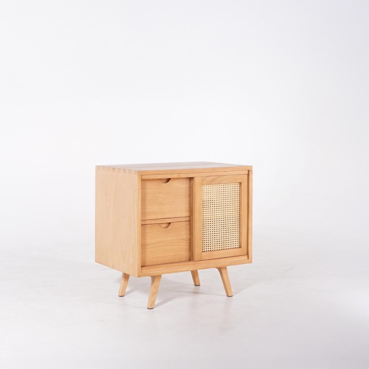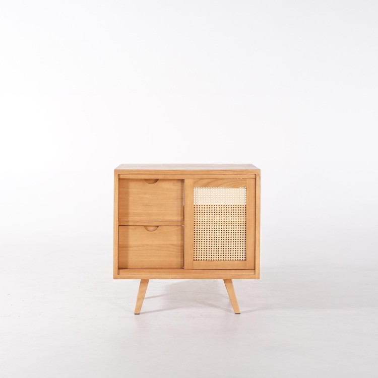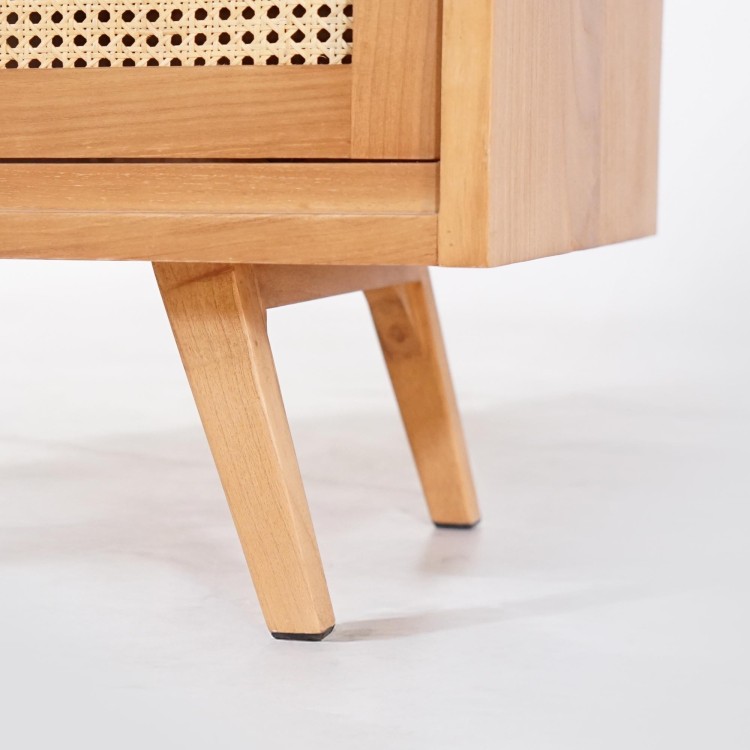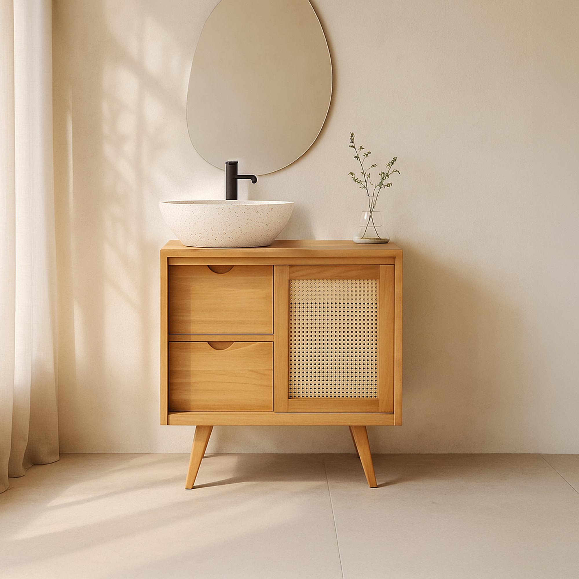 Unsere Designer haben das Badezimmermöbel aus Massivholz auf Füßen Anaya 80 cm als eine kompaktere Interpretation des ikonischen Modells der Kollektion entworfen – gedacht für intime und helle Räume. Für Liebhaber natürlicher Linien und edler Materialien vereint es die Wärme von Mindi-Holz mit der Leichtigkeit handgeflochtener Wiener Geflecht-Elemente zu einem sanften, beruhigenden und zeitlosen Gesamtbild.