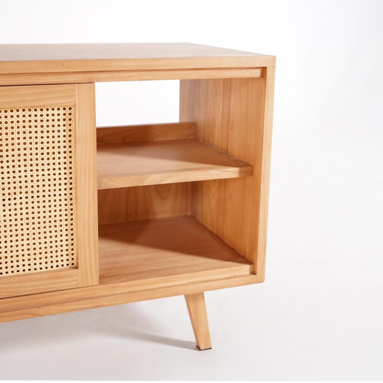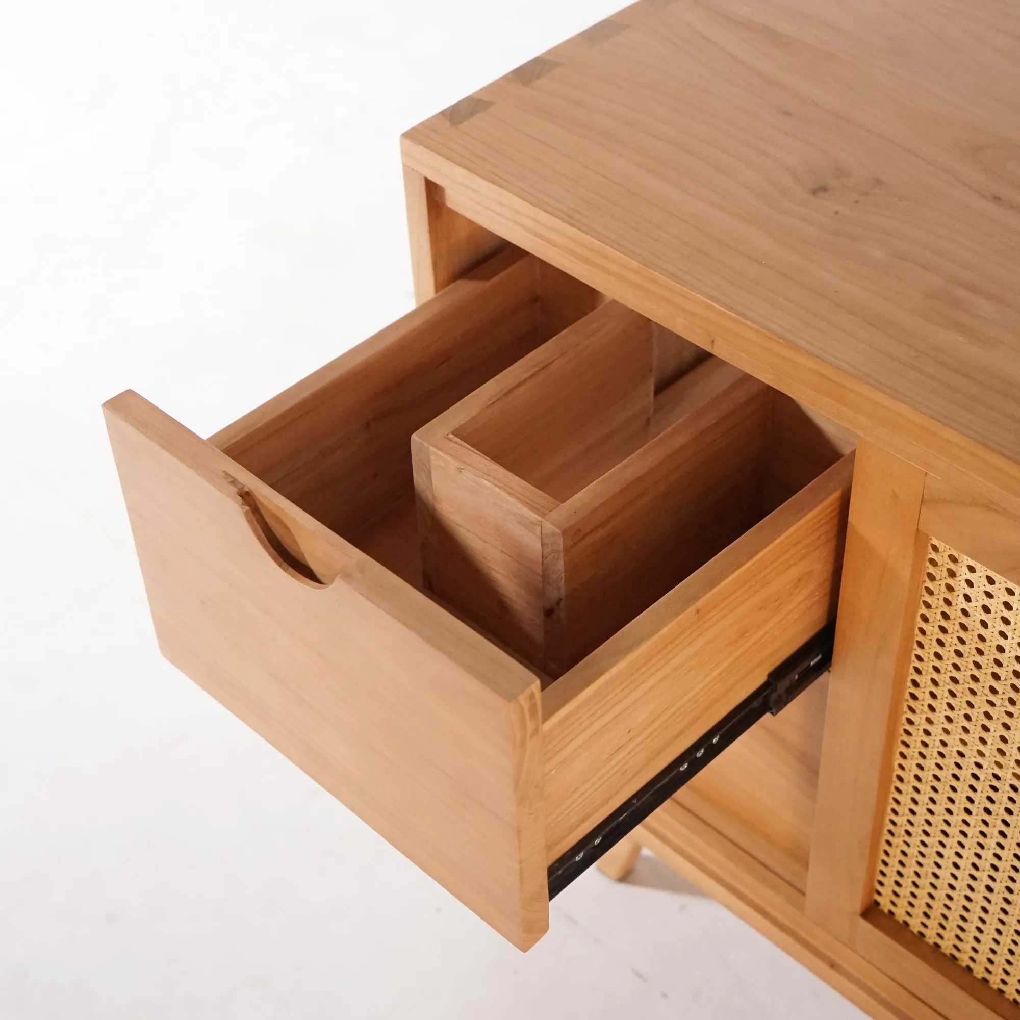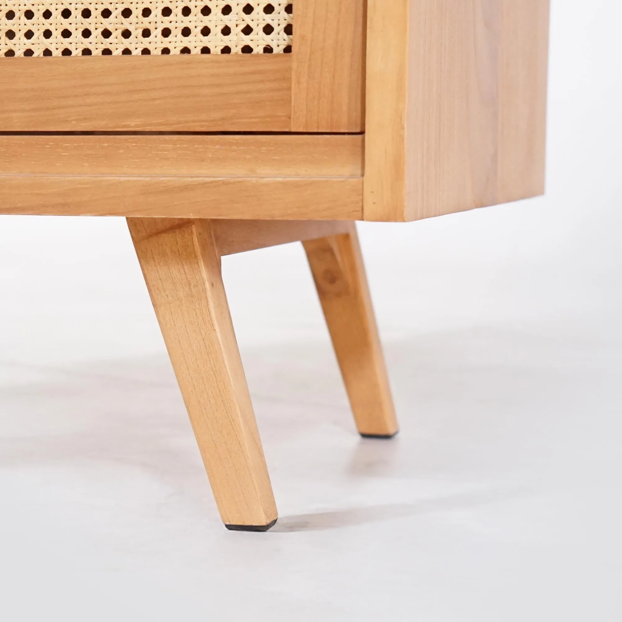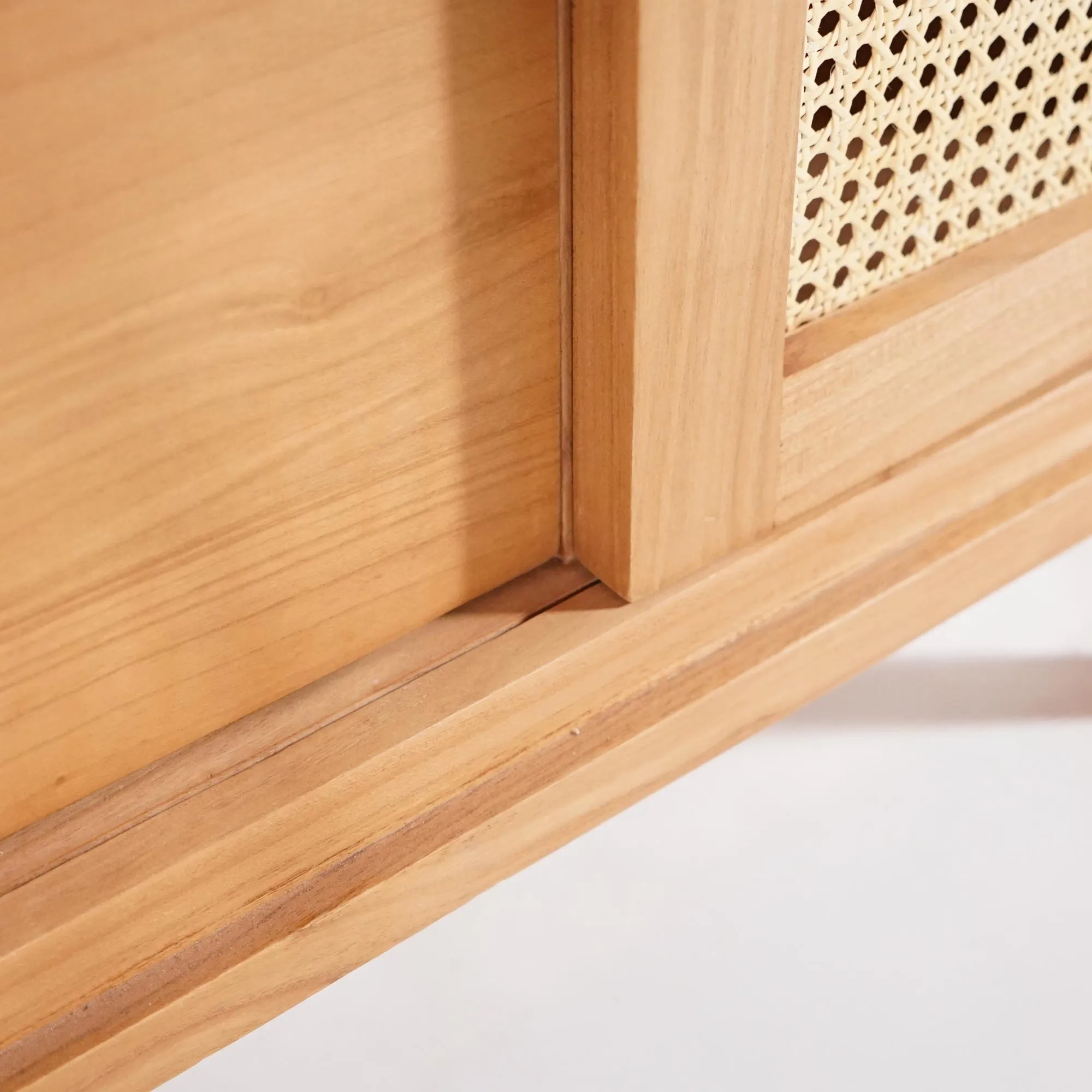 Gefertigt aus massivem Mindi-Holz, einer Holzart, die für ihre Stabilität und natürliche Feuchtigkeitsbeständigkeit bekannt ist, besticht dieses Badezimmermöbel durch seine glatte Oberfläche und goldenen Nuancen, die sich je nach Lichteinfall sanft verändern. Jedes Paneel wird sorgfältig von Hand geschliffen und lackiert, um die feine Maserung des Holzes zu betonen, während die Schiebetür mit einer von Hand gewebten Front aus natürlichem Wiener Geflecht Authentizität und Eleganz verleiht.