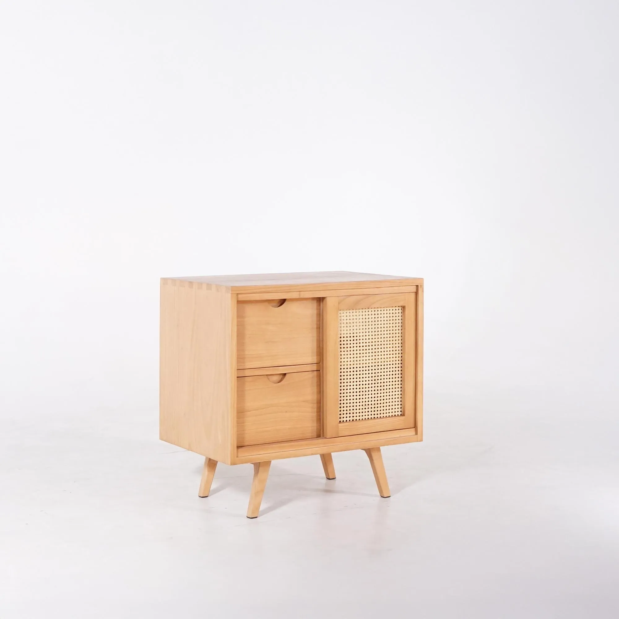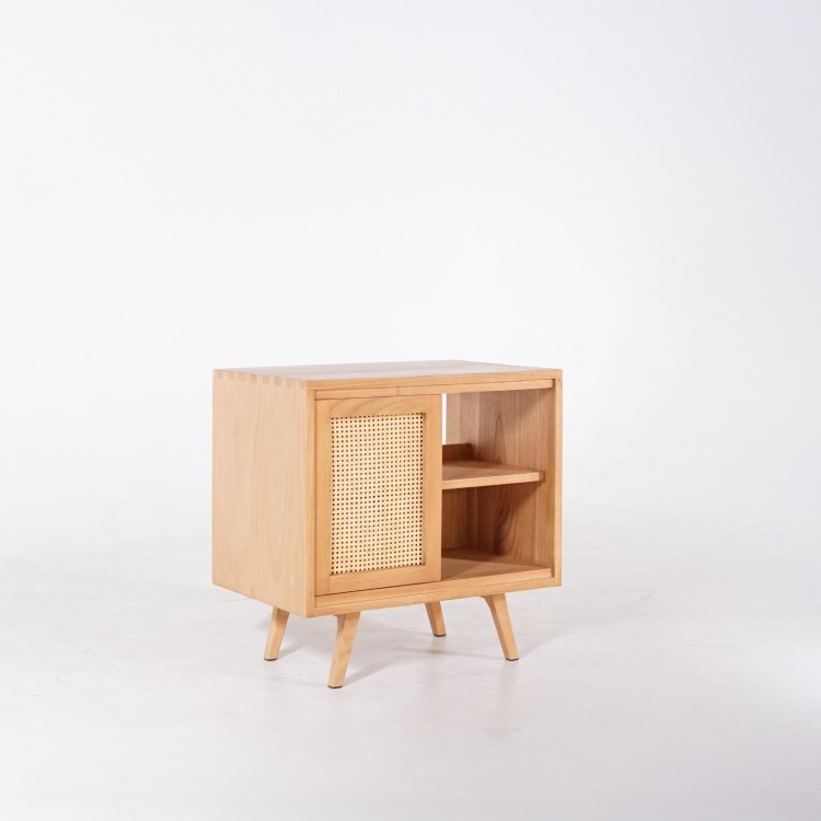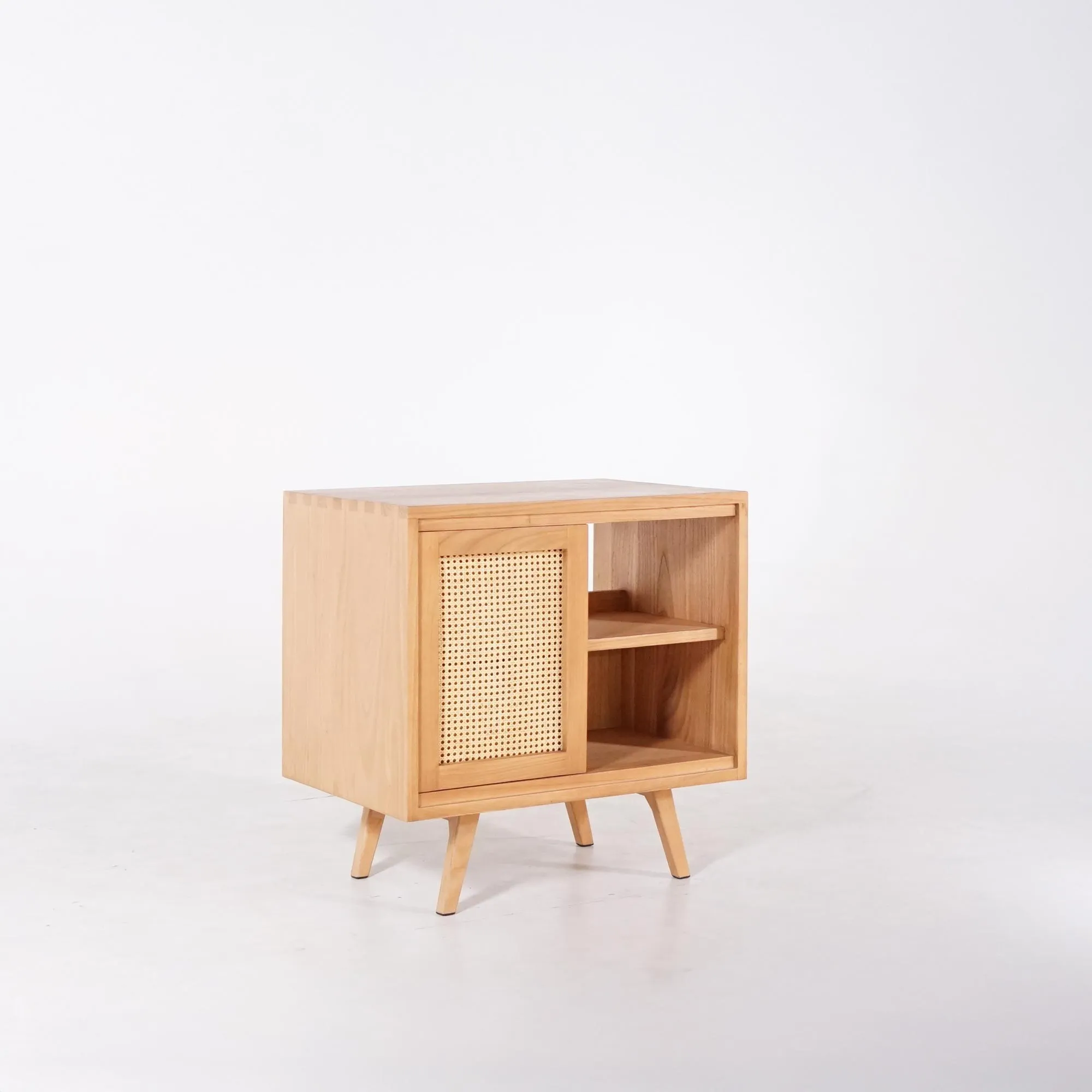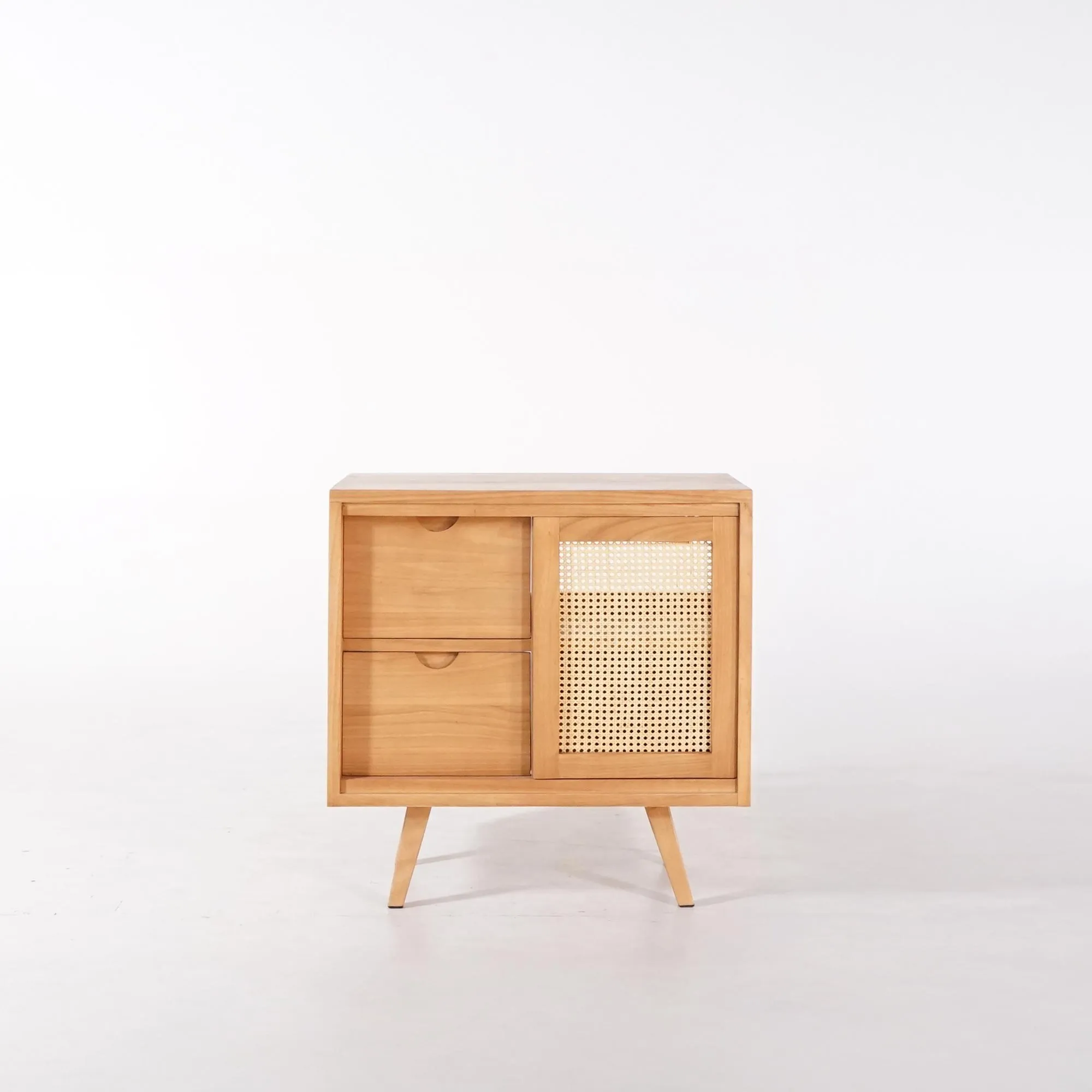Gefertigt aus massivem Mindi-Holz, einer Holzart, die für ihre Stabilität und natürliche Feuchtigkeitsbeständigkeit bekannt ist, besticht dieses Badezimmermöbel durch seine glatte Oberfläche und goldenen Nuancen, die sich je nach Lichteinfall sanft verändern. Jedes Paneel wird sorgfältig von Hand geschliffen und lackiert, um die feine Maserung des Holzes zu betonen, während die Schiebetür mit einer von Hand gewebten Front aus natürlichem Wiener Geflecht Authentizität und Eleganz verleiht.