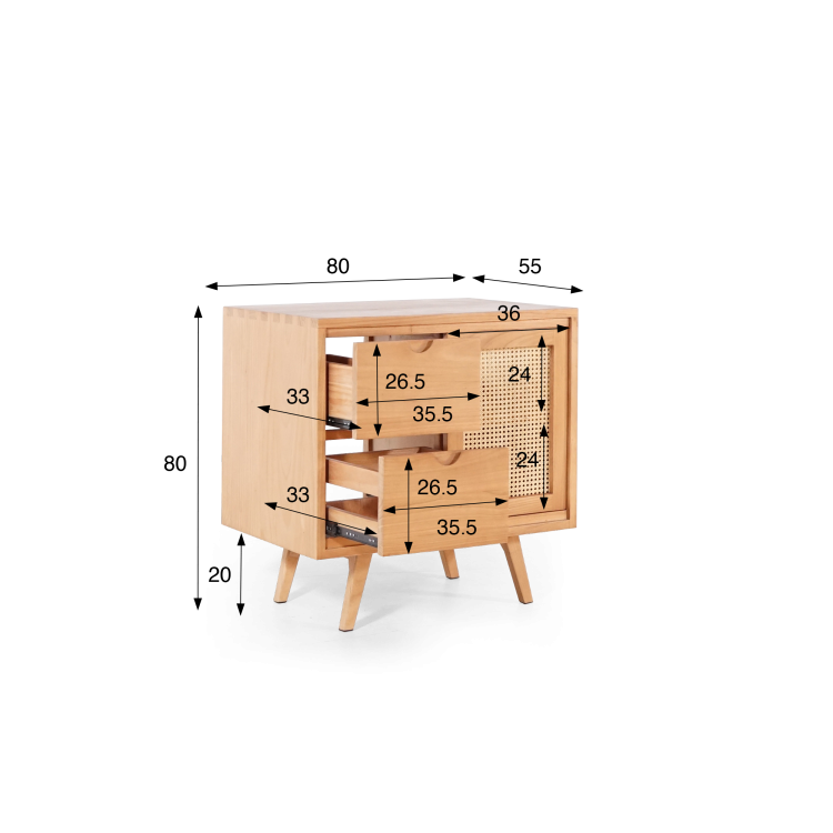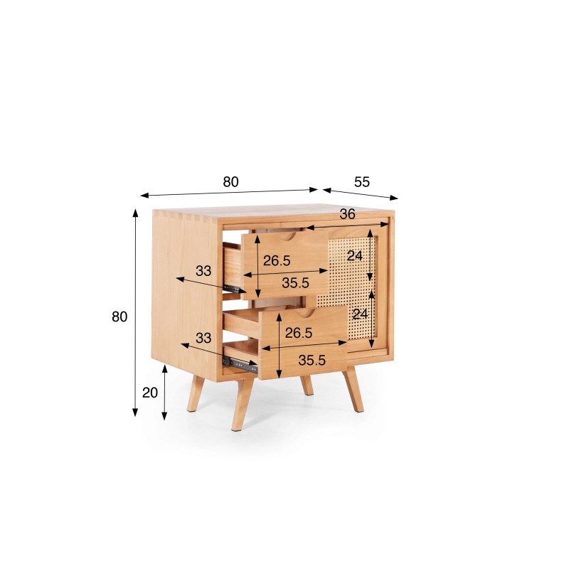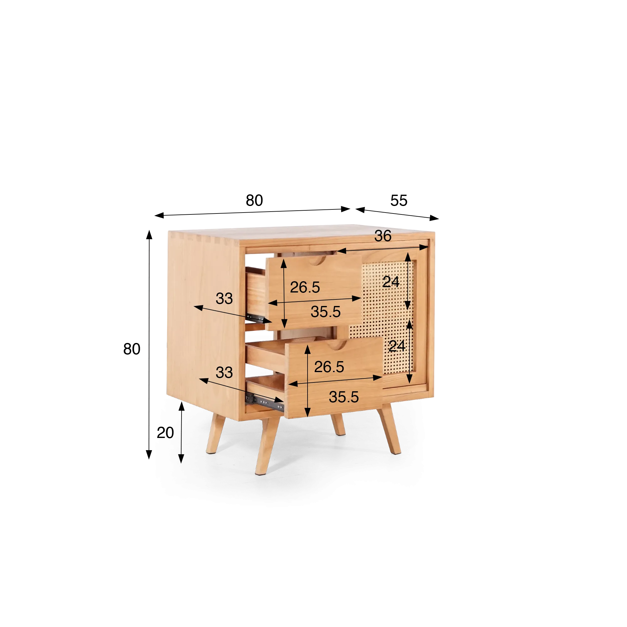 Der Innenraum dieses Badezimmermöbels aus Massivholz auf Füßen ist klar strukturiert und bietet optimalen Stauraum für den Alltag. Die beiden linken Seitenschubladen mit einer Tiefe von 33 cm und einer Höhe von 26,5 cm bieten Platz für Pflegeprodukte, Badutensilien oder Handtücher. Hinter der Schiebetür befindet sich ein geschlossenes Fach von 36 cm Breite und 48 cm Höhe, ideal zum Verstauen größerer Flaschen oder Gegenstände. Diese ausgewogenen Volumen ruhen auf einer robusten Struktur mit 20 cm hohen, schrägen Füßen aus Massivholz, die das Möbel optisch leichter wirken lassen und die Bodenreinigung erleichtern.