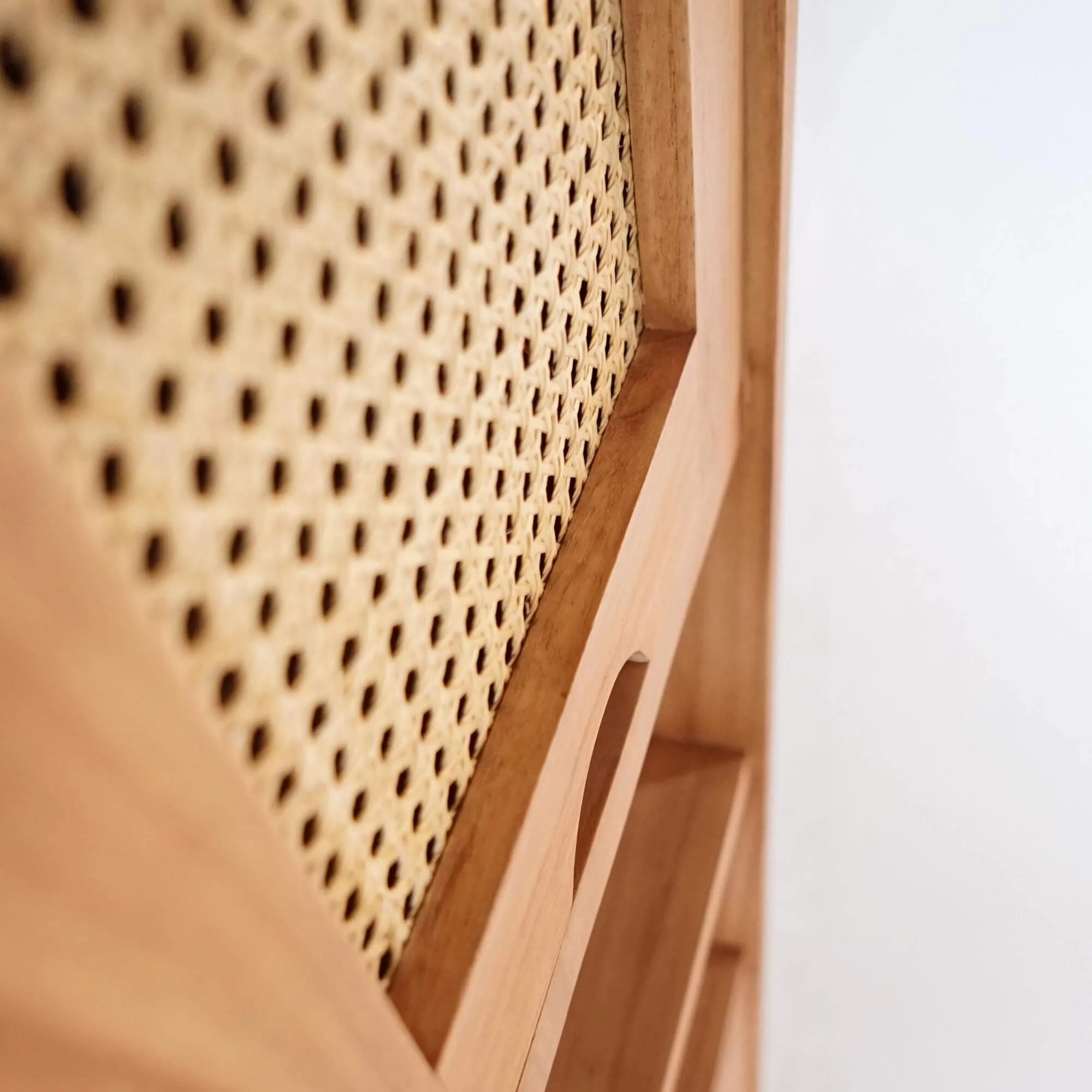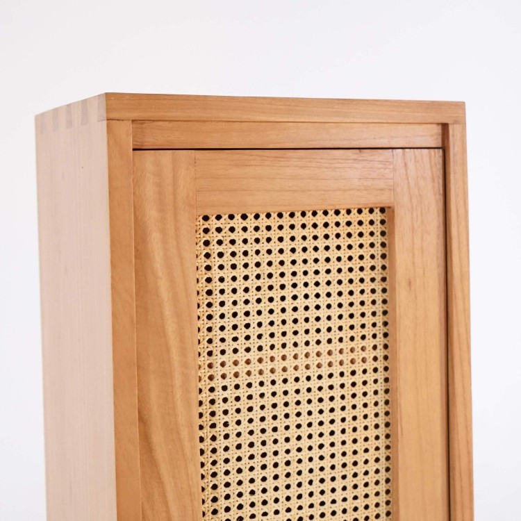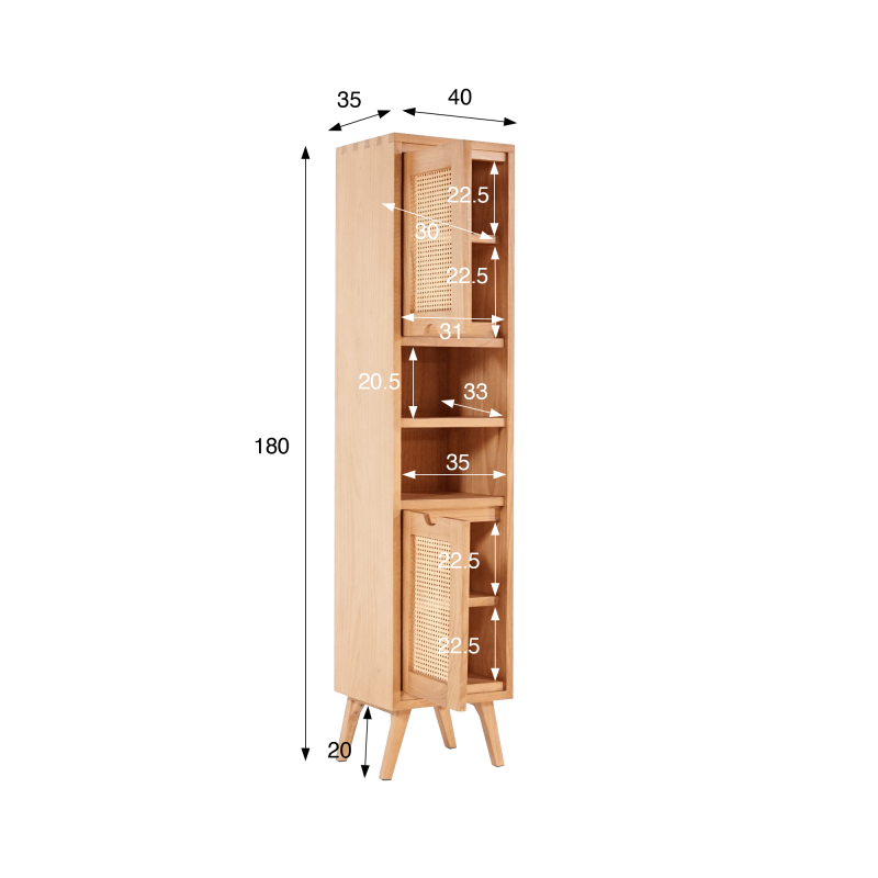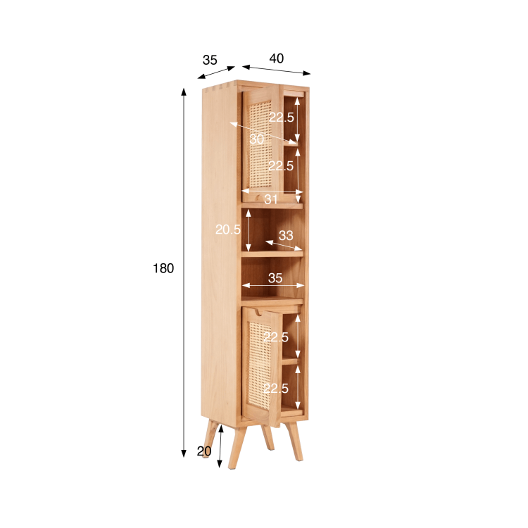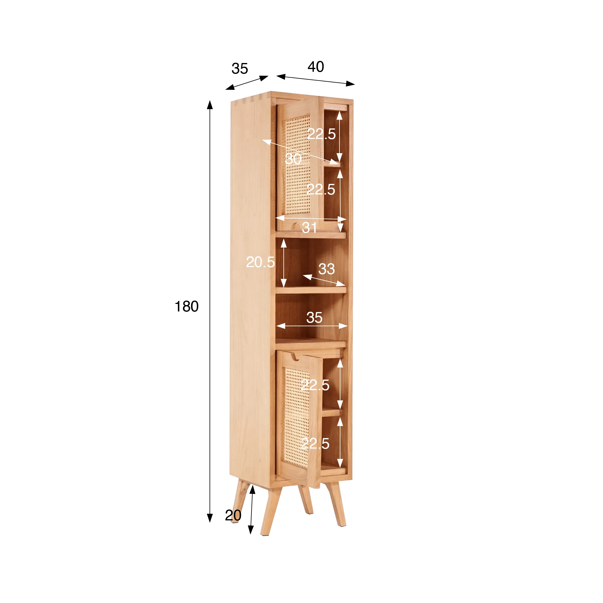 Das Innenlayout dieser Holz-Badezimmersäule besteht aus zwei offenen Nischen und zwei geschlossenen Fächern mit handgeflochtenen Wiener-Geflecht-Türen. Die Regalböden mit einer Tiefe von 35 cm und einer Höhe von 22,5 cm bieten flexible Ablageflächen für Handtücher, Pflegeprodukte oder Badaccessoires. Die dezenten, ins Holz eingelassenen Griffe unterstreichen die klare Linienführung, während die leicht geneigten, einfach zu montierenden Beine der Struktur Leichtigkeit und Stabilität verleihen.