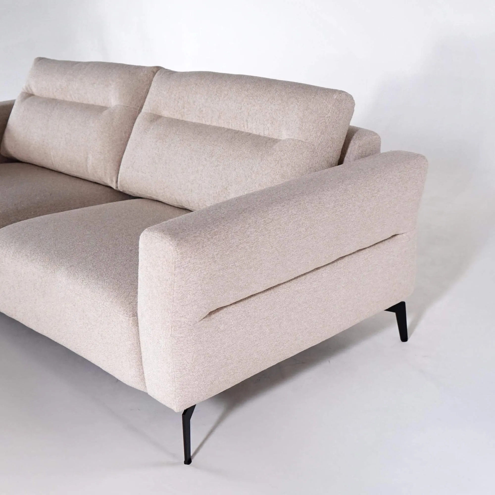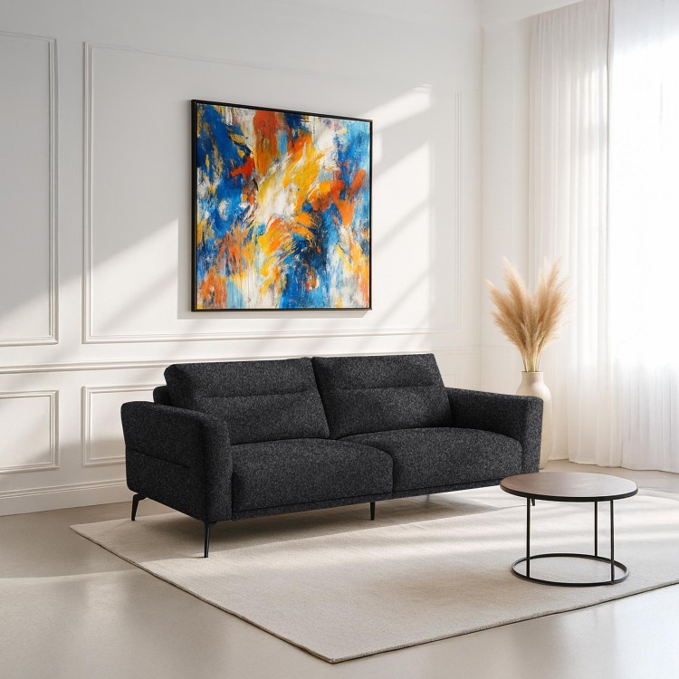 Der Bouclé-Stoff aus der Adventure-Kollektion, mit dem dieses moderne 3-Sitzer-Sofa bezogen ist, wurde wegen seiner warmen Textur und bewährten Widerstandsfähigkeit ausgewählt. Seine Zusammensetzung aus 100 % Polyester, getestet nach strengen Normen, verleiht ihm eine ausgezeichnete Haltbarkeit, mit einer Scheuerbeständigkeit von über 70.000 Martindale-Zyklen. Diese Materialwahl spiegelt unseren Qualitätsanspruch wider und bietet zugleich ein angenehmes Gefühl sowie zeitlose Eleganz in neutralen Tönen, die zu jedem Einrichtungsstil passen. Die 17 cm hohen schwarzen Metallfüße verleihen dem Ganzen eine moderne Note, verstärken die visuelle Leichtigkeit und sorgen zugleich für hohe Stabilität.