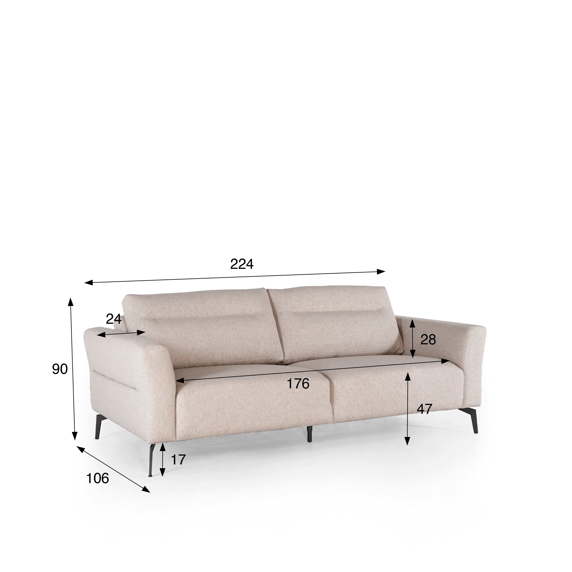 Wir haben die Ergonomie dieses modernen 3-Sitzer-Sofas besonders sorgfältig ausgearbeitet: Die tiefe Sitzfläche mit einer Höhe von 47 cm garantiert optimalen Komfort, unterstützt durch eine Polsterung aus Schäumen unterschiedlicher Dichte und mit Silikonfasern angereicherte Rückenkissen. Das Gesamtbild bietet eine weiche und großzügige Sitzqualität, die sowohl für gesellige Momente als auch für erholsame Pausen gedacht ist. Dieses moderne 3-Sitzer-Sofa misst 224 cm in der Breite, 90 cm in der Höhe und 106 cm in der Tiefe – eine ideale Größe für moderne Wohnräume, die Komfort und Eleganz suchen.