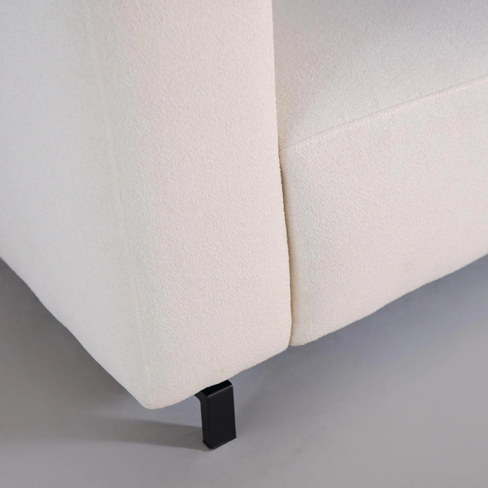 Die feinen, geometrischen Beine aus schwarzem Metall heben die Struktur an und verleihen ihr Leichtigkeit und Modernität. Ihre Schlichtheit unterstreicht die Reinheit der Form und betont den Kontrast zum hellen Bezug.