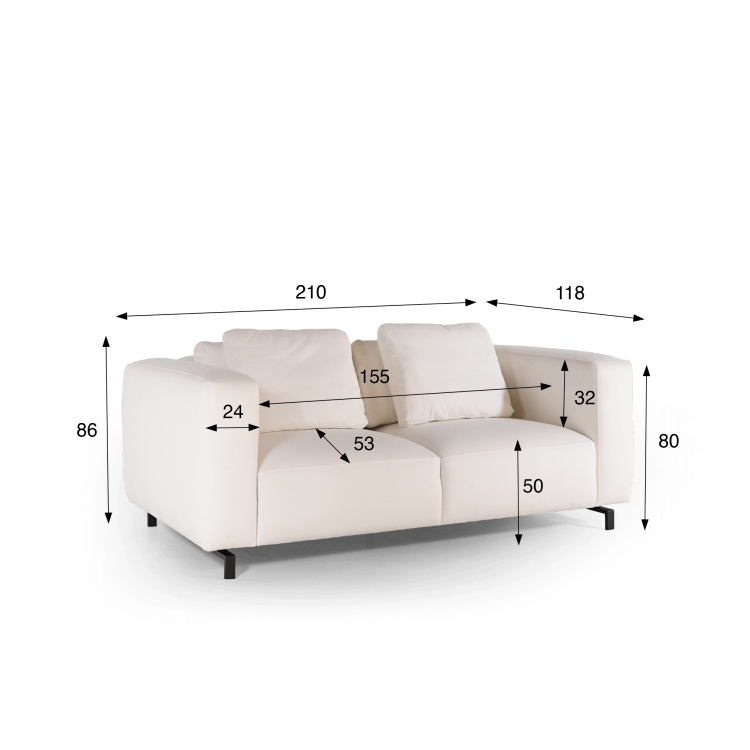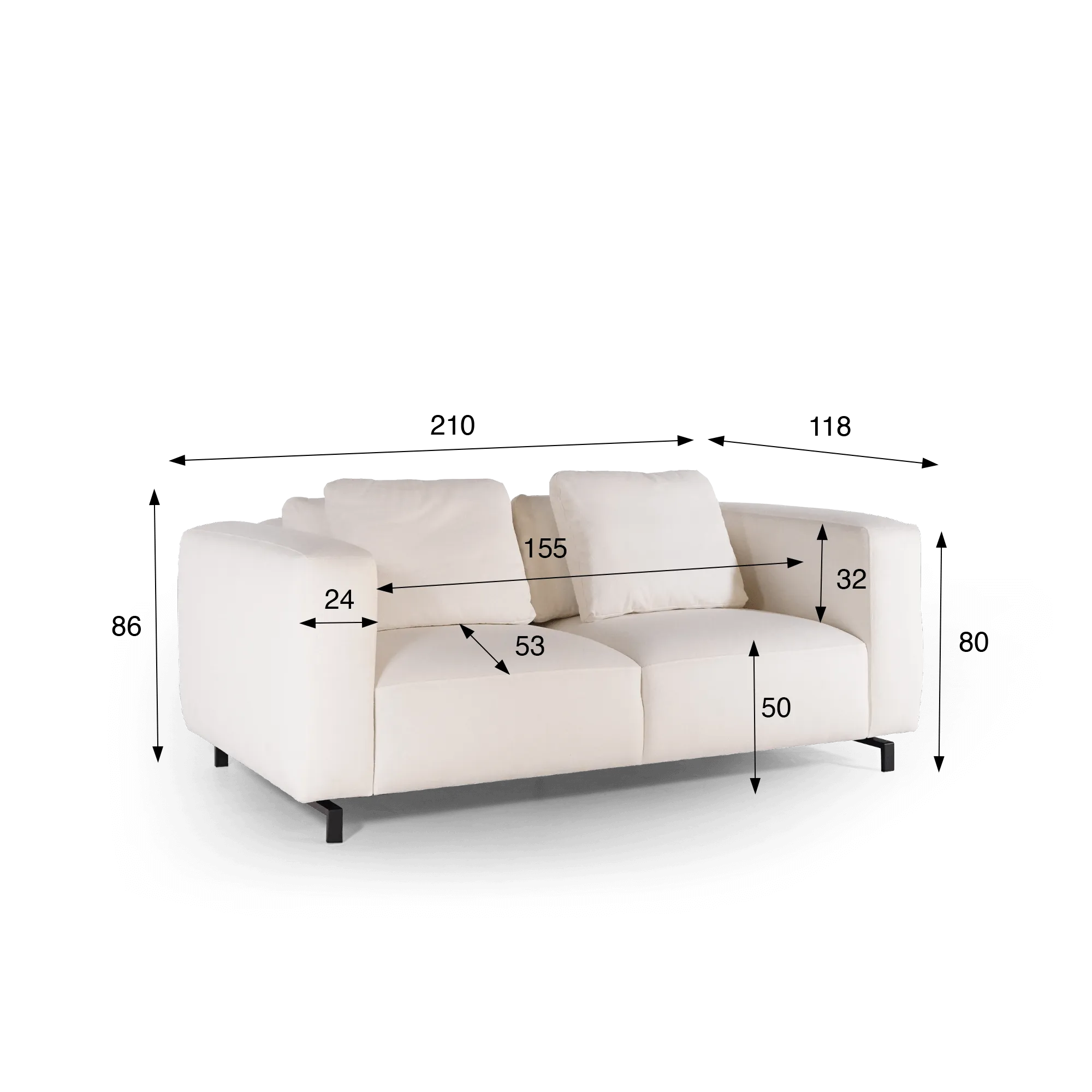 Das moderne 3-Sitzer-Sofa Miro besteht aus einer robusten Struktur aus Kiefernholz, Buchenholz und Sperrholz, die eine stabile und langlebige Basis bietet. Die handwerklich gefertigte Polsterung kombiniert hochelastischen Schaumstoff mit gekreuzten Gurtbändern für optimalen Sitzkomfort. Die abnehmbaren, weichen Rückenkissen verstärken das Gefühl von Behaglichkeit und Entspannung. Mit einer Länge von 210 cm, einer Tiefe von 118 cm und einer Höhe von 86 cm bietet es großzügigen Platz, perfekt proportioniert für drei Personen.
