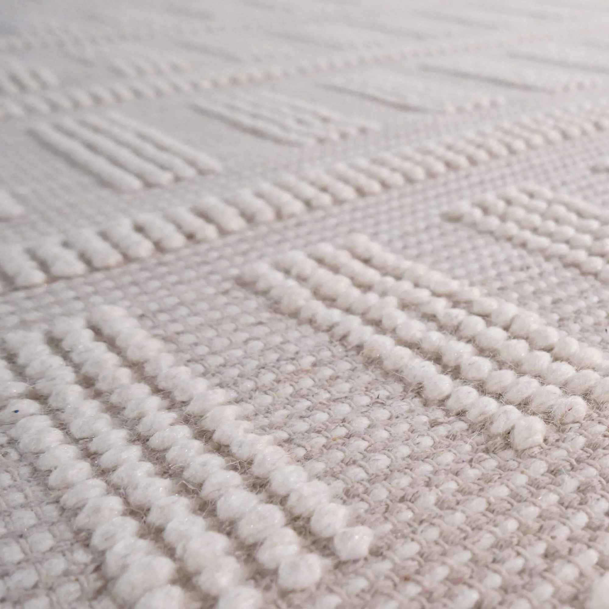 Der Wollteppich Vela wird vollständig von Hand gefertigt und besteht aus 100 % natürlicher Wolle. Dieses Material, das wir sowohl wegen seiner Robustheit als auch seines Komforts gewählt haben, fühlt sich weich und warm an und ist angenehm unter den Füßen. Mit einer Stärke von etwa 4 mm behält dieser Wollteppich eine schöne Struktur, bleibt dabei aber leicht unter einem Sessel, einem Couchtisch oder in einem Durchgangsbereich integrierbar. Die Wolle entfaltet hier ihre ganze Tiefe: Sie fängt das Licht auf subtile Weise ein, nuanciert den beige-weißen Farbton und erzeugt eine visuelle Tiefe, die sich im Laufe des Tages verändert.