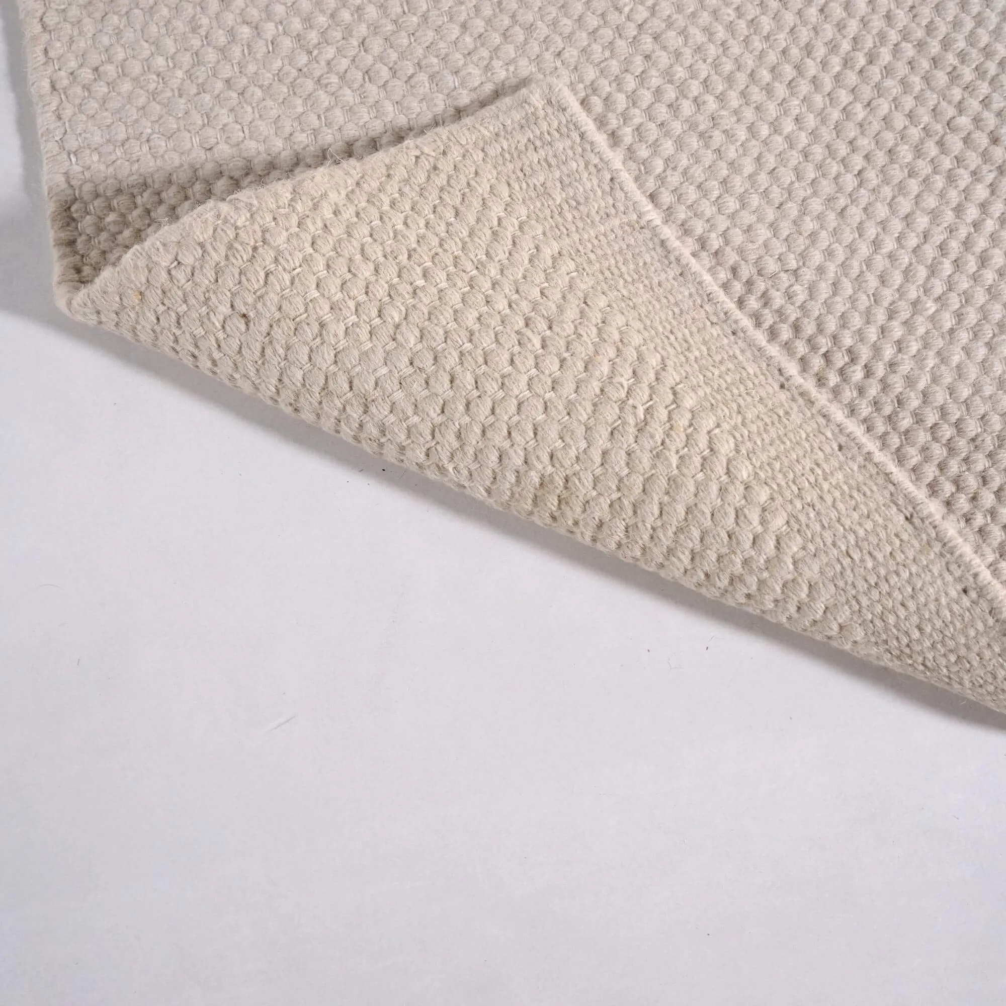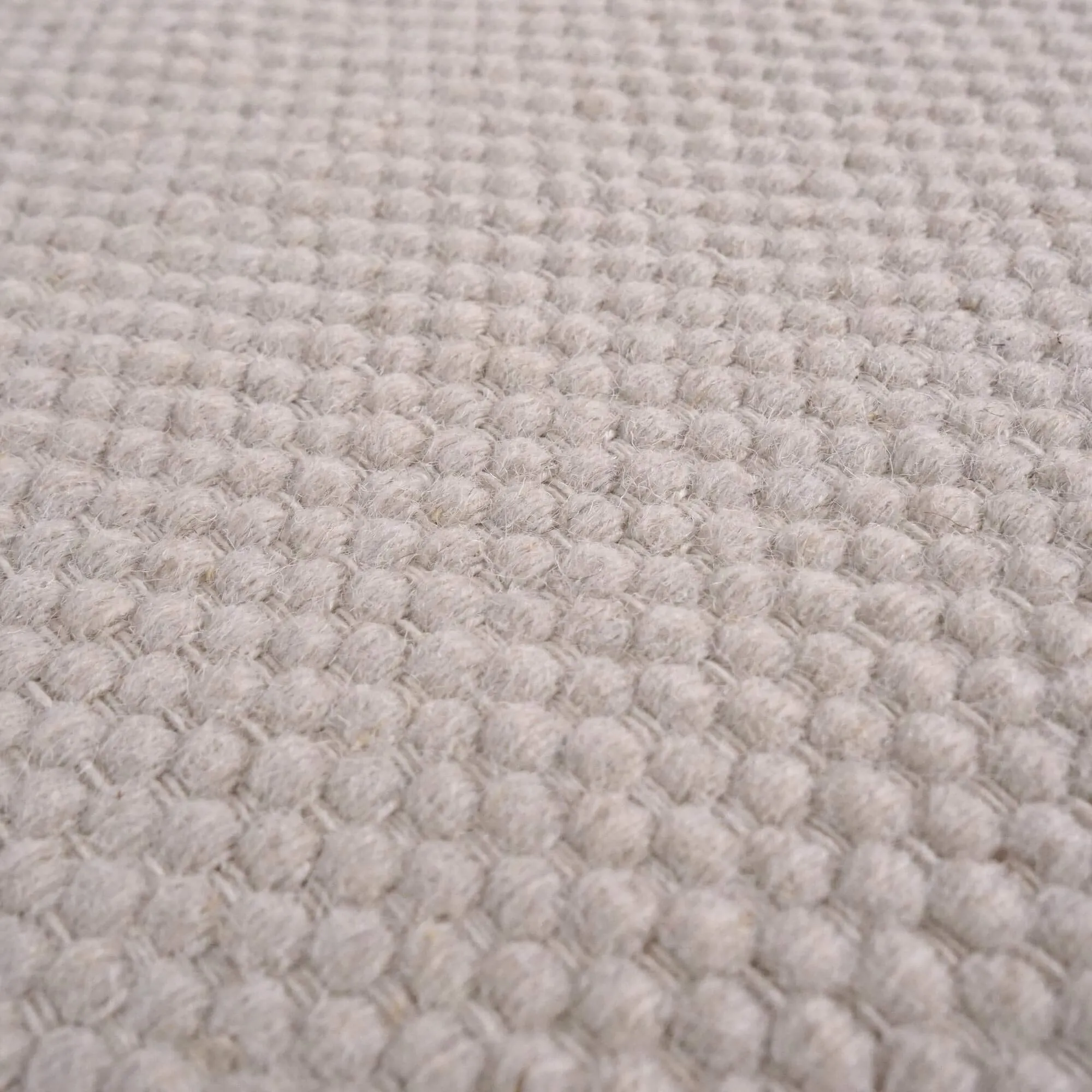 Dieser Teppich aus Wolle und Baumwolle wird vollständig von Hand gefertigt und kombiniert einen überwiegenden Anteil an Wolle mit einem feinen Anteil Baumwolle – ein ausgewogenes Zusammenspiel für den Alltag. Die Wolle sorgt für natürliche Wärme, eine dezente Weichheit und die Fähigkeit, Licht einzufangen, während die Baumwolle das Gewebe verfeinert und die Formstabilität über die Zeit erhöht. Das Ergebnis ist eine subtil strukturierte Oberfläche, angenehm unter den Füßen, mit einem feinen Relief, das mit weißen und grauen Nuancen spielt, ohne starke Kontraste zu erzeugen. Mit einer Stärke von etwa 4 mm bewahrt unser Woll- und Baumwollteppich Iria eine schlanke Silhouette, die sich mühelos in den Wohnraum integrieren lässt, ohne das Öffnen von Türen oder den Durchgang zu beeinträchtigen.