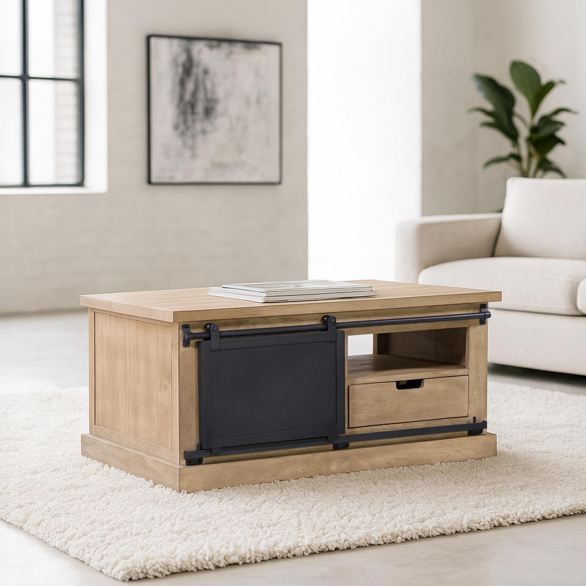 Der Kontrast zwischen der warmen, hellen Holzfarbe und der markanten Schiebetür aus anthrazitfarbenem Metall unterstreicht den industriellen Charakter des Möbels. Dieses Zusammenspiel der Materialien verleiht dem Tisch einen zeitlosen, starken Stil. Jedes Detail wurde sorgfältig durchdacht – von den sichtbaren Schienen bis zum klaren Sockel –, um eine ausgewogene und charaktervolle Silhouette zu schaffen.