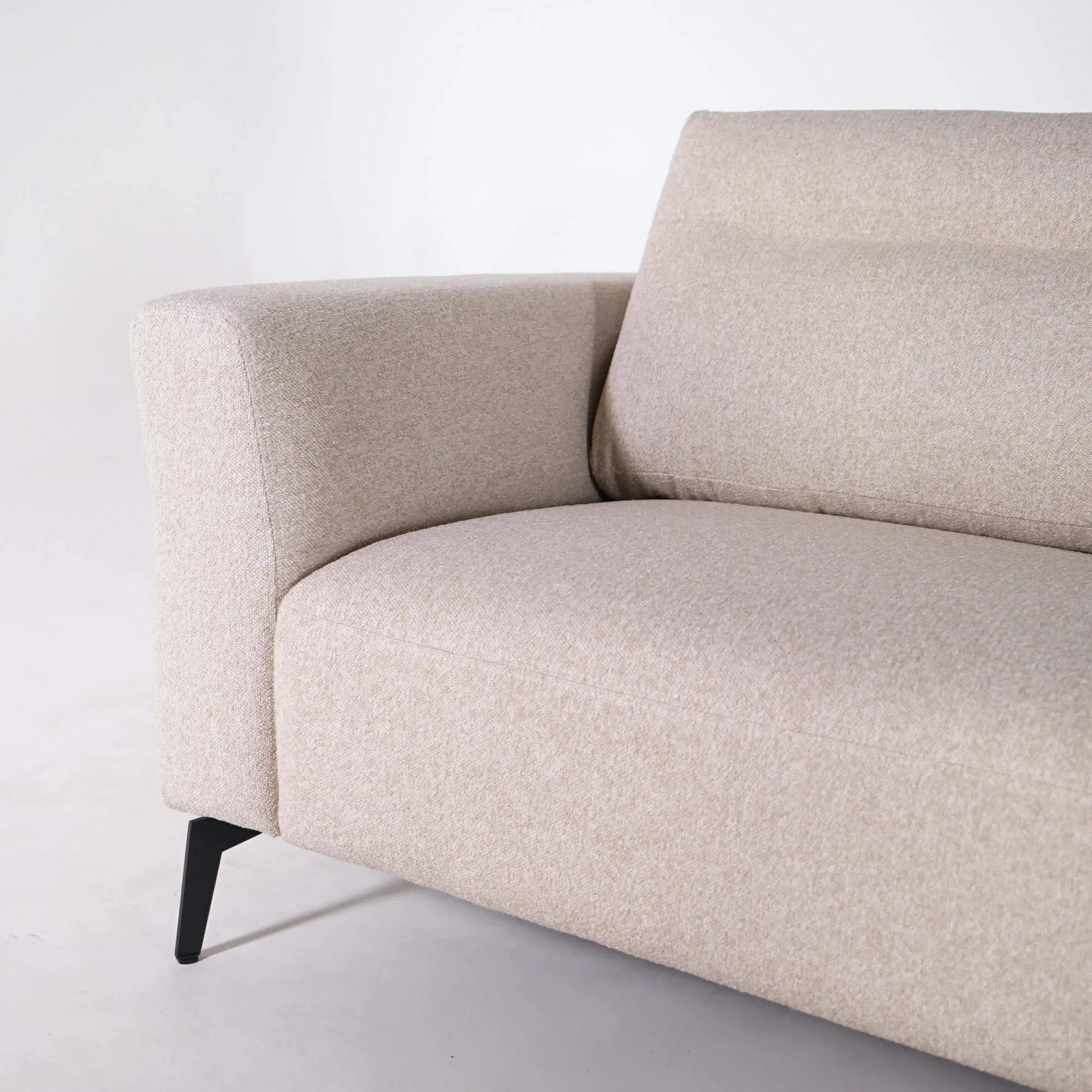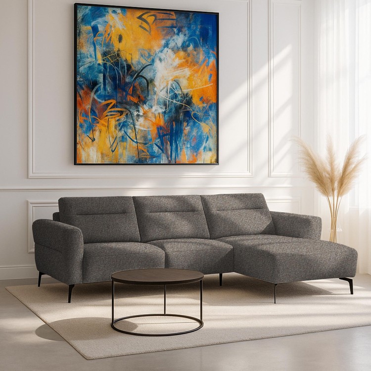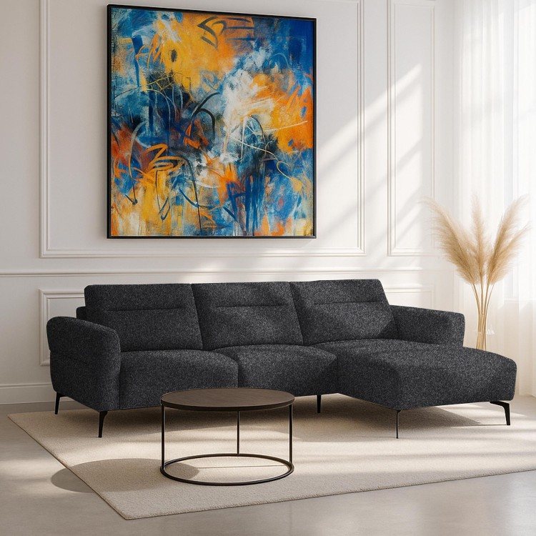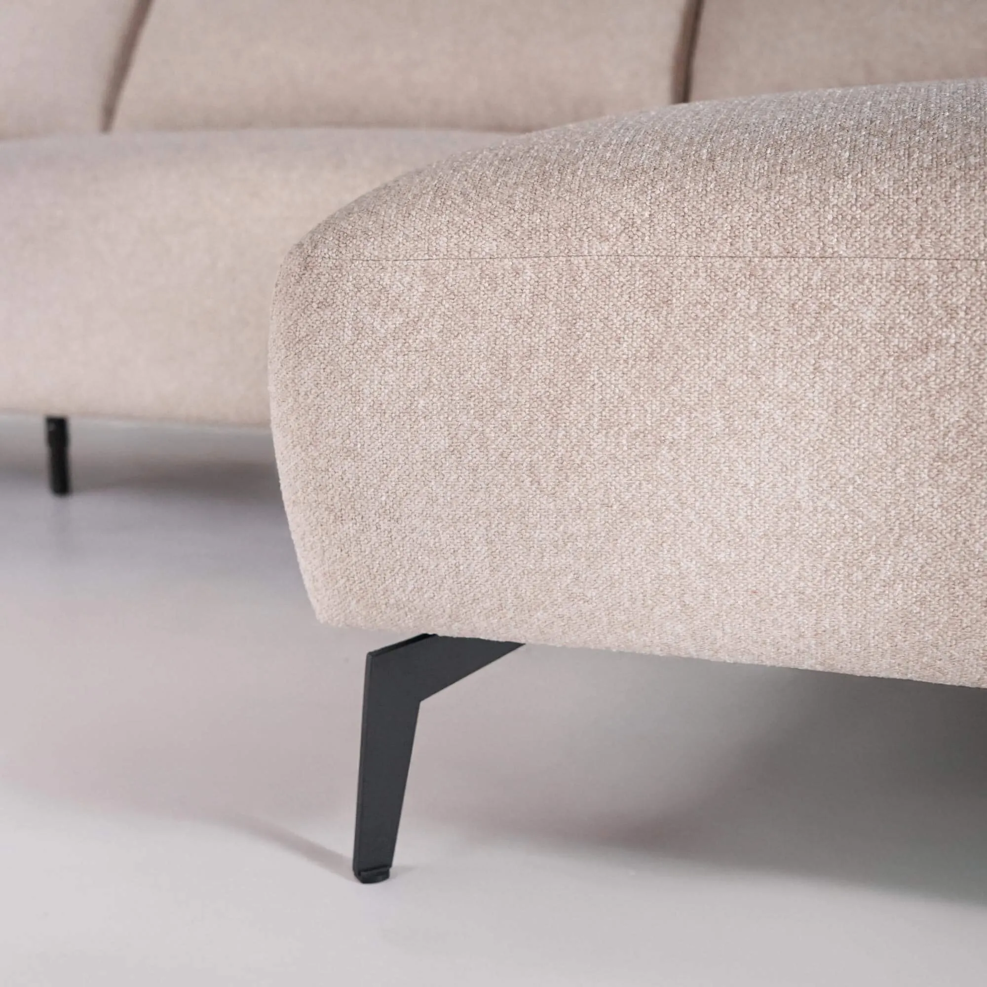Für die Bezüge dieses Ecksofas mit 4 Sitzplätzen und rechter Meridienne haben wir einen hochwertigen, strukturierten Stoff aus 100 % Polyester gewählt, der zugleich weich und strapazierfähig ist. Seine subtile Textur verleiht eine warme optische und haptische Dimension, die elegant mit den schlanken, 17 cm hohen Beinen aus schwarzem Metall kontrastiert, welche die Struktur optisch leichter wirken lassen. Der Stoff wurde auf Belastbarkeit getestet, bietet eine hervorragende Abriebfestigkeit (70.000 Martindale-Zyklen) und behält seine Form im Alltag – ein zuverlässiger und langlebiger Bezug.