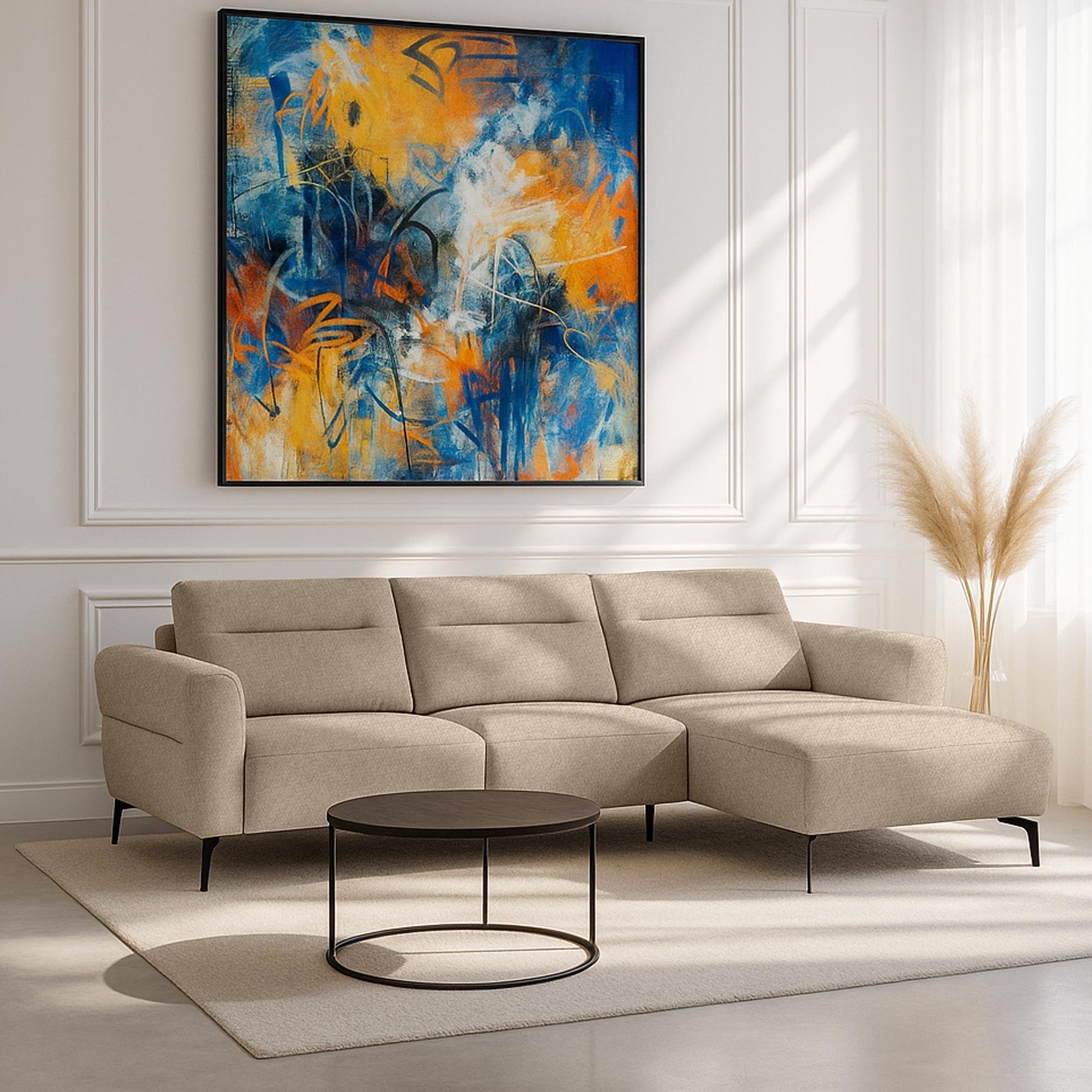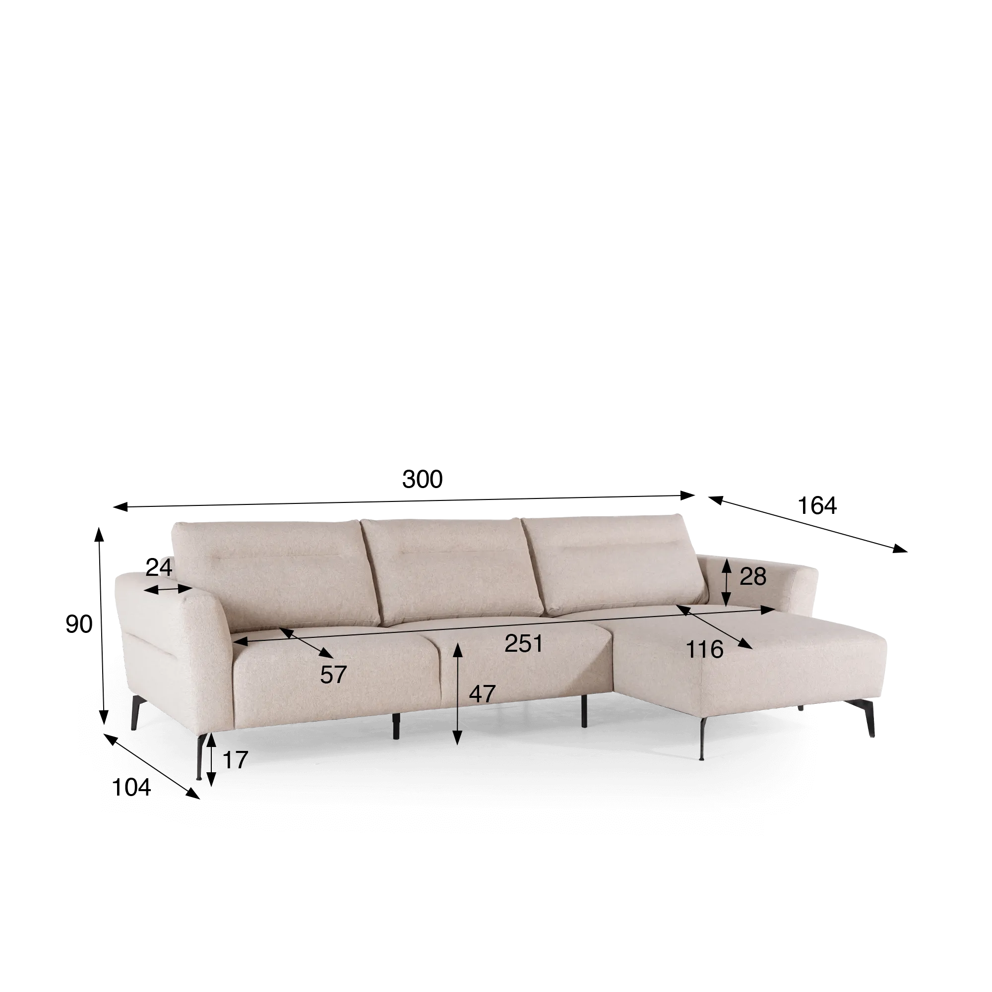 Mit einer Länge von 300 cm und einer Gesamttiefe von 164 cm bietet dieses Ecksofa mit 4 Sitzplätzen und rechter Meridienne großzügigen Platz – ideal sowohl für entspannte Momente als auch für gemeinsame Augenblicke. Die Meridienne verlängert die Linie des Sofas harmonisch, sodass man bequem liegen kann, während die Sitzhöhe von 47 cm eine natürliche und ergonomische Haltung gewährleistet.