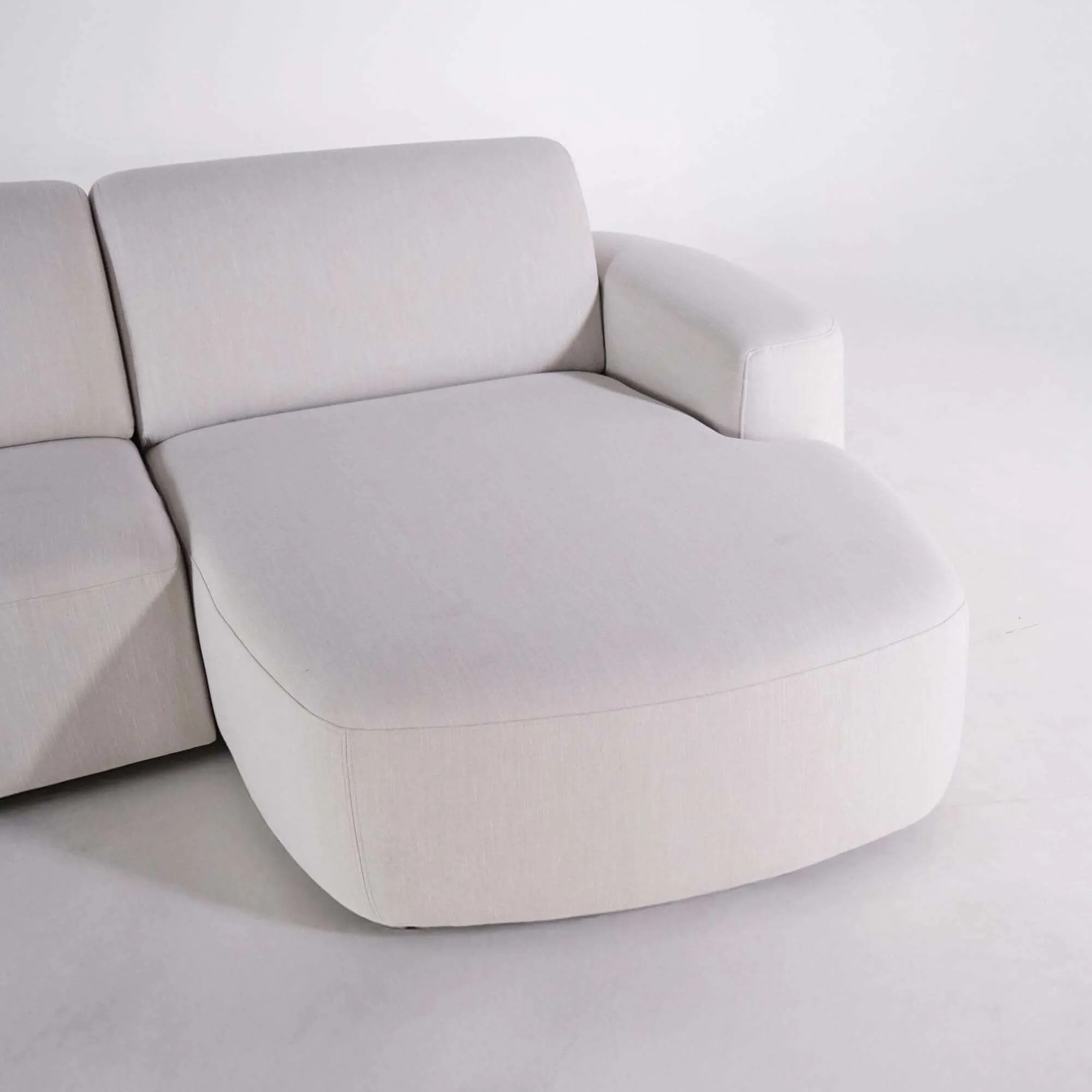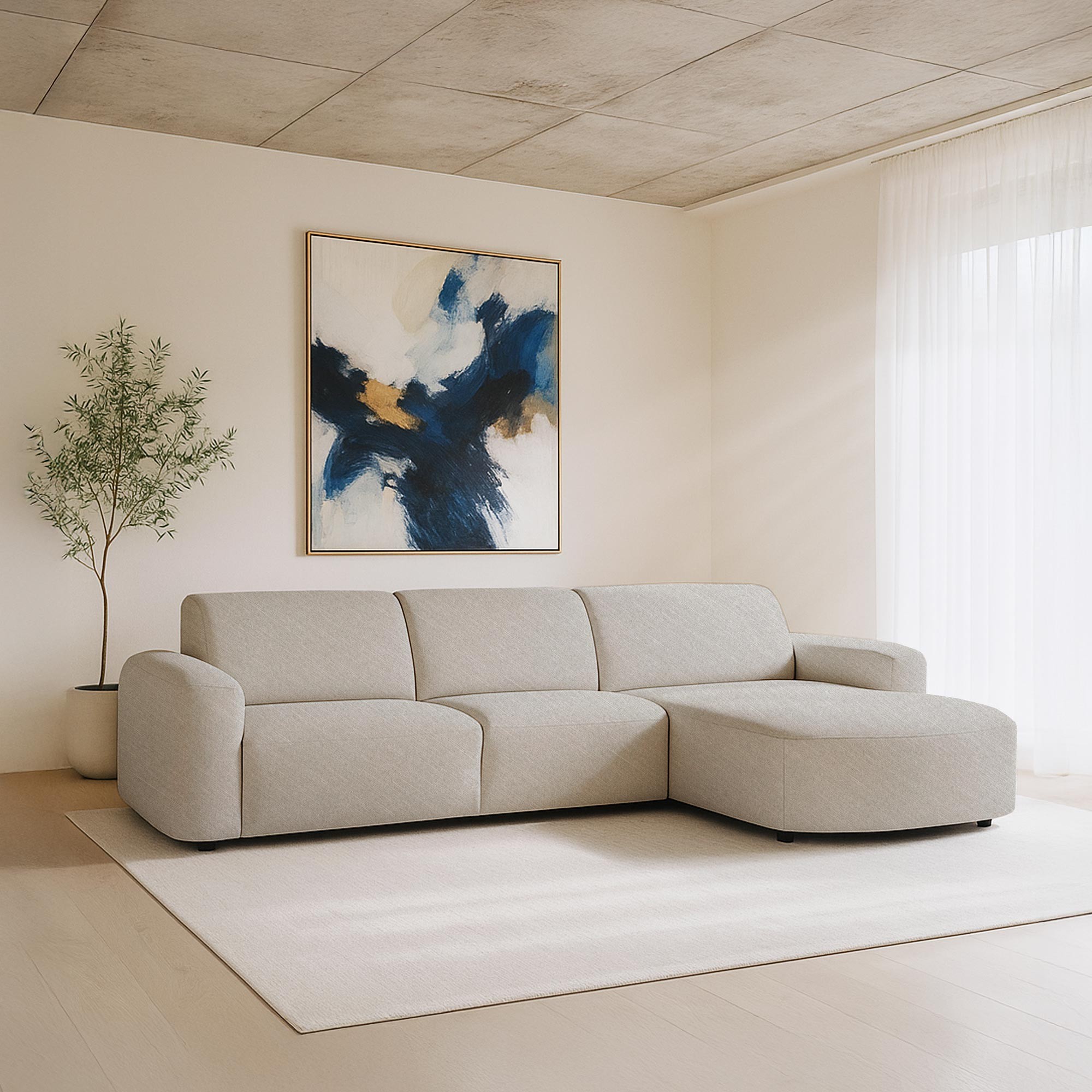 Unsere Designer haben das Ecksofa mit rechter Ottomane und 4 Sitzplätzen Kala als eine Einladung zur Entspannung entworfen – ein Modell, in dem die Sanftheit der Formen mit außergewöhnlicher Handwerkskunst verschmilzt. Dieses große Ecksofa mit rechter Ottomane und 4 Sitzplätzen besticht durch seine zeitgemäße Ausstrahlung und sein umhüllendes Komfortgefühl. Die bewusst schlichten, abgerundeten Linien erinnern an ein modernes, minimalistisches Design, das sowohl in einem hellen Interieur als auch in einem gedämpften Wohnraum perfekt zur Geltung kommt.