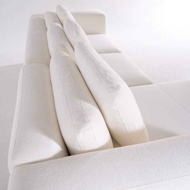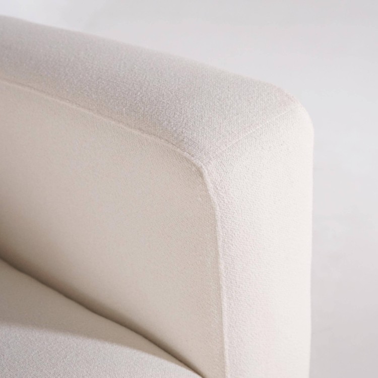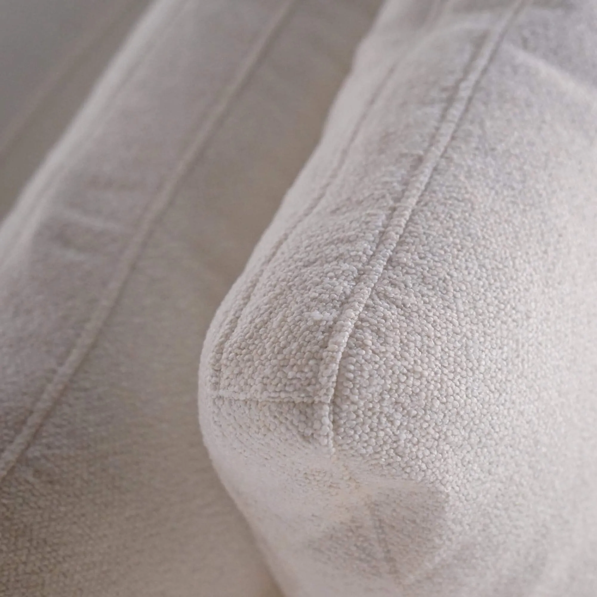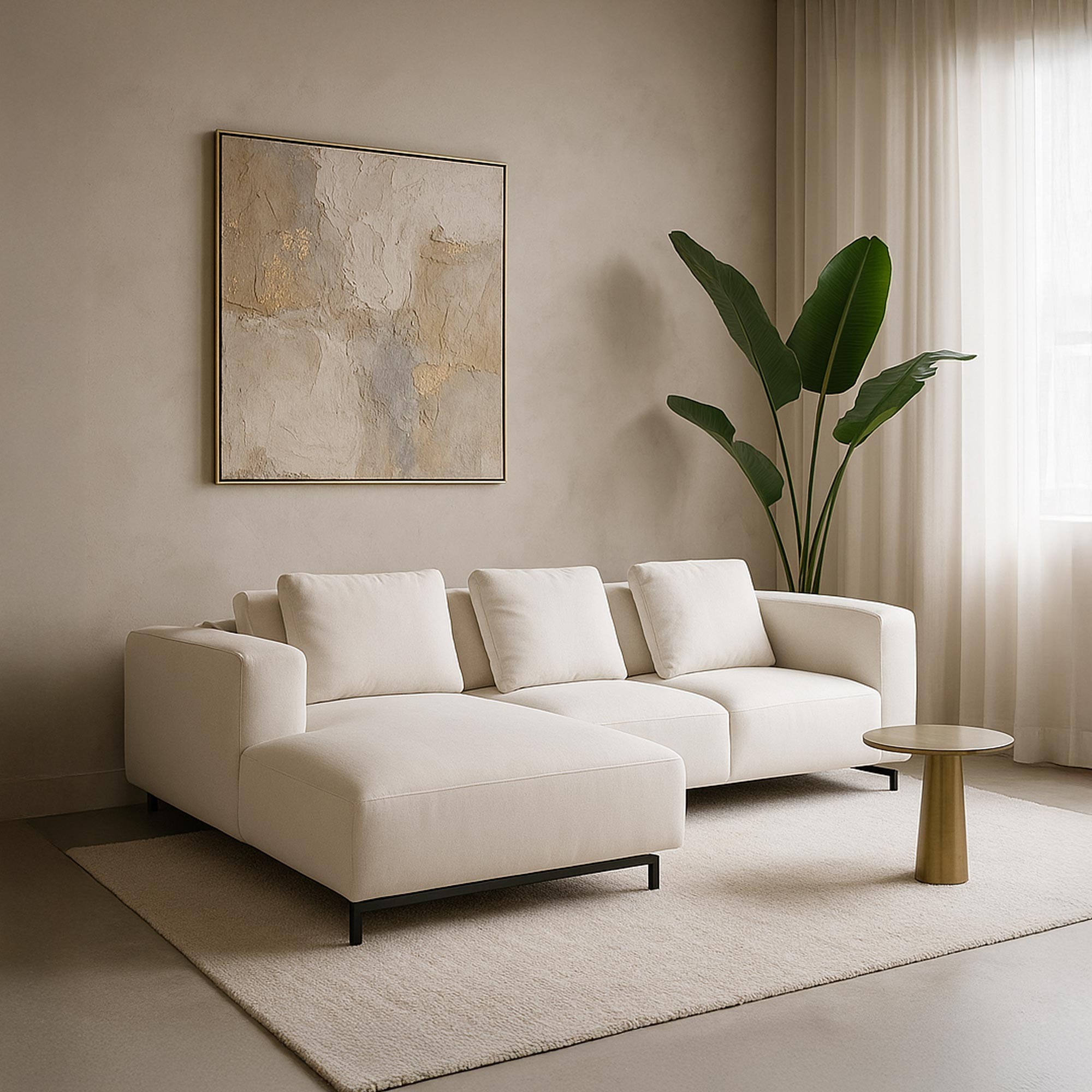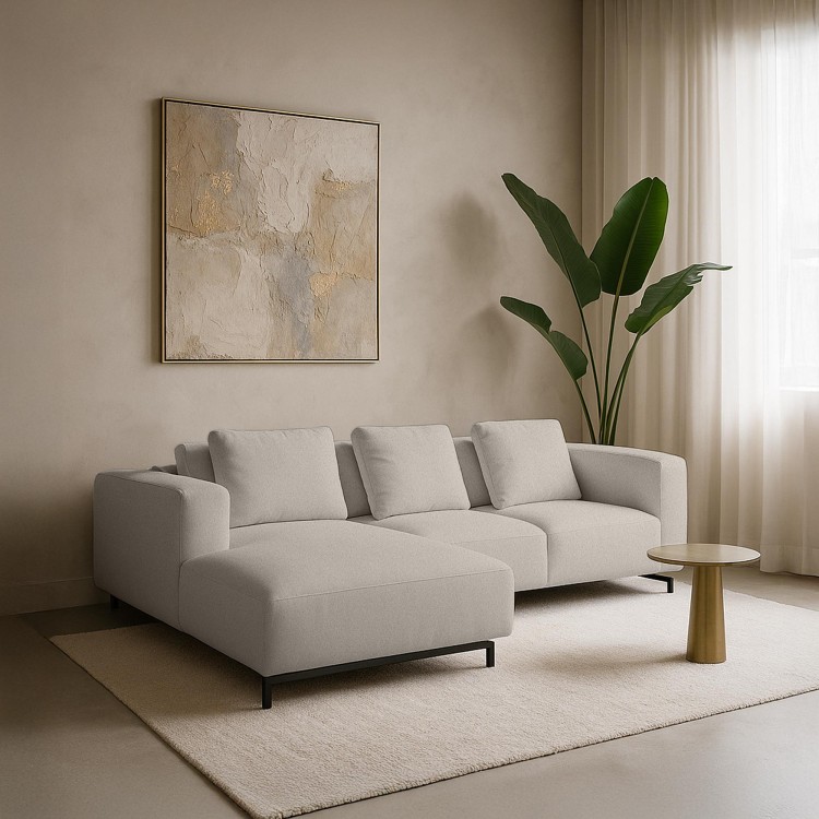 Der für unser Ecksofa Miro mit linker Ottomane gewählte Stoff besticht durch seine weiche, leicht strukturierte Oberfläche, die angenehm im Griff und widerstandsfähig im täglichen Gebrauch ist. Dank seiner schützenden Beschichtung ist er pflegeleicht, während seine Dichte eine hervorragende Formbeständigkeit gewährleistet. Der helle, lichtdurchflutete Farbton des Stoffes unterstreicht die Reinheit des Designs und fügt sich harmonisch in alle Einrichtungsstile ein – vom skandinavischen Minimalismus bis hin zu einem warmen, modernen Ambiente.