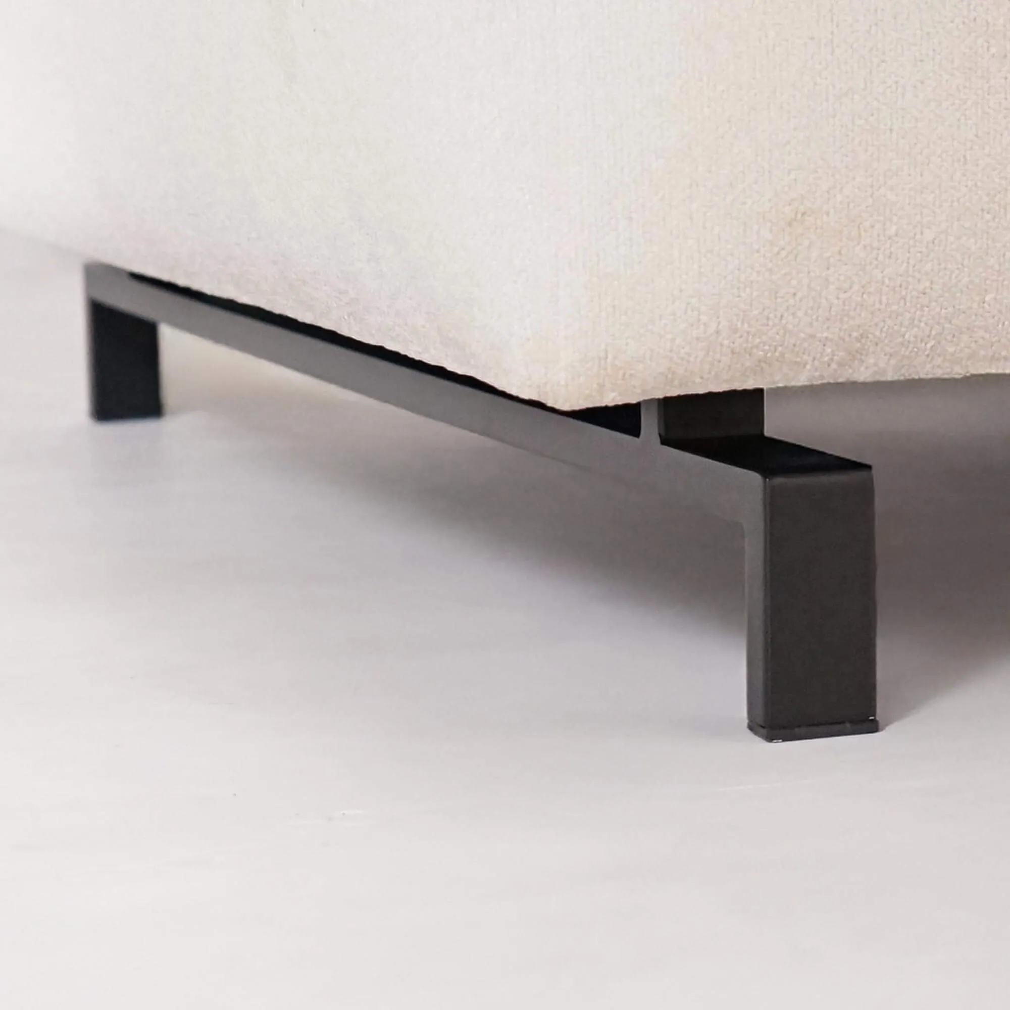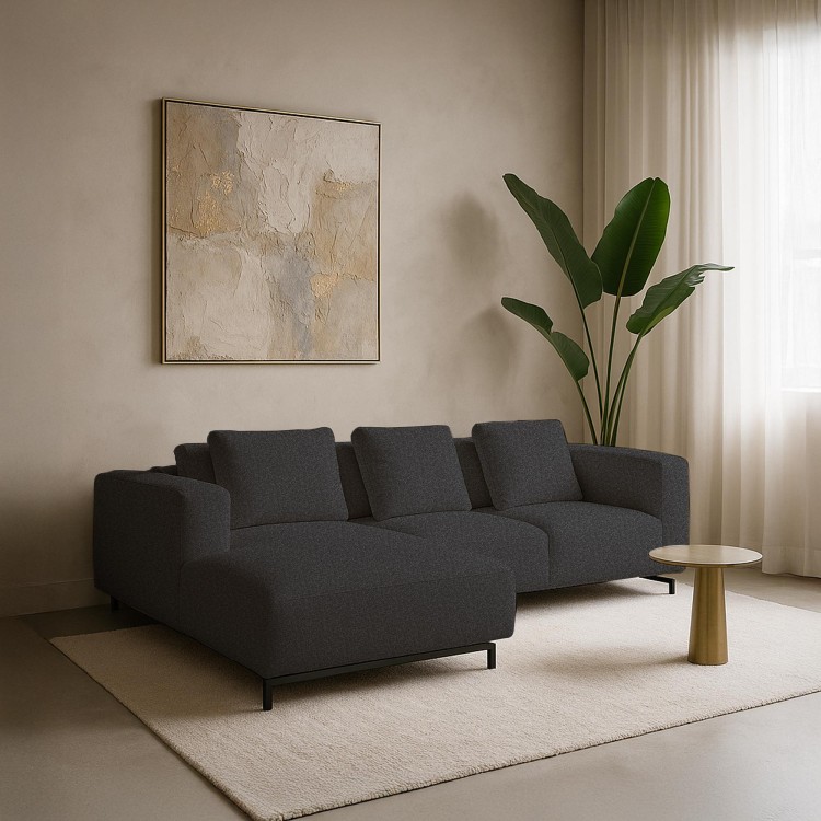 Die schlanken, mattschwarzen Metallfüße verleihen dem Ganzen eine gewisse Leichtigkeit und betonen gleichzeitig den modernen Charakter dieses Ecksofas mit linker Ottomane. Ihre schlichte Geometrie bildet einen subtilen Kontrast zur Weichheit des Stoffes und verleiht dem Gesamtbild eine grafische Note.