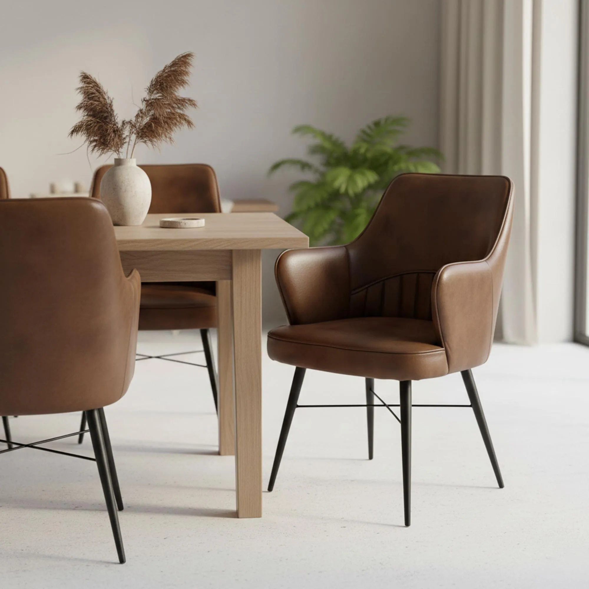Wir haben diesen vintage Lederstuhl mit Armlehnen als Balancepunkt zwischen Charakter und Komfort entworfen. In Kombination mit unseren Esstischen aus Massivholz entsteht ein harmonisches Ensemble, in dem natürliche Materialien mit Konsequenz und Authentizität miteinander in Dialog treten.