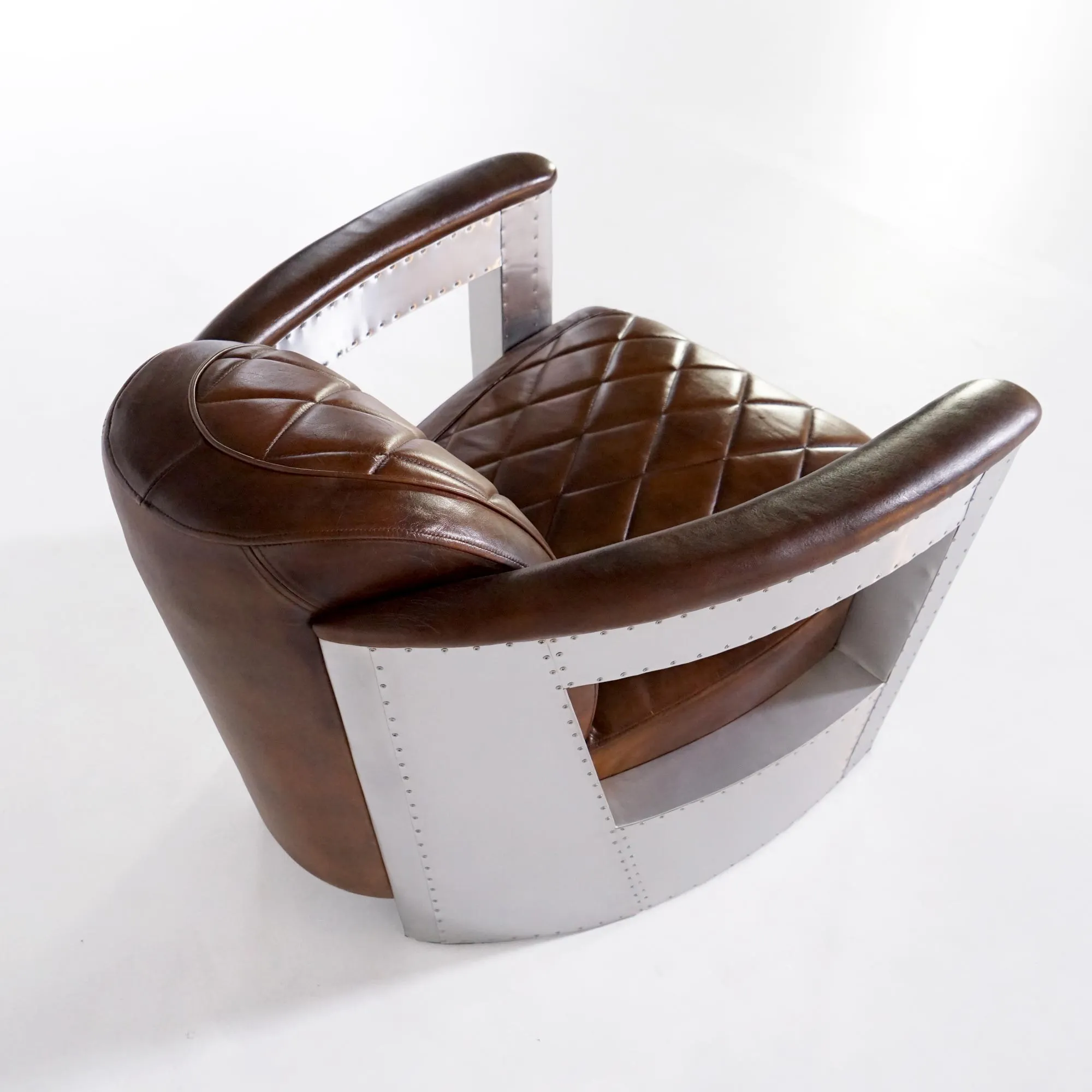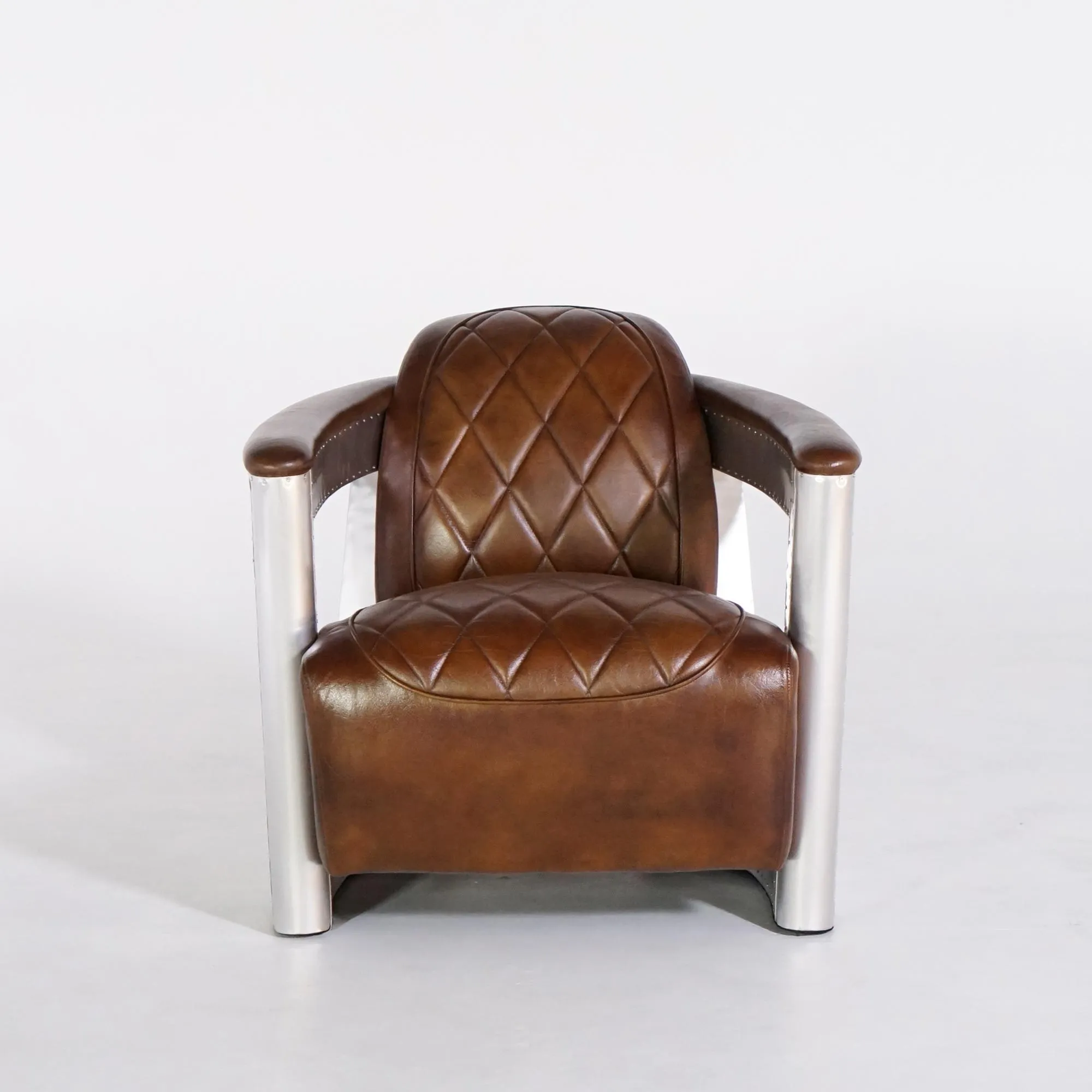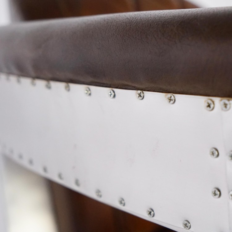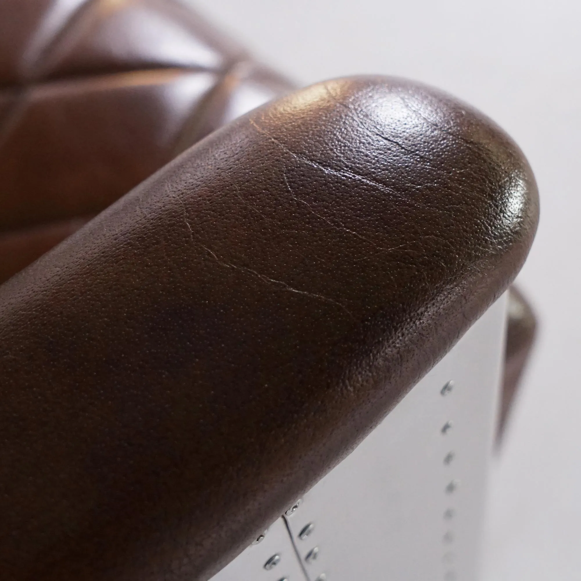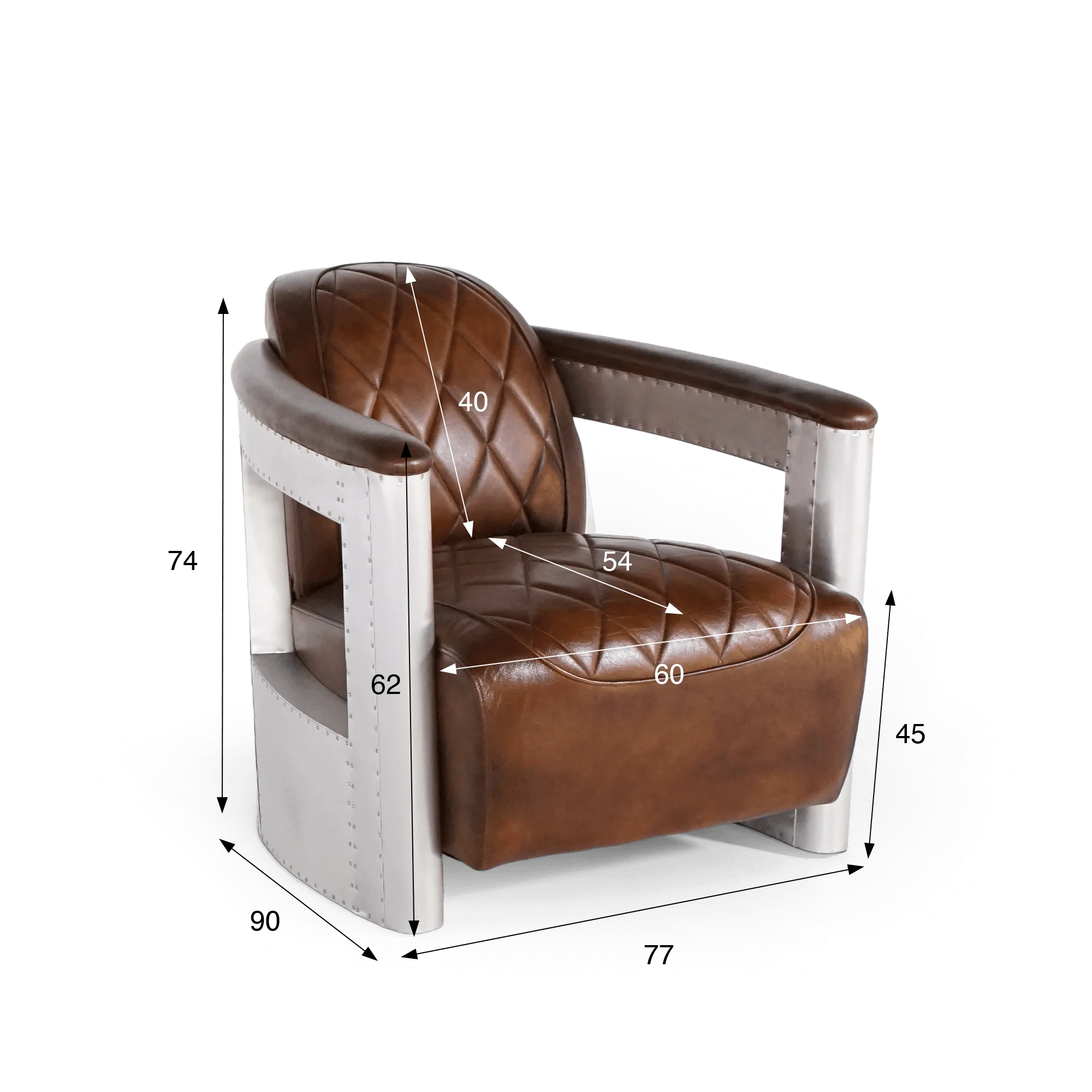 Die Konstruktion dieses Aviator-Ledersessels unterstreicht seine Inspiration durch Seitenflächen aus vernietetem Metall. Der Kontrast zwischen dem braunen Leder und dem hellen Metall schafft eine starke visuelle Balance, ohne jemals ins Übertriebene zu kippen. Die breiten, leicht abgerundeten Armlehnen dieses Aviator-Ledersessels begleiten die Bewegung und bieten natürlichen Halt, während die Proportionen – etwa 77 cm Breite bei 90 cm Tiefe – großzügiges Sitzen ermöglichen, ohne den Raum zu dominieren. Die Sitzhöhe, nahe 45 cm, ist für optimalen Komfort ausgelegt – ob beim Lesen oder für eine längere Auszeit.