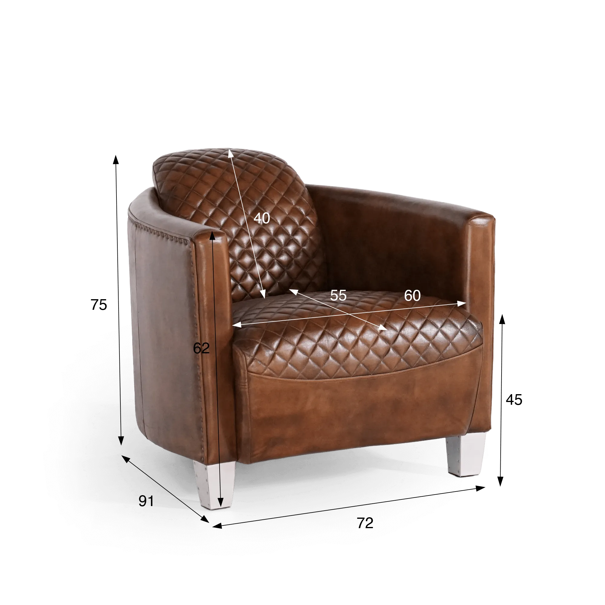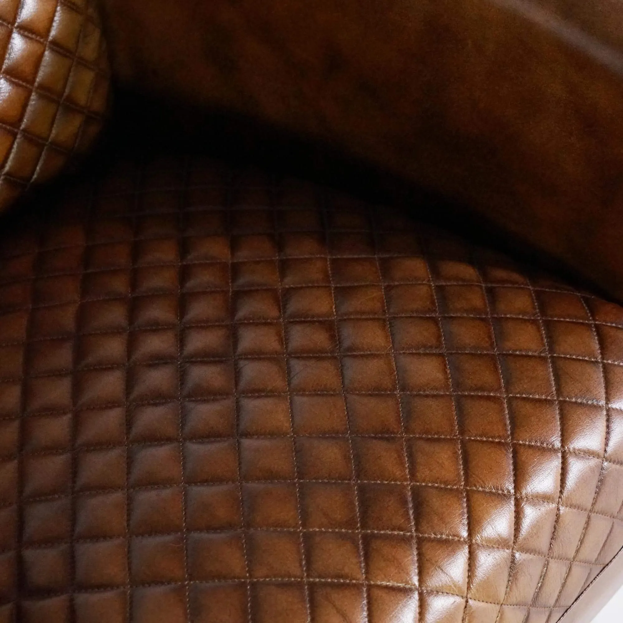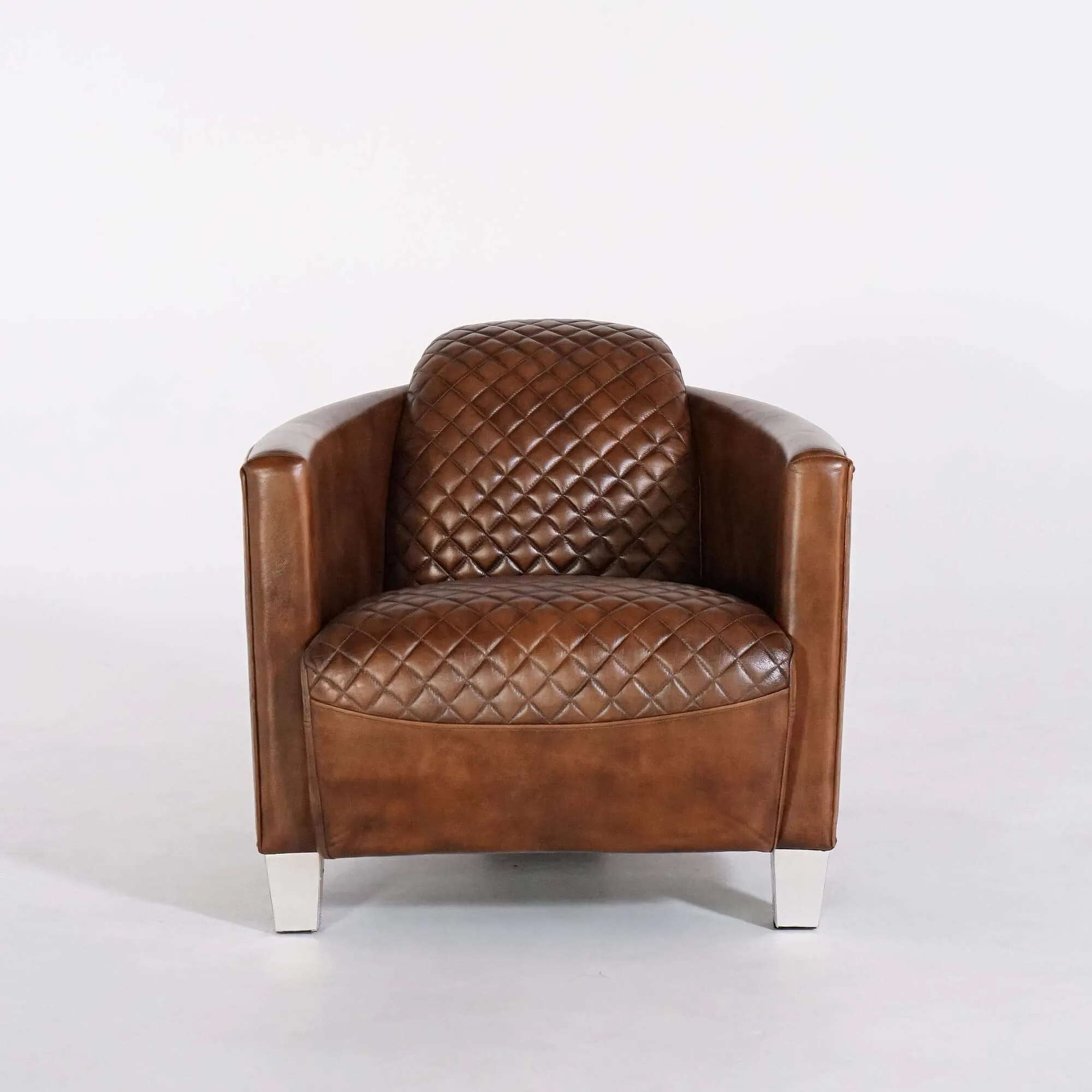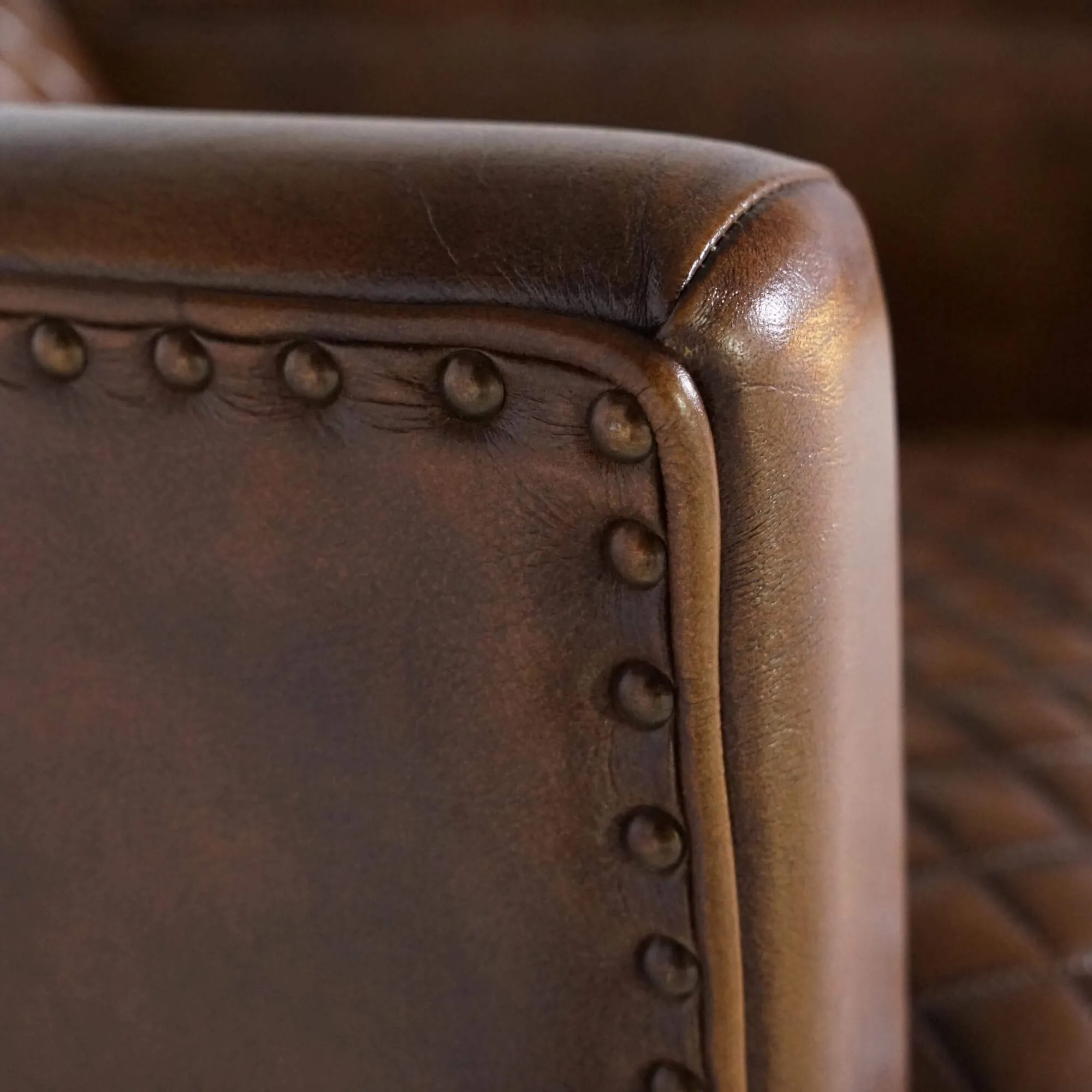 Das braune Vollnarbenleder steht im Mittelpunkt des Projekts. Wir haben es wegen seines geschmeidigen Griffs, der lebendigen Narbung und der Patina gewählt, die sich mit der Zeit entfaltet – dort, wo das Licht die Rundungen einfängt. Die Rauten-Steppung dieses englischen Clubsessels, auf der Sitzfläche und der Rückenlehne ausgearbeitet, sorgt für Struktur ohne Effekthascherei und unterstreicht die Präzision der Nähte. Am äußeren Rand dieses englischen Clubsessels betont eine Ziernagelleiste die Linie der Rückenlehne und verstärkt den industriellen Charakter – ausbalanciert durch Metallfüße mit klaren, scharf gezeichneten Kanten.